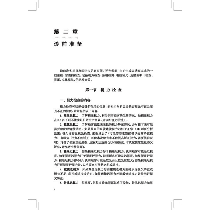 眼视光门诊视光师手册的读者对象为眼视光门诊(俗称“视光中心”)的视光师。内容基本囊括眼视光门诊的日常业务范畴,包括视光师定义与职责、问诊、眼视光门诊相关检查(屈光检查、特殊检查等)、儿童屈光发育档案、儿童配镜处方原则、眼镜加工质检、低视力相关内容等。