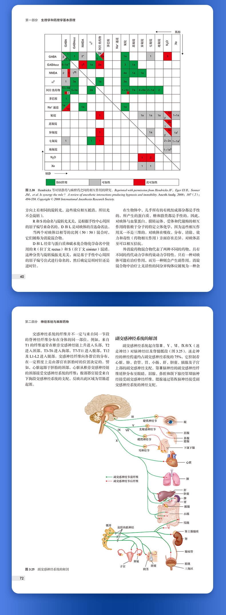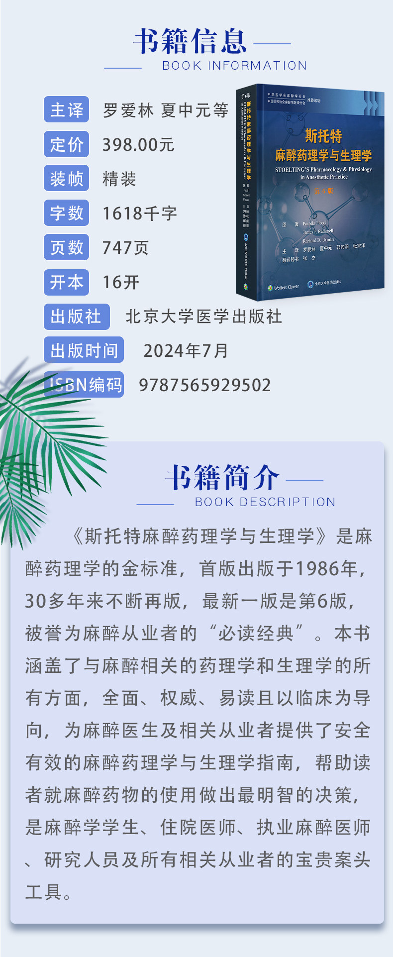 这本书由美国著名的麻醉药理学专家Robert K. Stoelting教授于1999年首次出版,二十多年来不断再版,目前的最新版本是第六版。本书系统、全面、权威、实用,是一本世界级麻醉药理学和生理学教材。从基础原理到各个器官系统,本书详细介绍了所有与麻醉实践直接或间接相关的药理学和生理学方面,涵盖了吸入性麻醉药、静脉性镇静催眠药、局部麻醉药、阿片类药物、非阿片类镇痛药、神经肌肉阻滞剂、抗胆碱能药物、心血管药物、呼吸系统药物、电解质平衡调节药物、内分泌药物、肝脏和胃肠道药物、血液和凝血系统药物、免疫系统药物、抗菌药物和化疗药物等。本书不仅阐述了各种药物的作用机制、药代动力学、药效动力学、剂量选择、不良反应等基本知识,还结合了大量的临床案例和最新的循证医学证据,讨论了各种药物在不同情况下的应用策略和注意事项,具有全面、系统的临床指导意义。本书还配有精美的彩色插图和表格,帮助读者更好地理解和记忆重点内容。