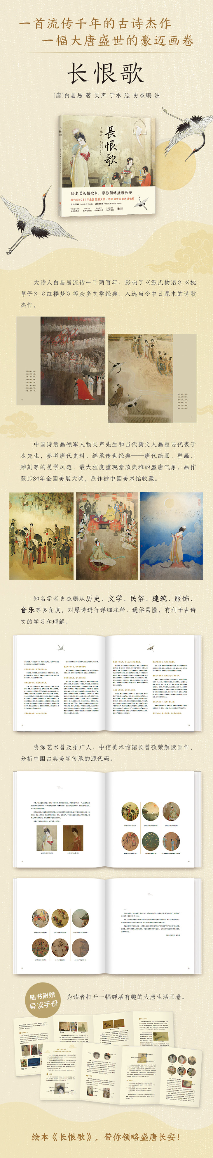 《长恨歌》是唐代大诗人白居易流传一千两百年,影响了《源氏物语》《枕草子》《红楼梦》等众多文学经典的诗歌杰作,讲述了唐玄宗和杨贵妃的传奇故事。本书由国画家吴声、于水绘制,绢本设色,工笔重彩,直追唐人笔意,传承中国“诗意画”的美学传统,以细腻精致的设色笔调表现了豪迈典雅的唐风,极具艺术价值,画作曾获全国美展大奖,原作被中国美术馆收藏。学者、作家史杰鹏作注,从历史、文学、民俗、建筑、服饰、音乐等多个角度,对原诗进行详细的解释,较全面地展示了当时的历史画面,有利于读者对古诗文的理解和学习。艺术普及推广人、中信美术馆馆长曾孜荣从中国“诗画共读”的传统出发,解析画作与唐朝、五代、宋朝等时期留存下来的传世名画、壁画的密切关系,让读者发现古典艺术的源代码与文化DNA。