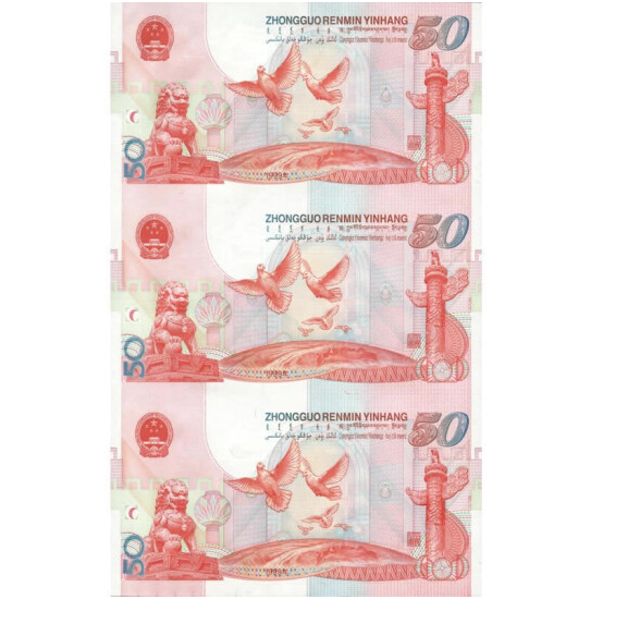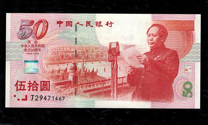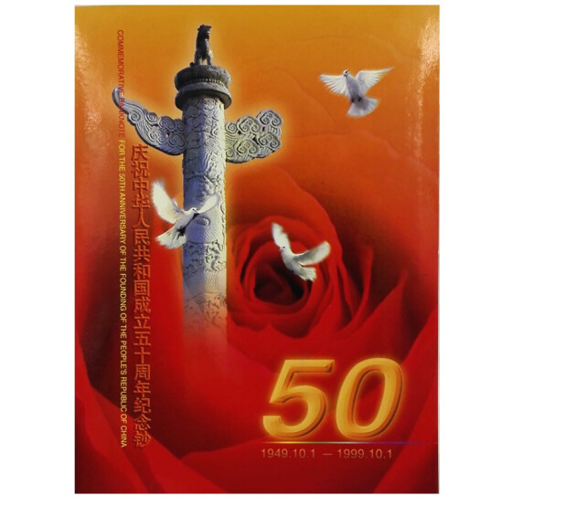 为纪念中华人民共和国建国五十周年,中国人民银行自1999年9月20日起,面向全国发行“中华人民共和国成立五十周年”纪念钞,这是中国首次发行纪念钞。与现行人民币等值流通,这是我国第一次发行纪念钞,这钞主题鲜明,寓意深刻,技术高超,代表了我国钞票设计和印制的最高水平。