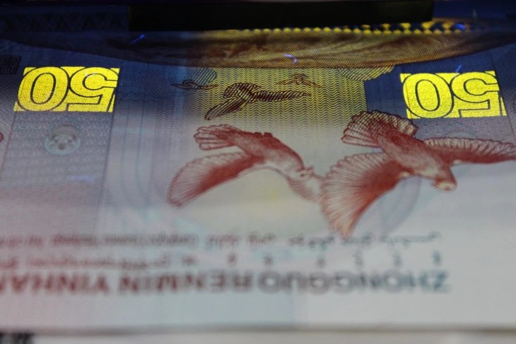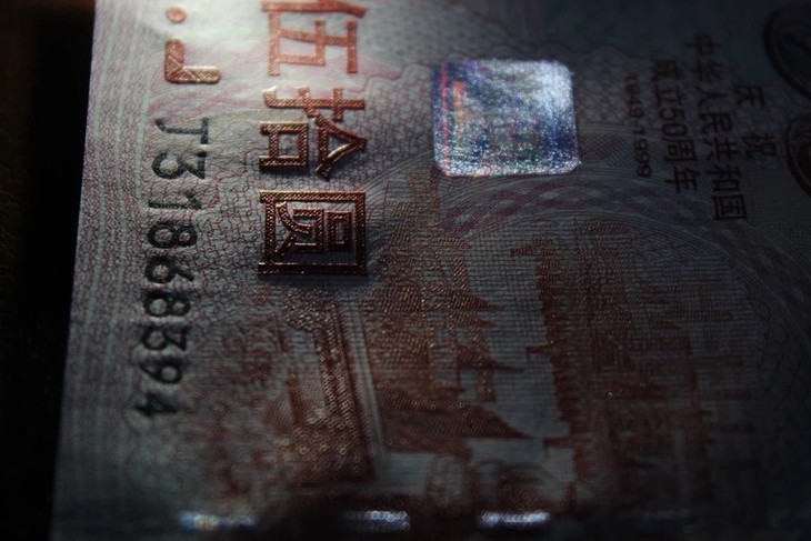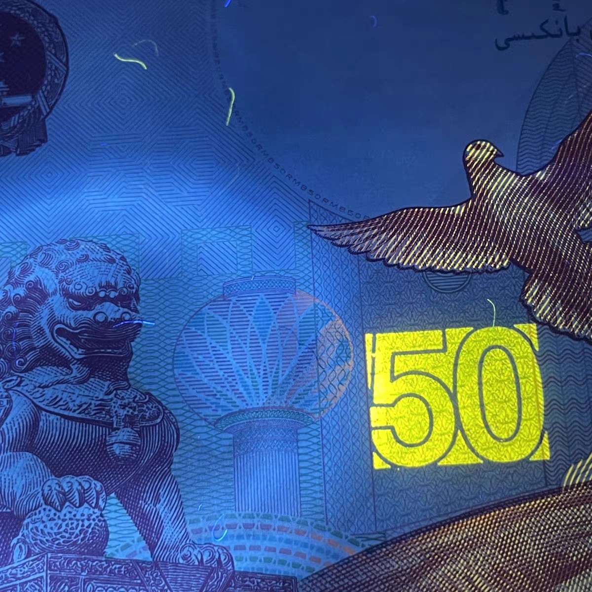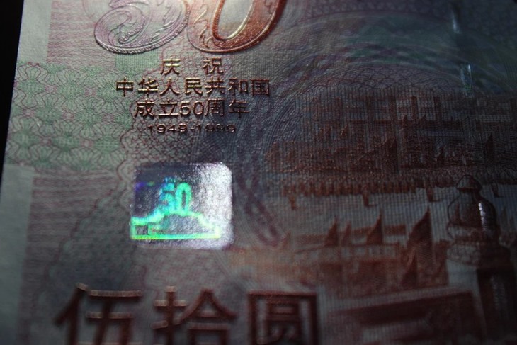 钞纸中分布不规则红蓝纤维丝;左侧贴有动态全息防伪标志;话筒上部有侧面天安门全景固定水印;右下角采用光变油墨印制面额数字50,在不同的角度看就会有颜色的变化;右上角有隐形面额数字,当眼睛与票面平行时,迎着光能看到50的字样。