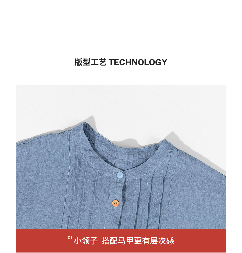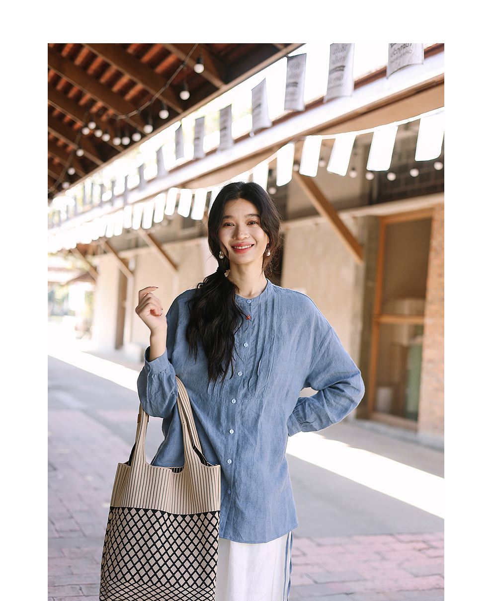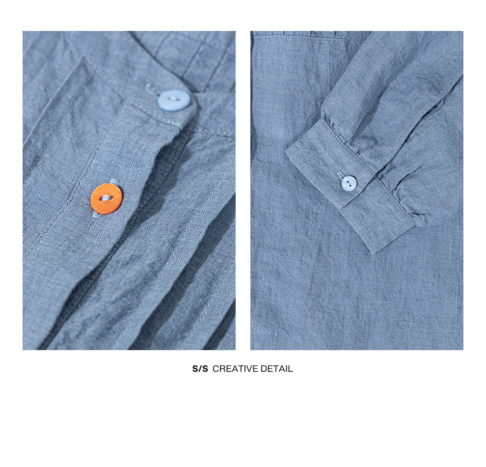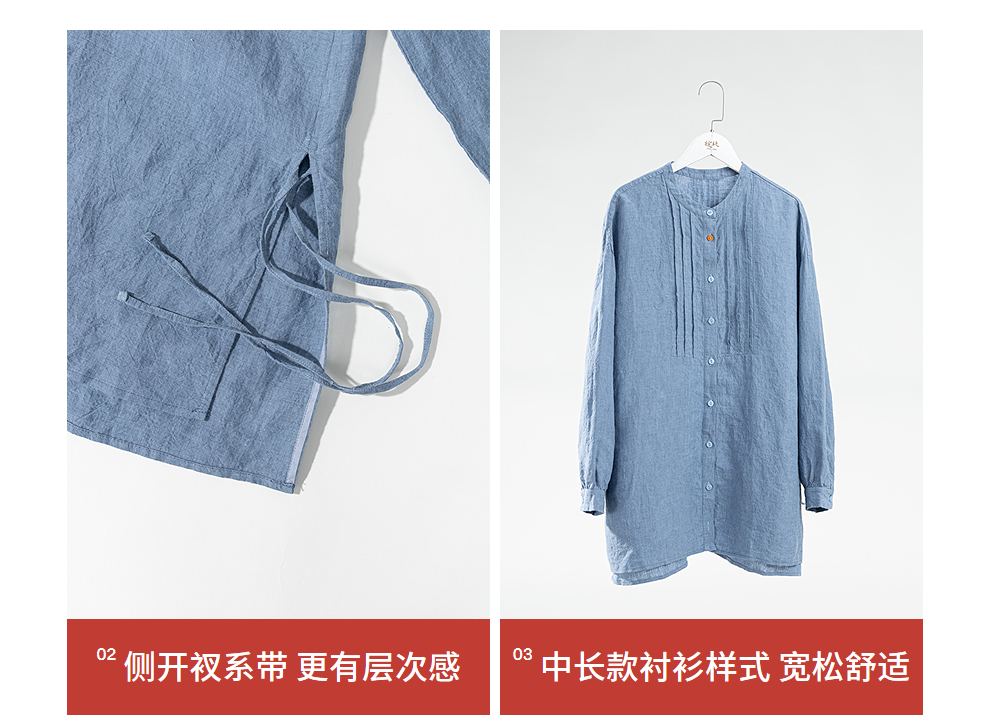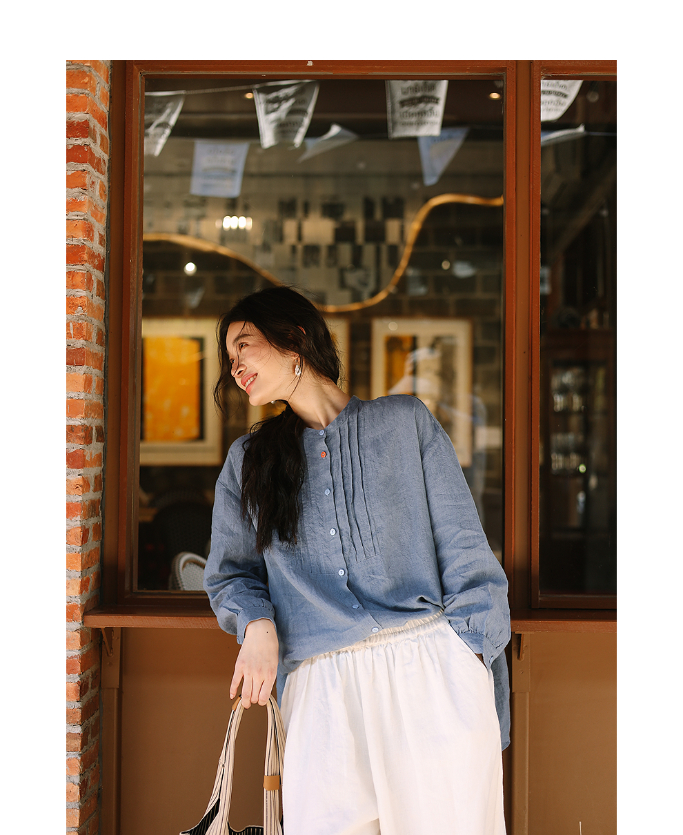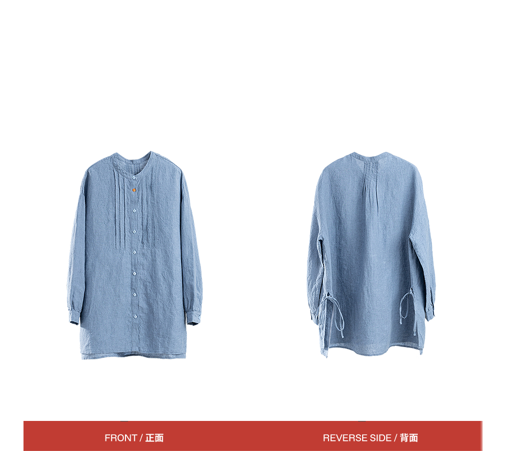 绽放093朵/蓝鲸衬衫高端酵磨洗色织亚麻细塔克侧开衩中长款上衣