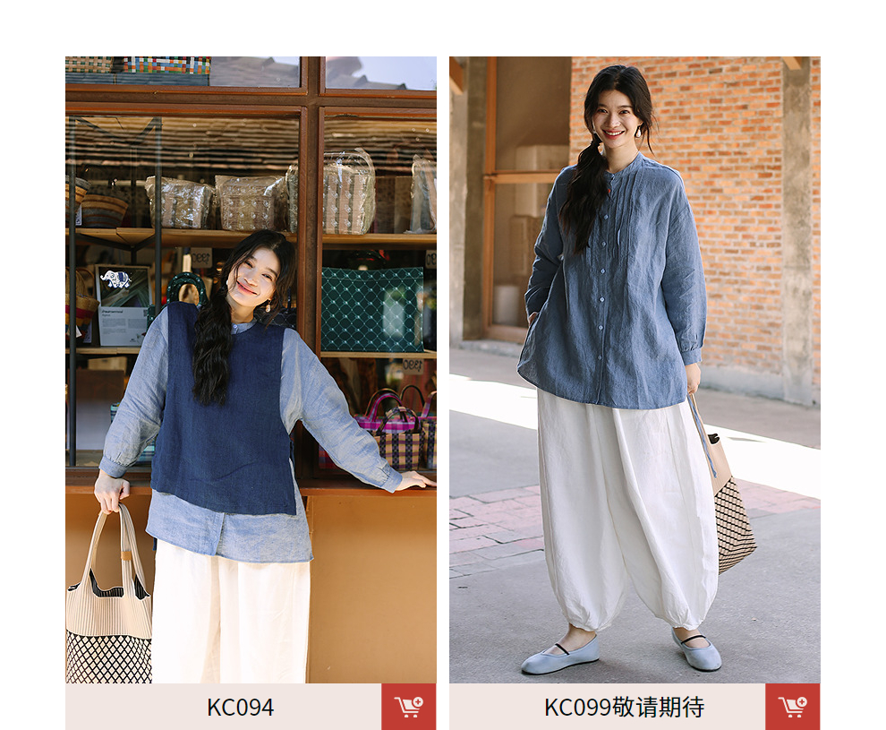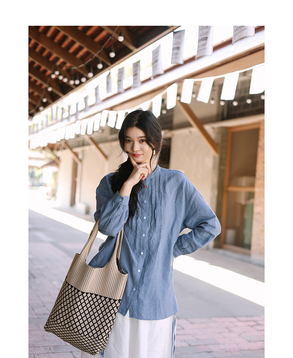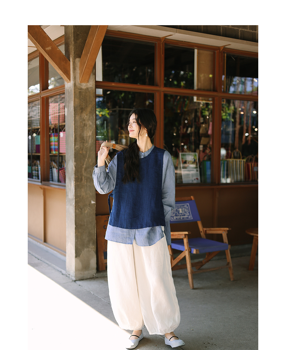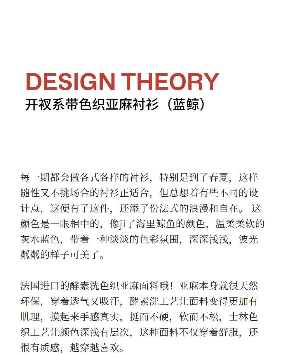 绽放093朵/蓝鲸衬衫高端酵磨洗色织亚麻细塔克侧开衩中长款上衣