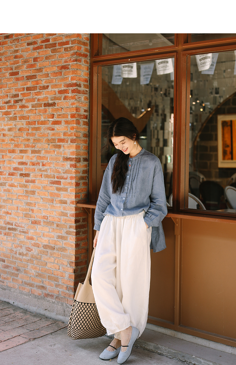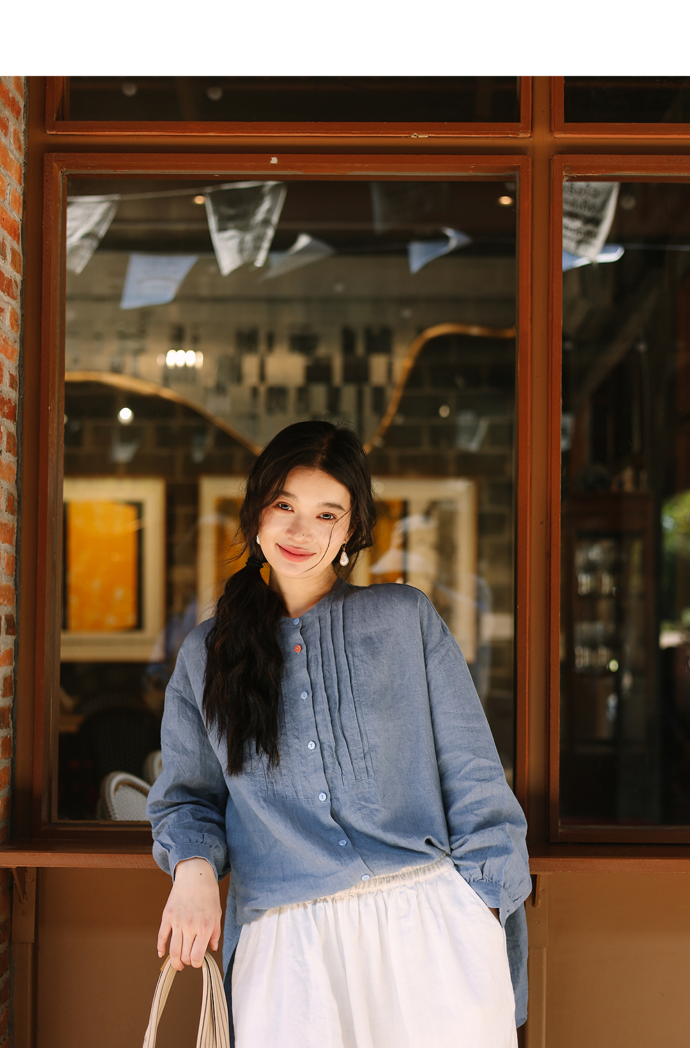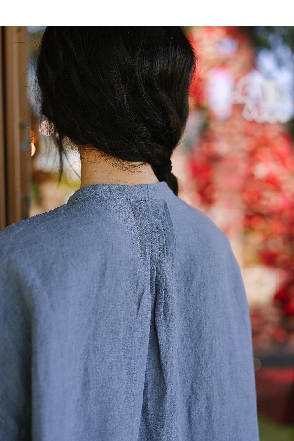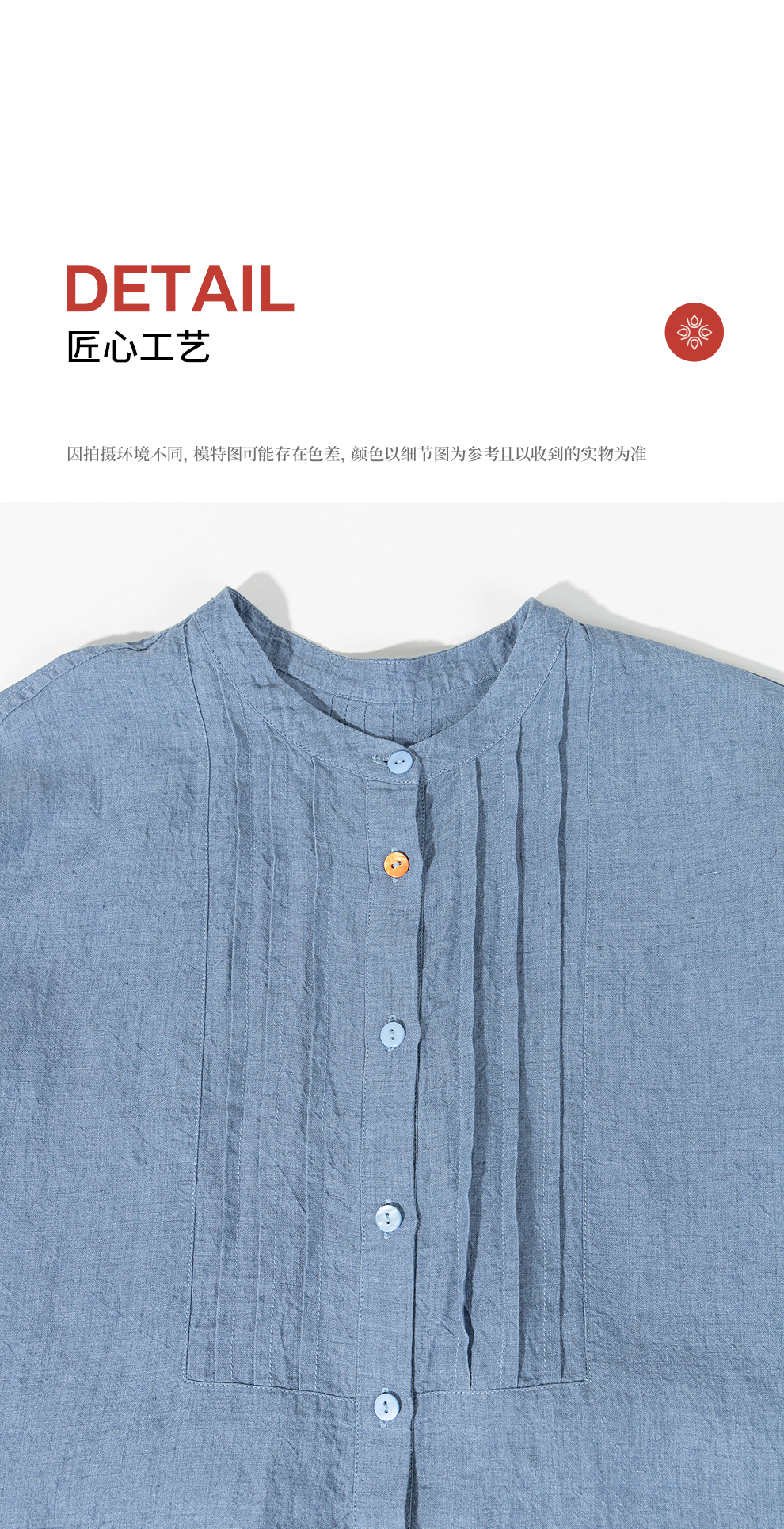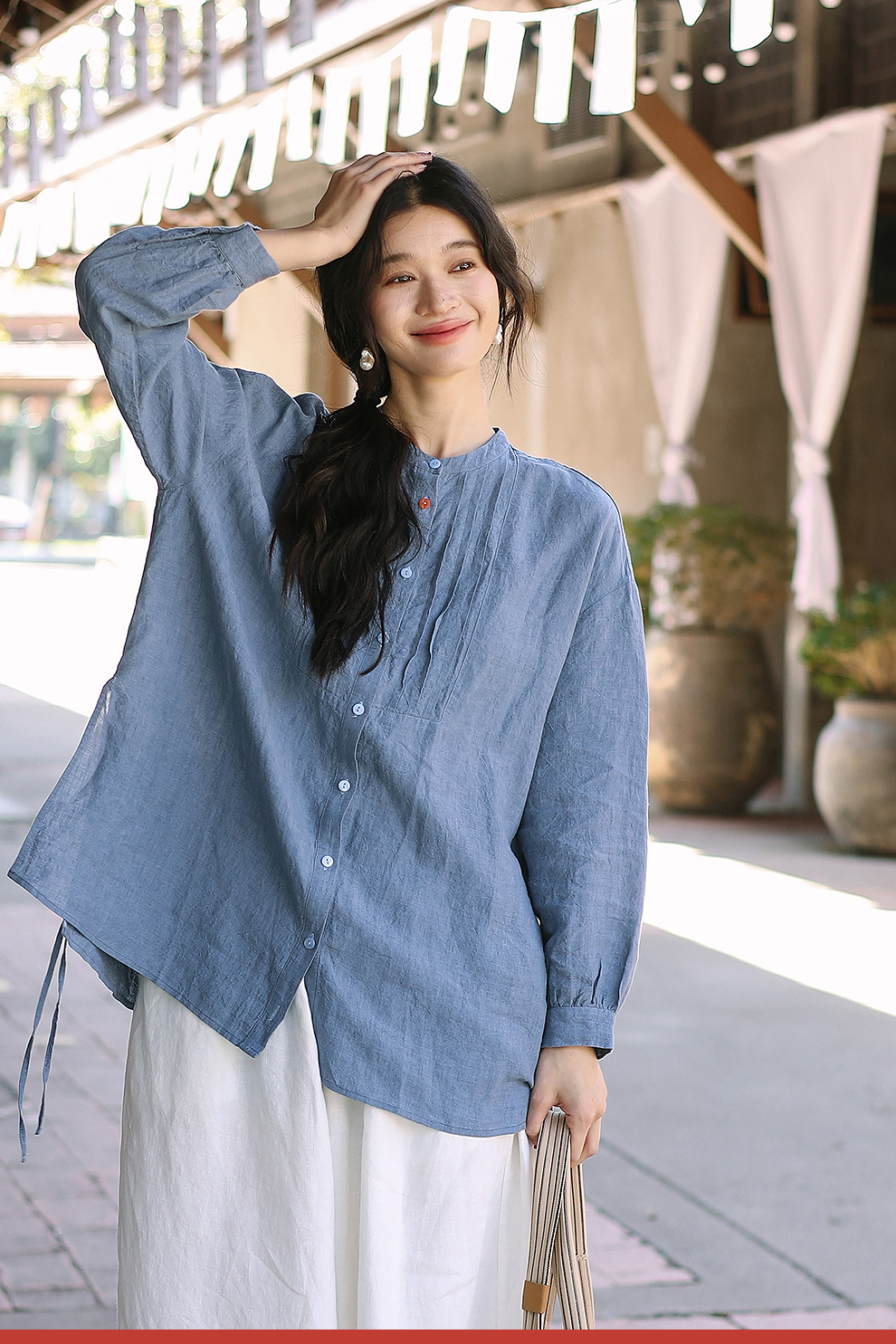 绽放093朵/蓝鲸衬衫高端酵磨洗色织亚麻细塔克侧开衩中长款上衣