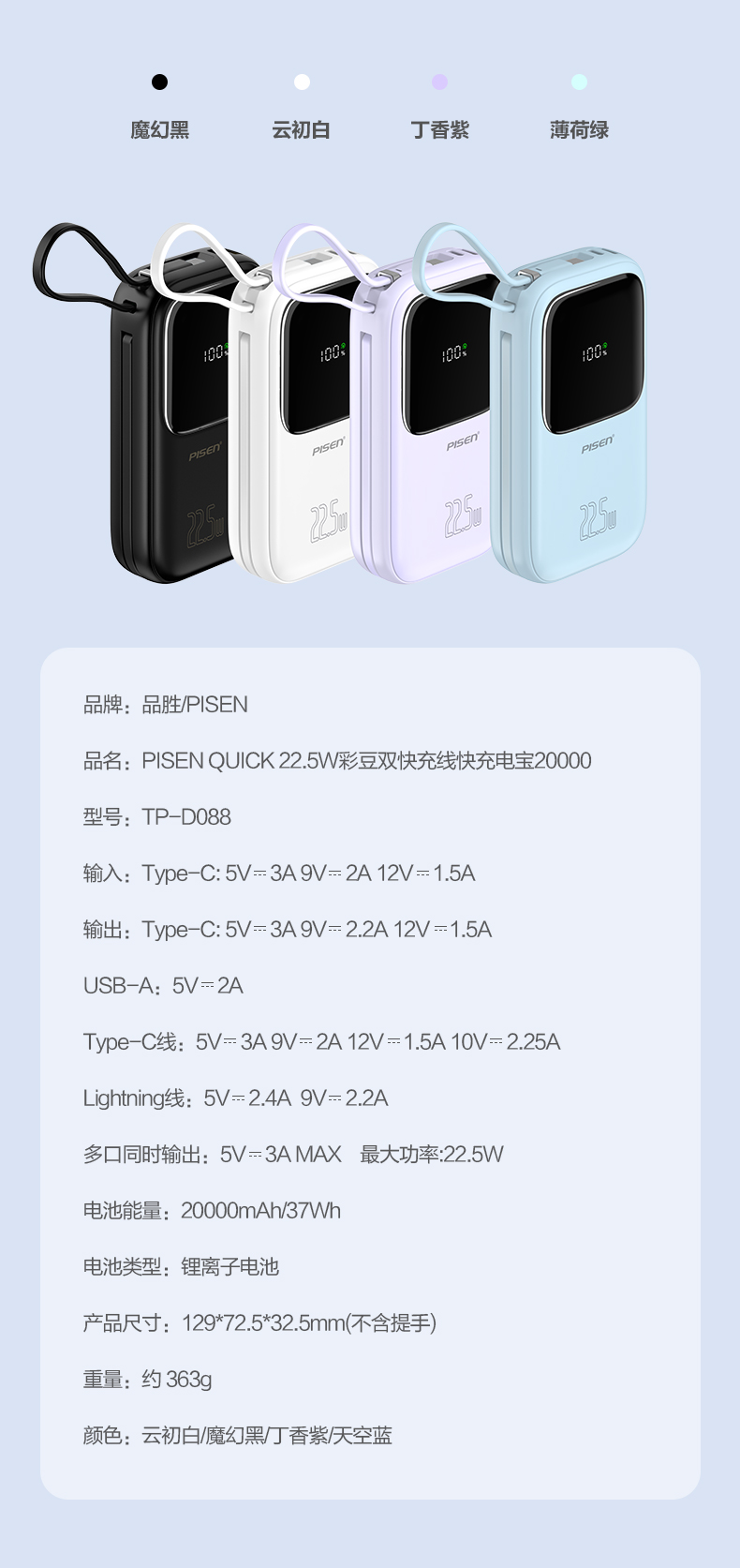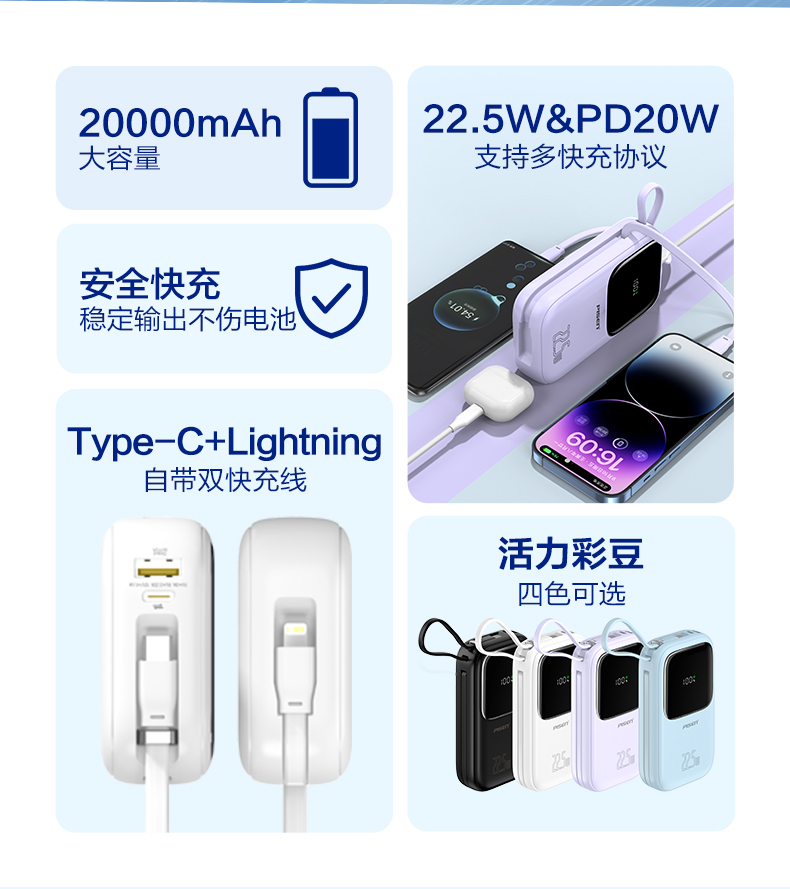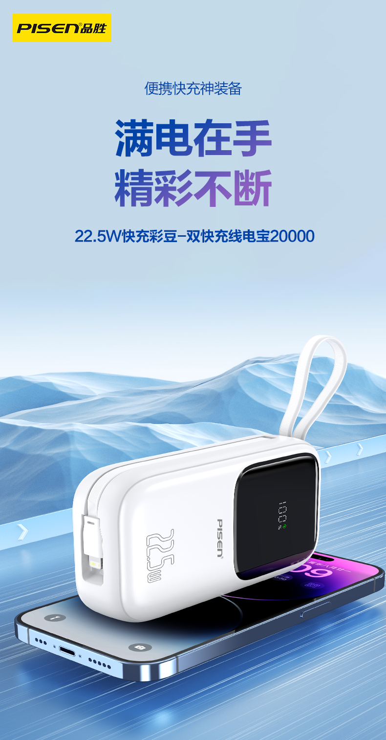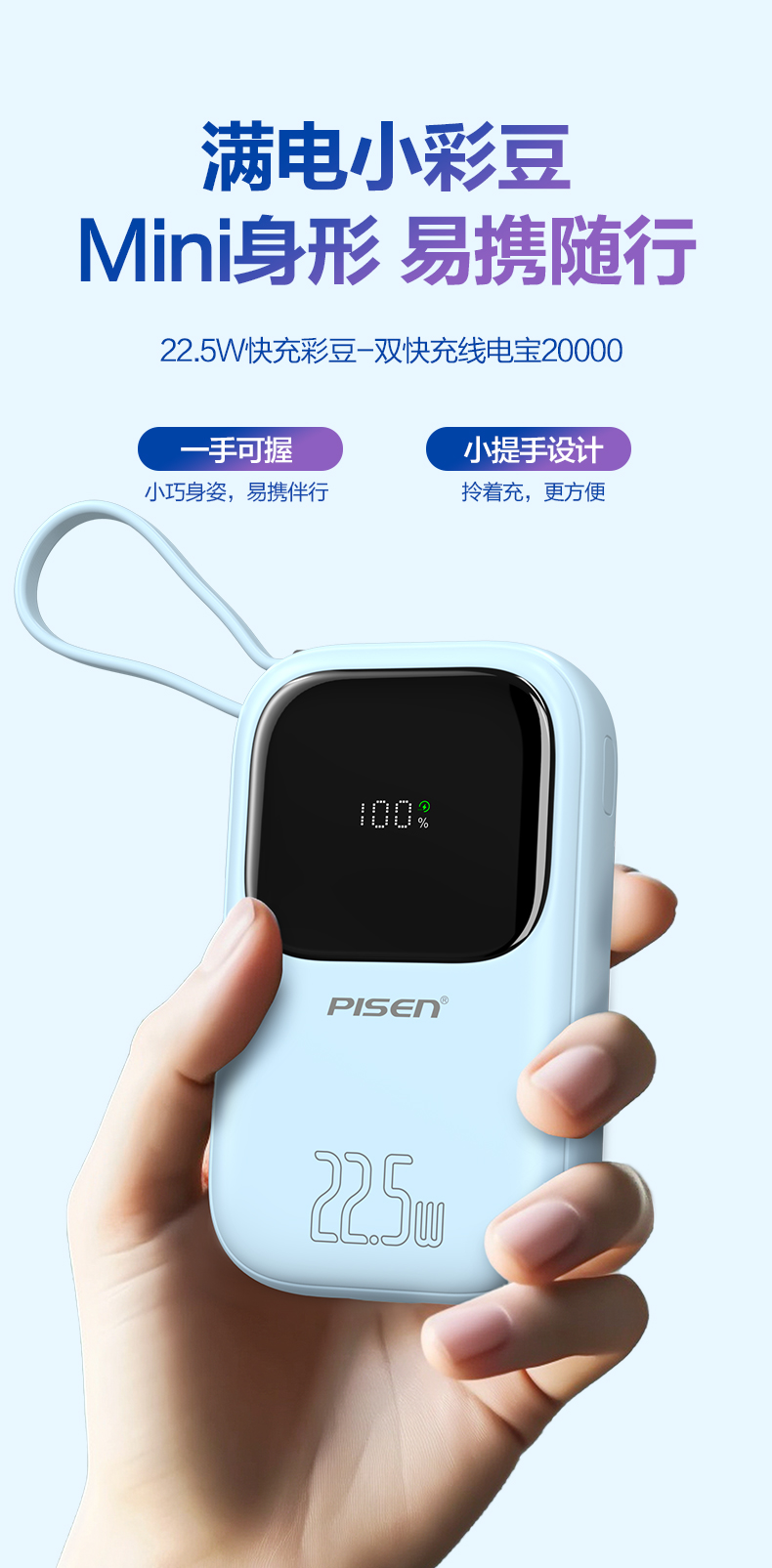 品胜 22.5W 彩豆双快充线快充电宝20000毫安/10000毫安 支持PD快充迷你挂绳移动电源