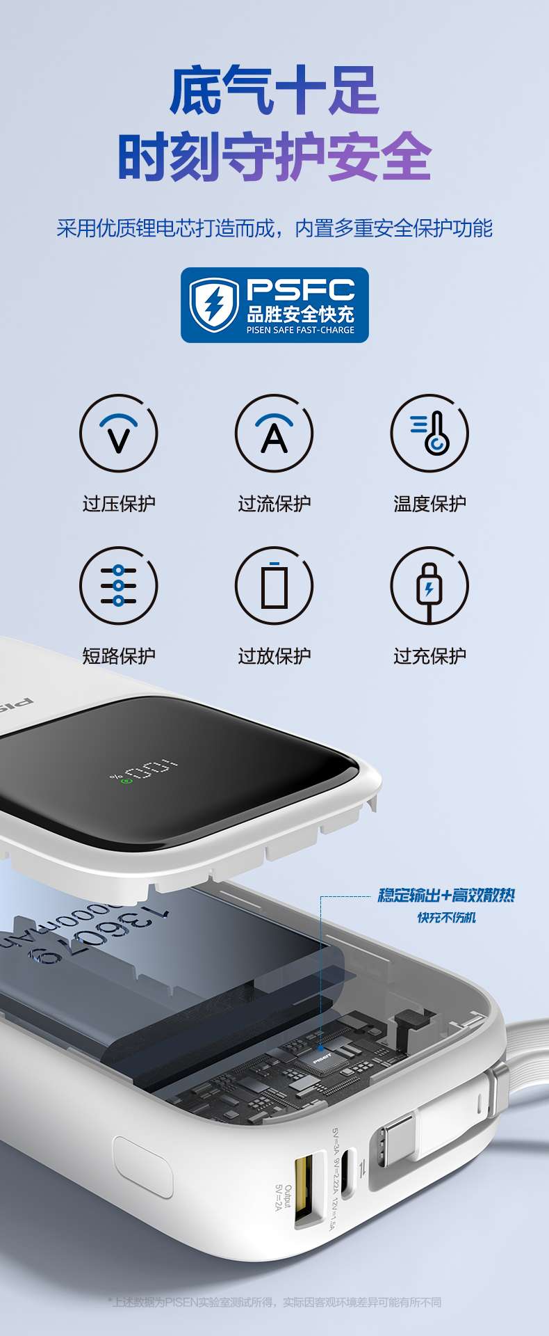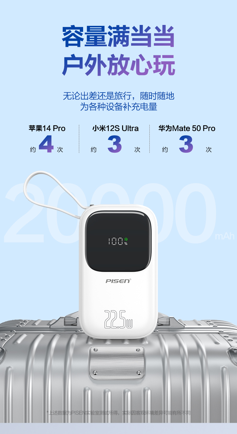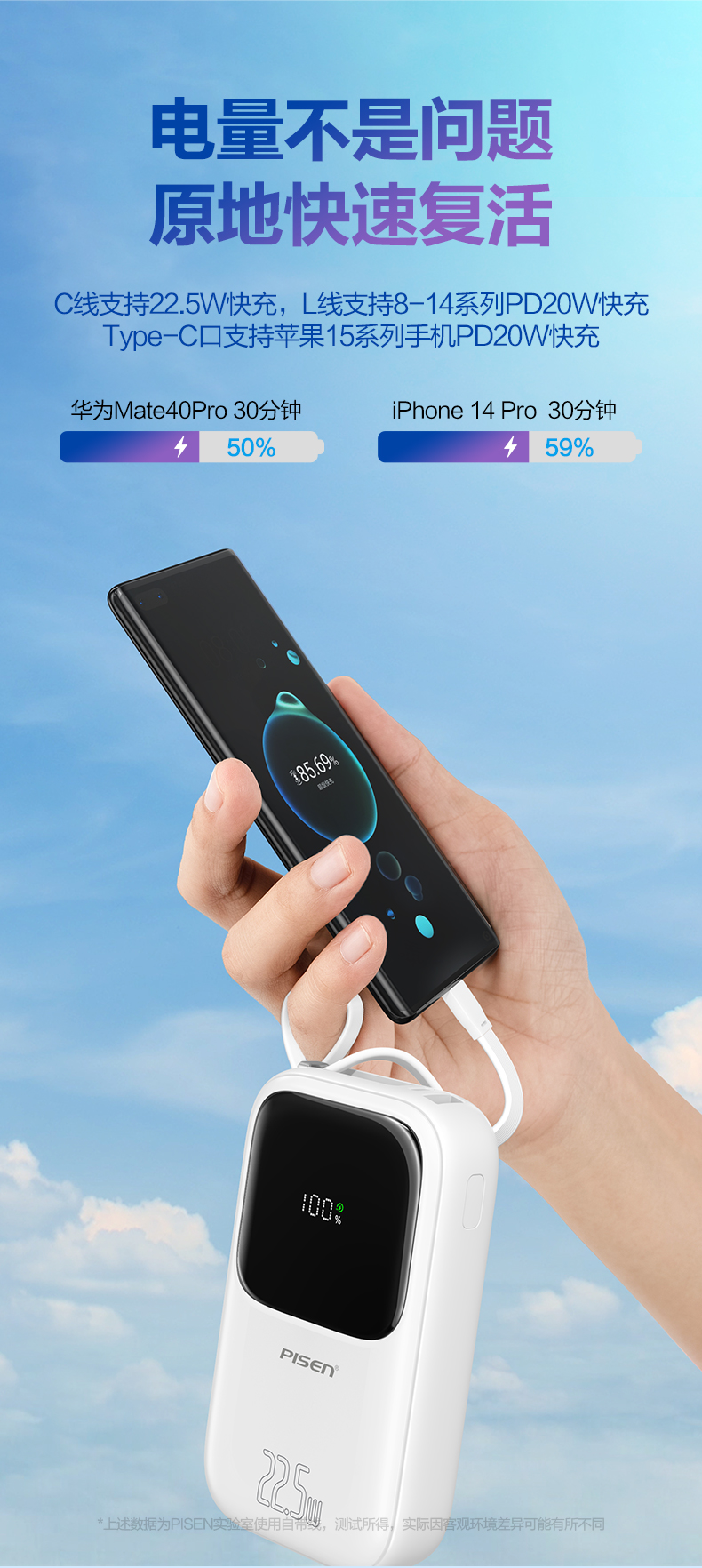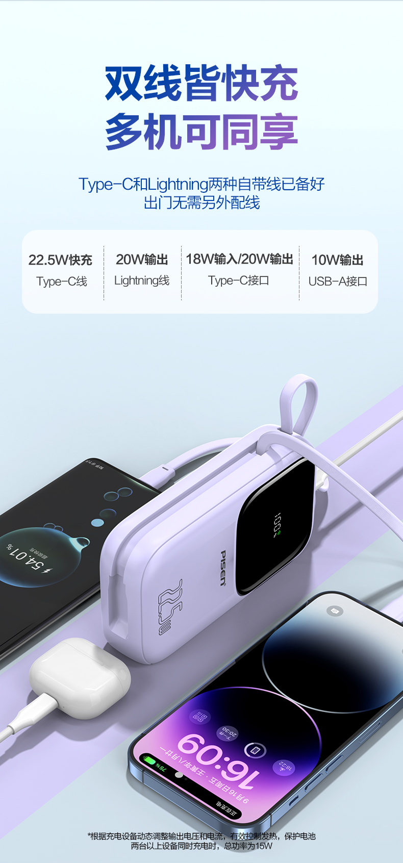 品胜 22.5W 彩豆双快充线快充电宝20000毫安/10000毫安 支持PD快充迷你挂绳移动电源