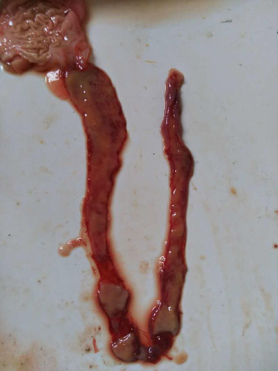 1.养殖的叉尾鮰肠道出现如图所示的症状,则该鱼患有(B)