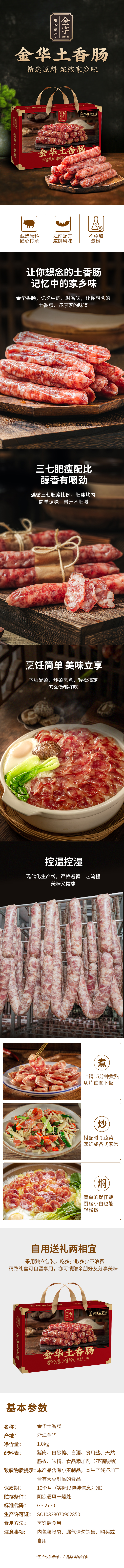 金字金华土香肠礼盒1kg传统粗根纯猪肉土香肠咸甜糖酒味腊肠年货