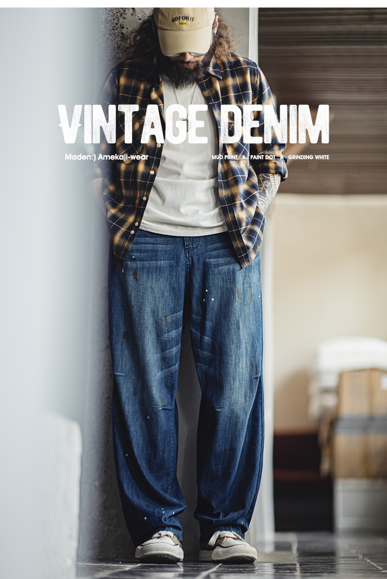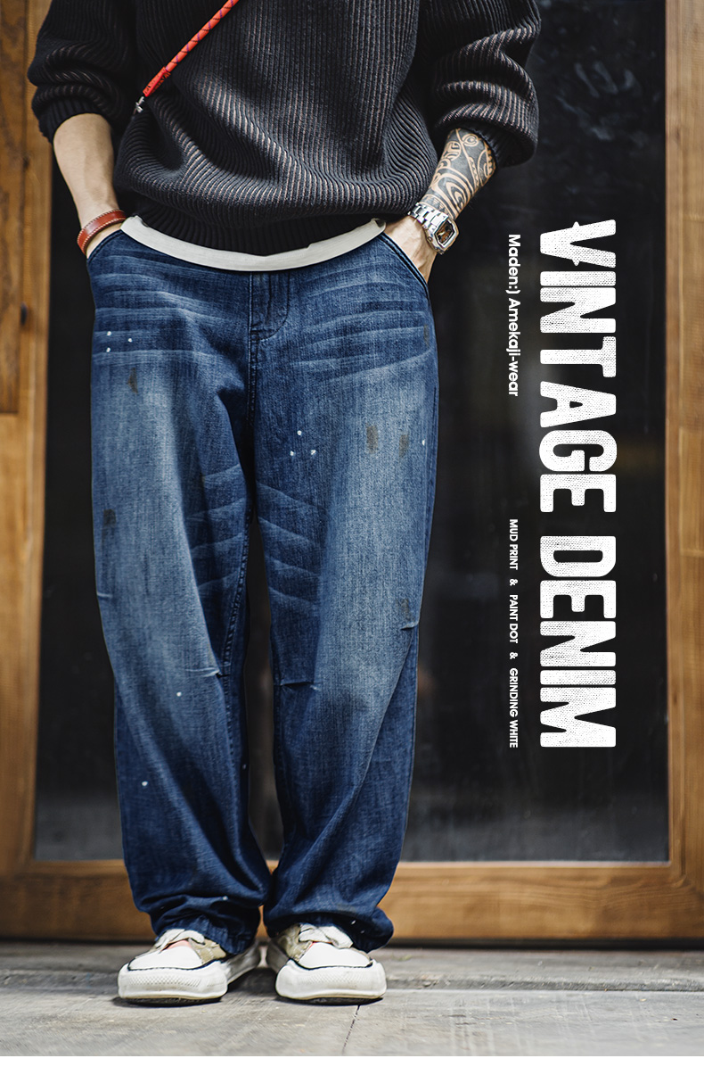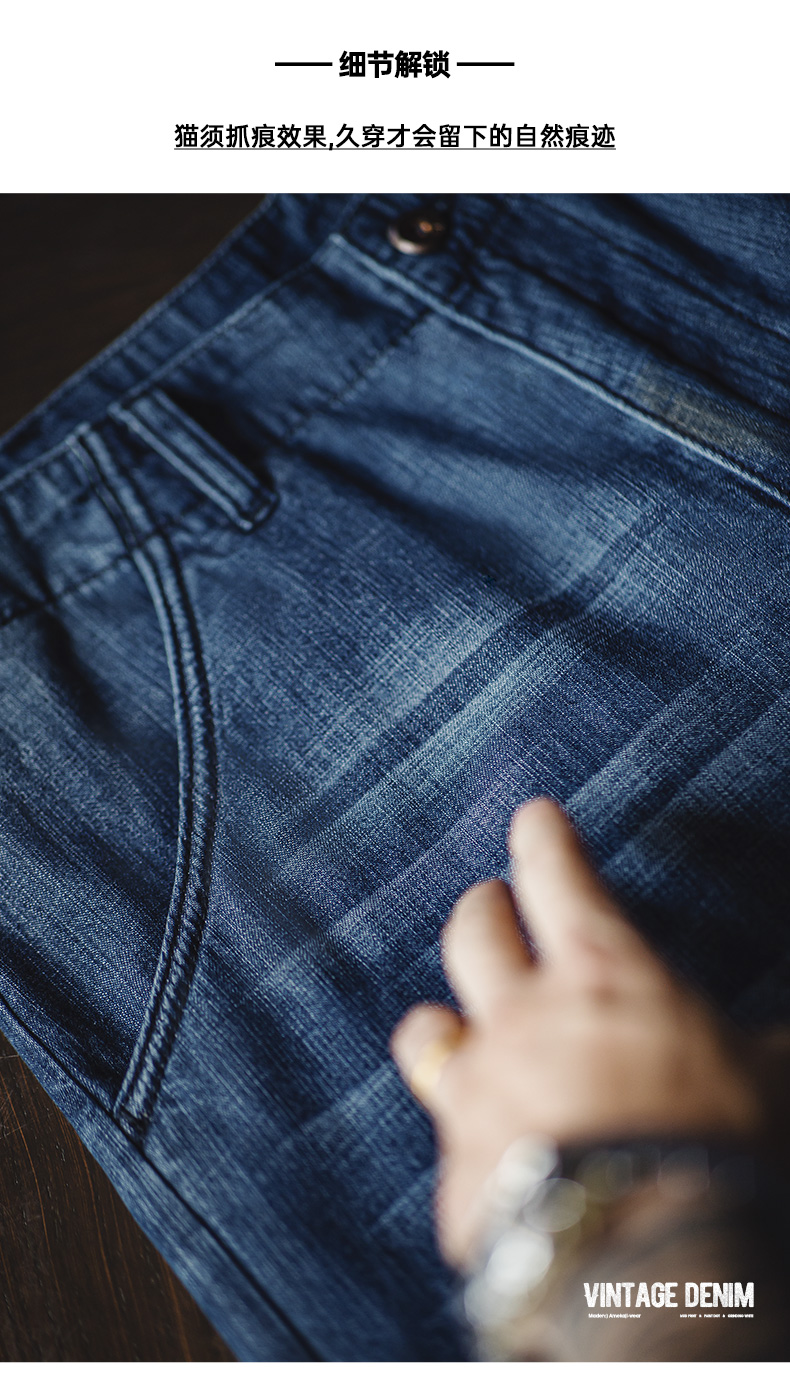 工装优选美式复古做旧磨白猫须牛仔裤宽松水洗丹宁泼墨直筒裤男秋