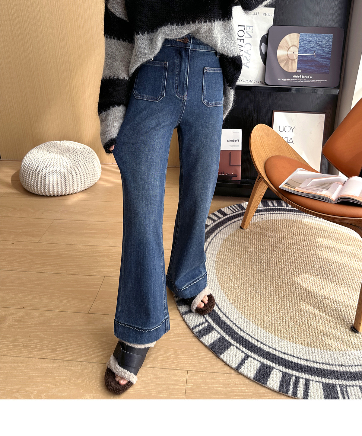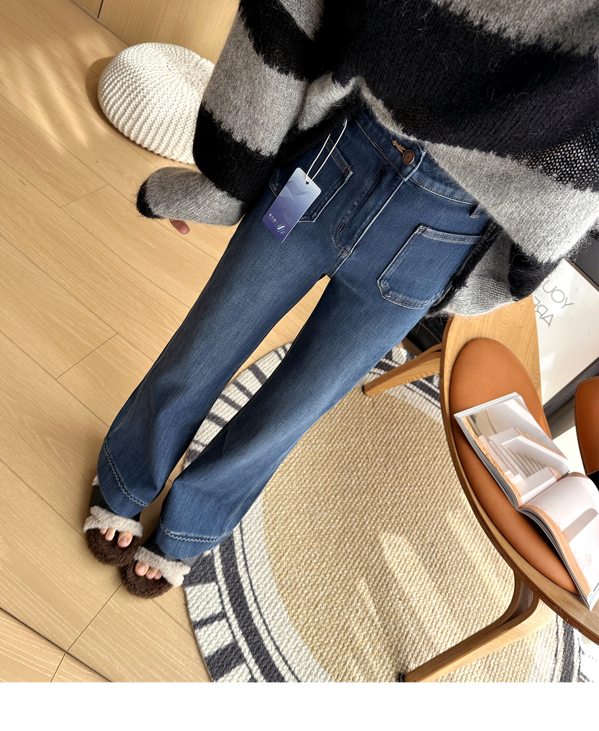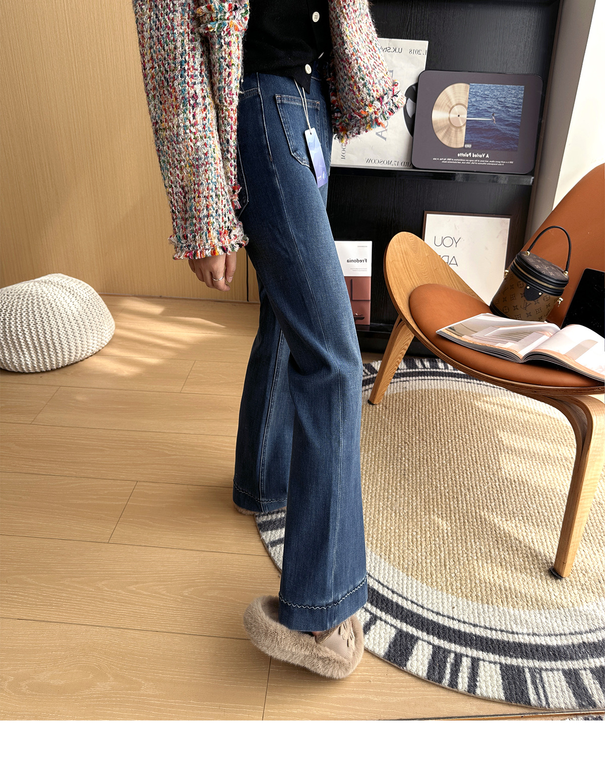 膝盖以下微微散开的裤脚恰到好处地修饰腿型