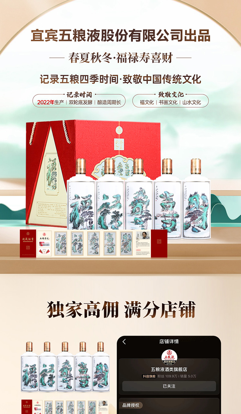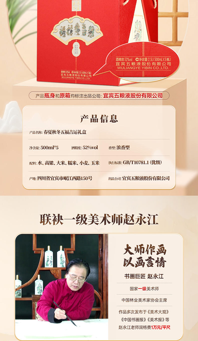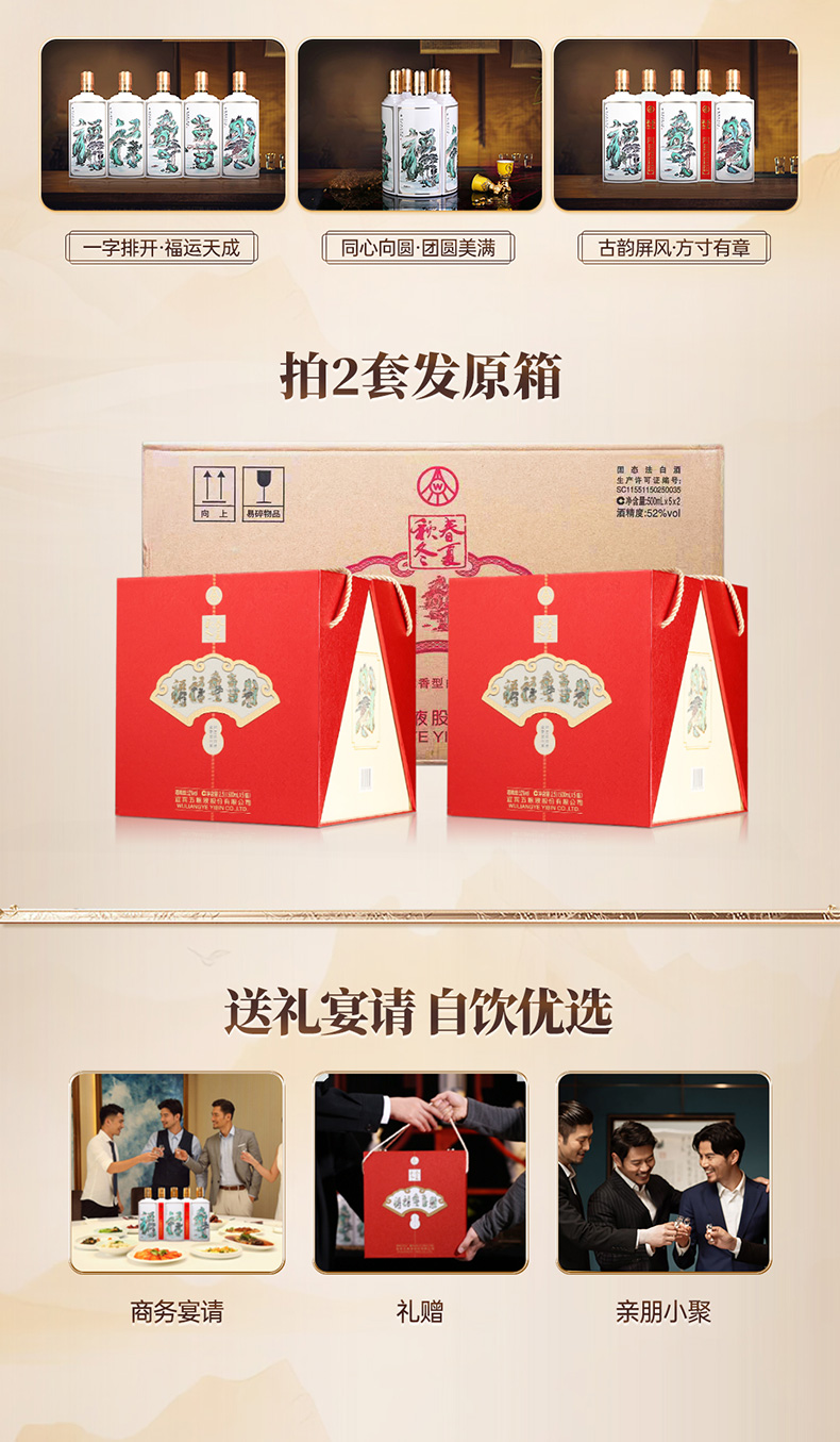 春夏秋冬五福吉运酒 五粮液股份出品52度白酒500ml*5瓶
