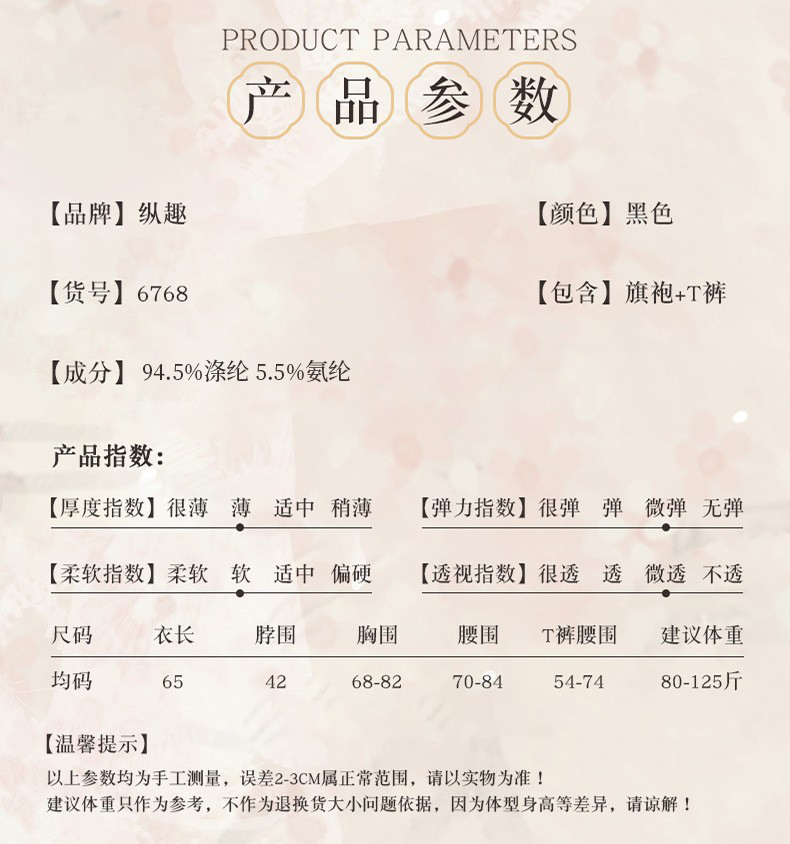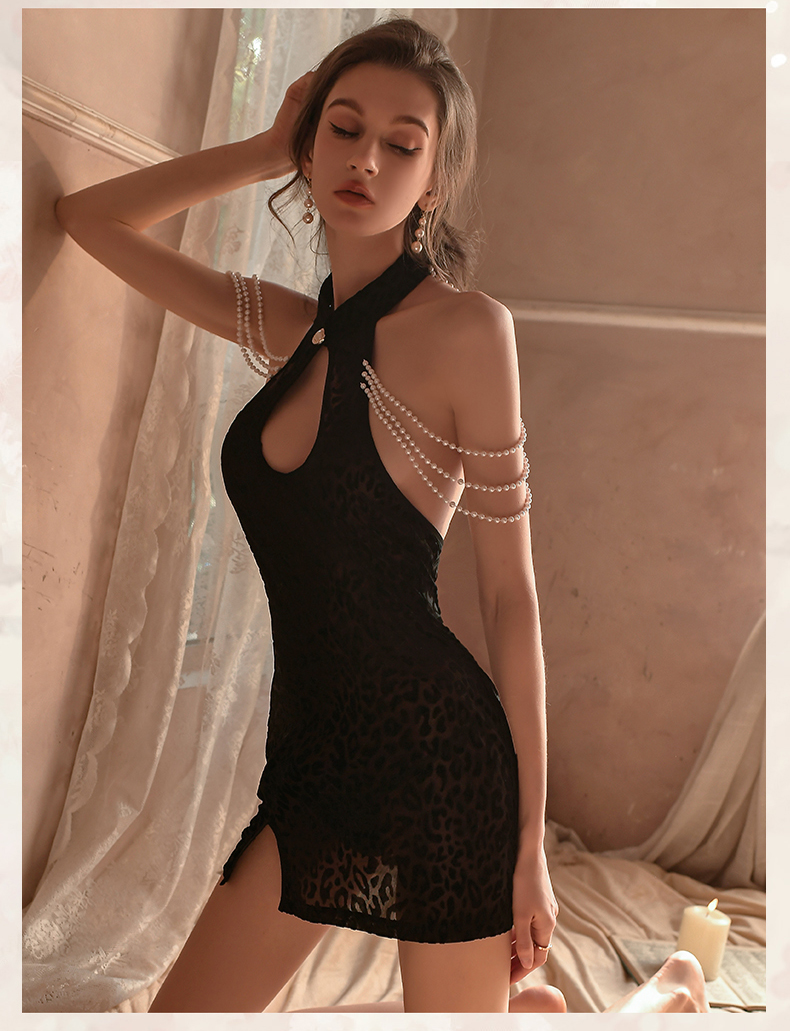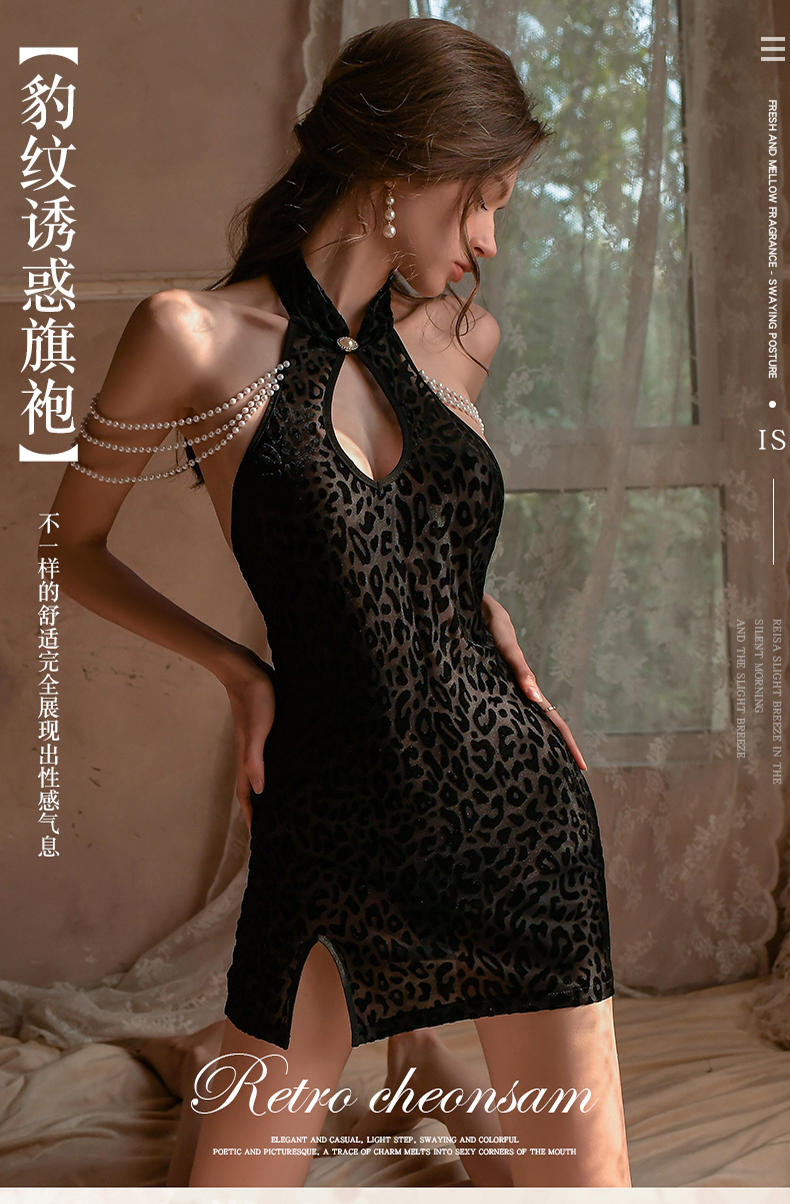 【性感睡裙】黑色豹纹诱惑旗袍珍珠露背睡裙 新中式纯欲诱惑性感甜美情趣内衣睡衣6768