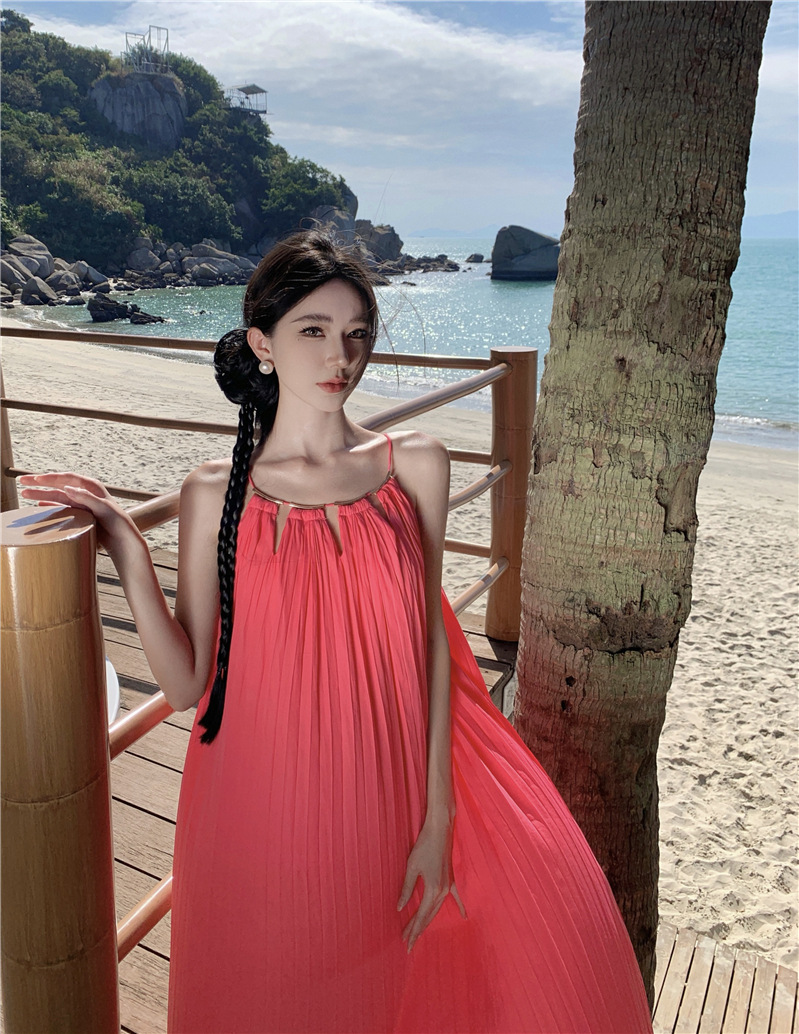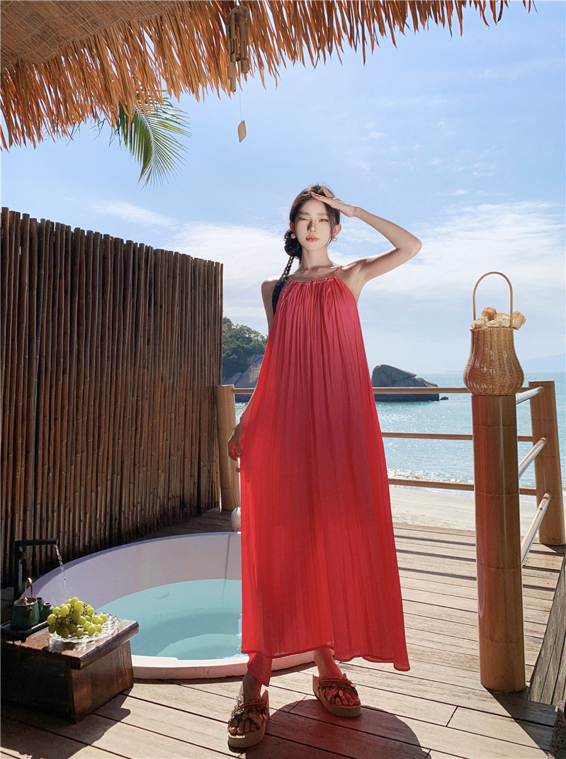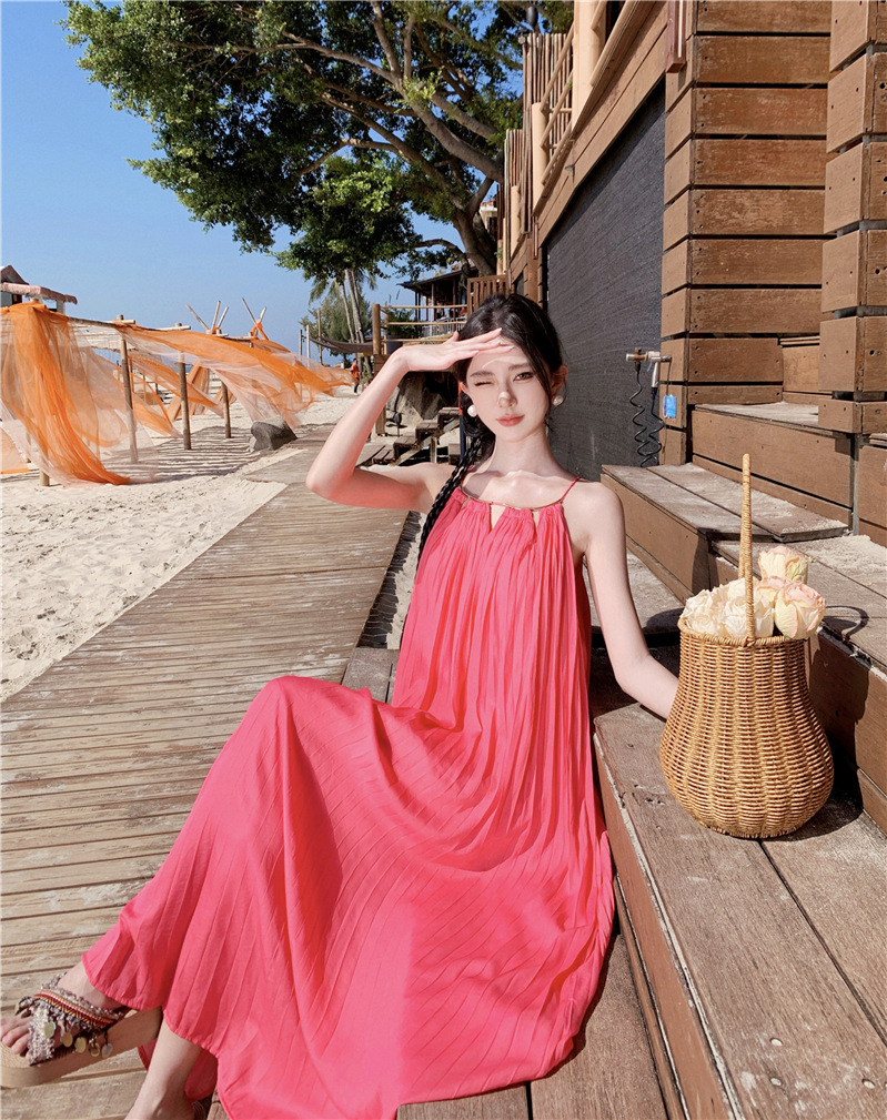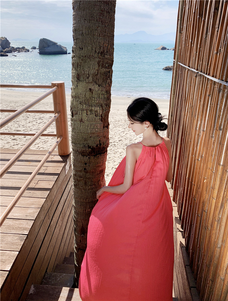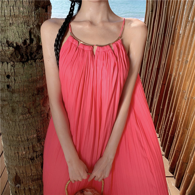 【法式轻奢系列!高级感挂脖连衣裙】多巴胺海边,挂脖性感度墙裂推荐,法式过膝长裙压褶大摆连衣裙,波西米亚海边度假中长裙L