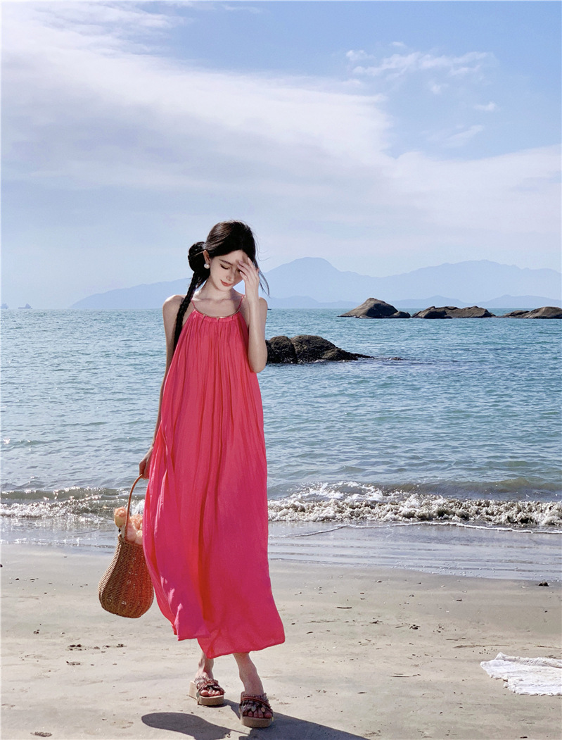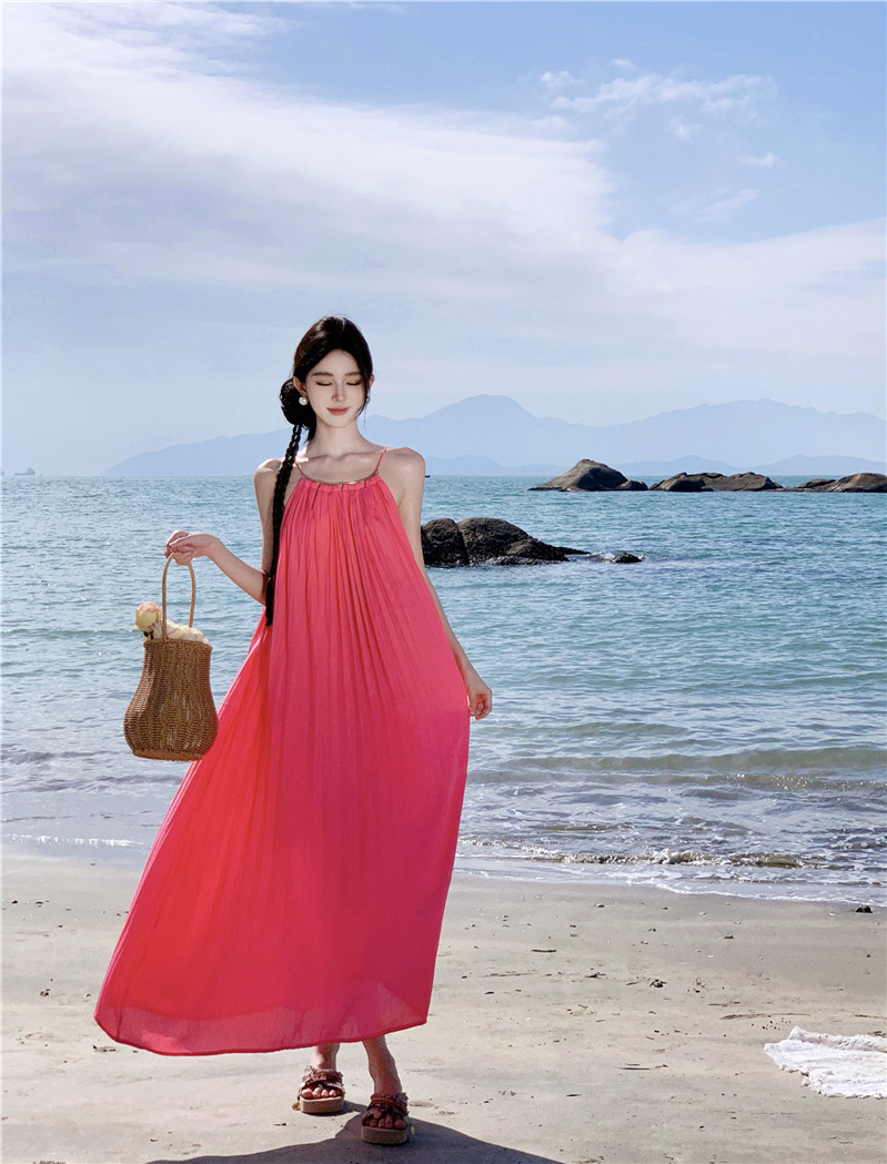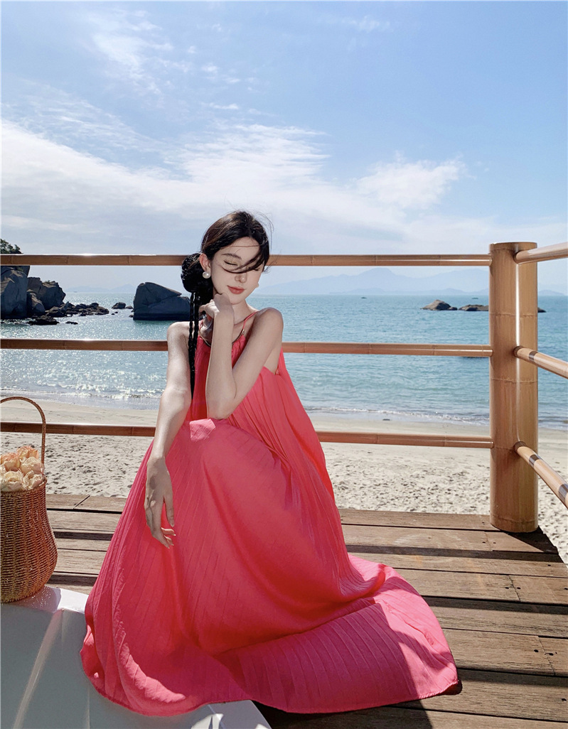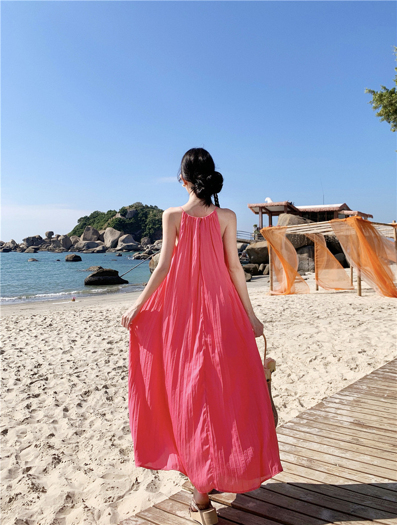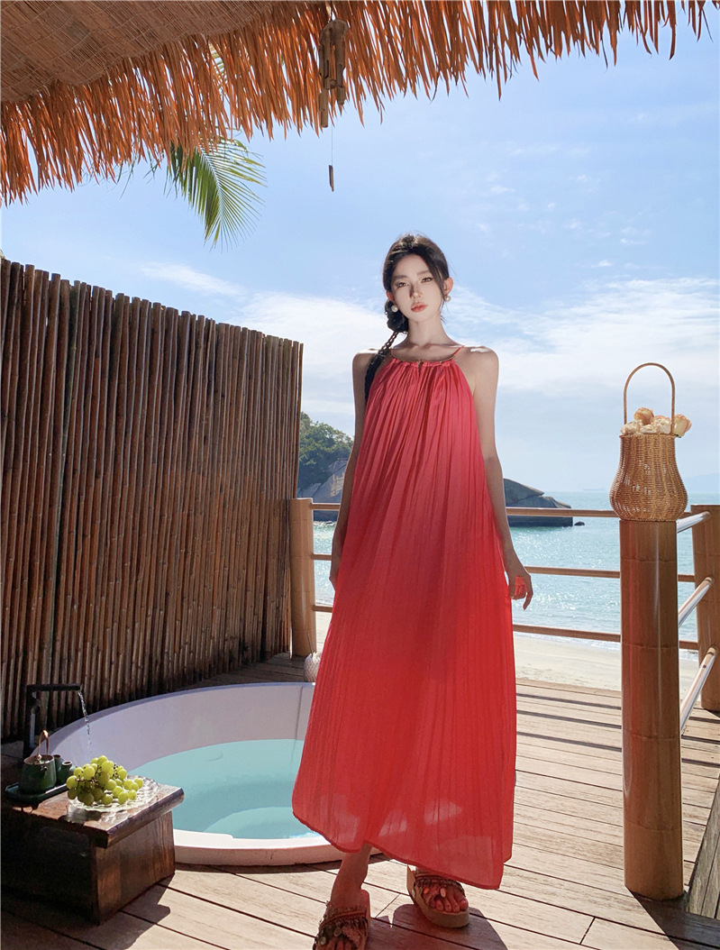 【法式轻奢系列!高级感挂脖连衣裙】多巴胺海边,挂脖性感度墙裂推荐,法式过膝长裙压褶大摆连衣裙,波西米亚海边度假中长裙L