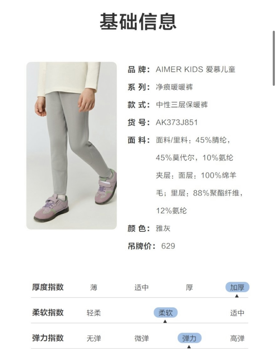 【春上新】8楼爱慕儿童Aimer Kids中性净痕暖暖裤三层保暖裤AK373J851,吊牌价629元