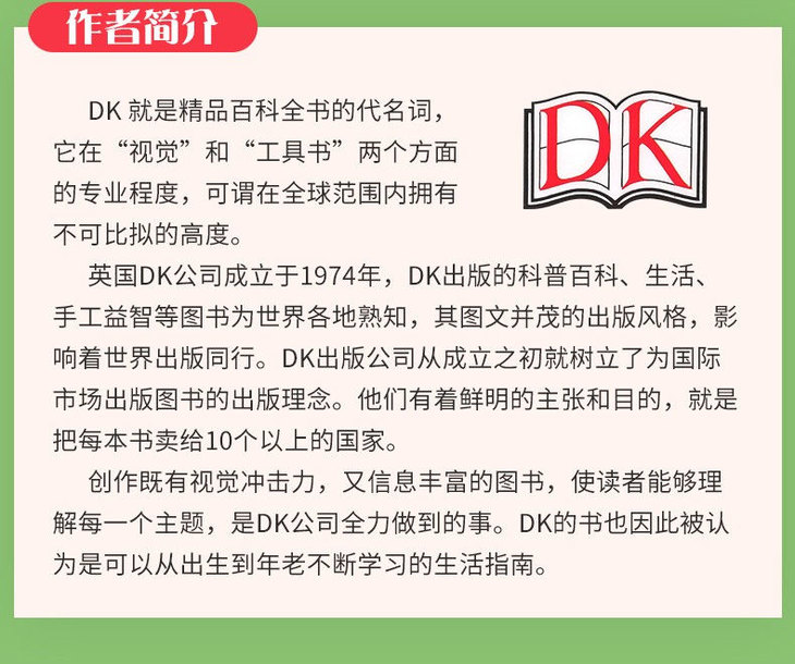 英国DK公司成立于1974年,DK出版的科普百科、生活、手工益智等图书畅销全球,其图文并茂的出版风格,影响着世界出版同行。DK出版公司从成立之初树立了为国际市场出版图书的出版理念。他们有着鲜明的主张和目的,把每本书卖给10个以上的国家。
