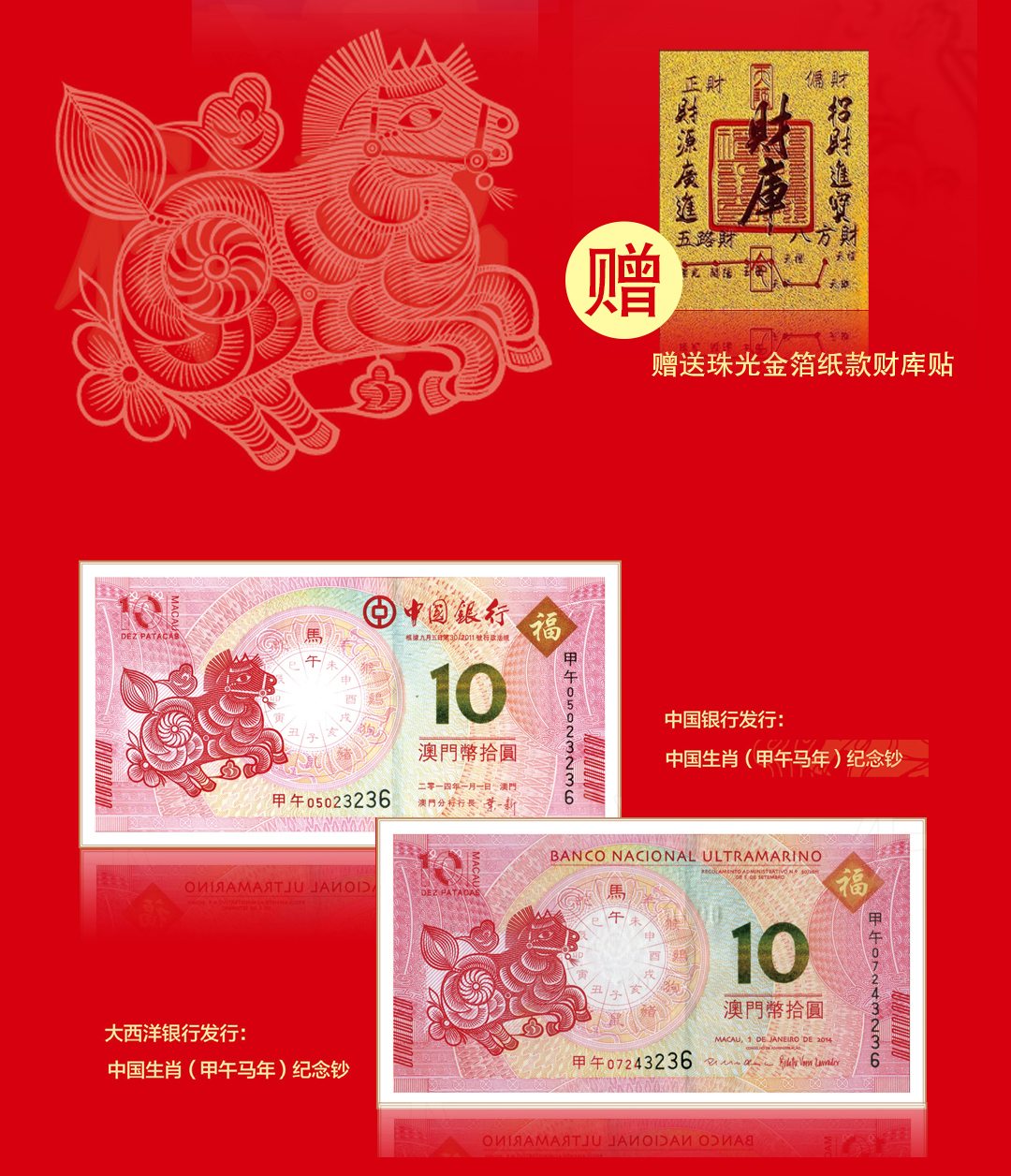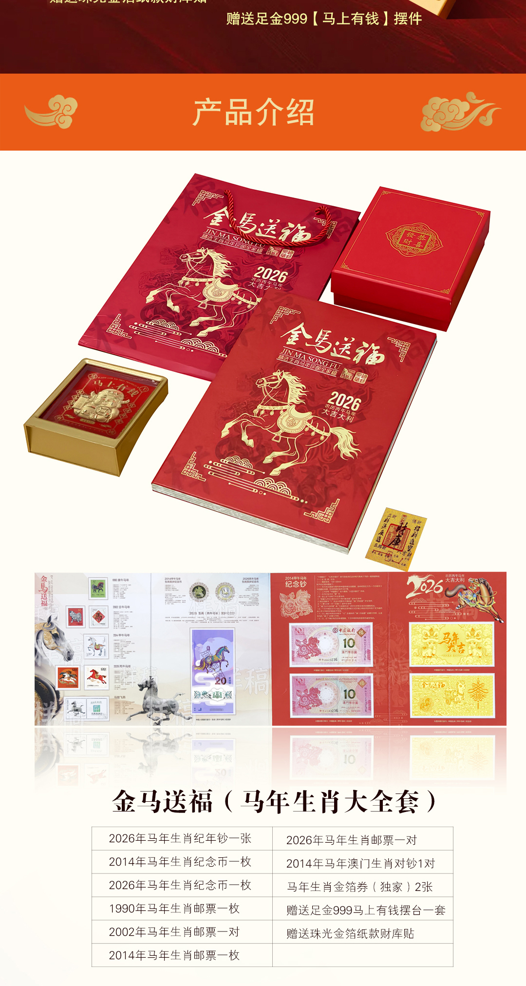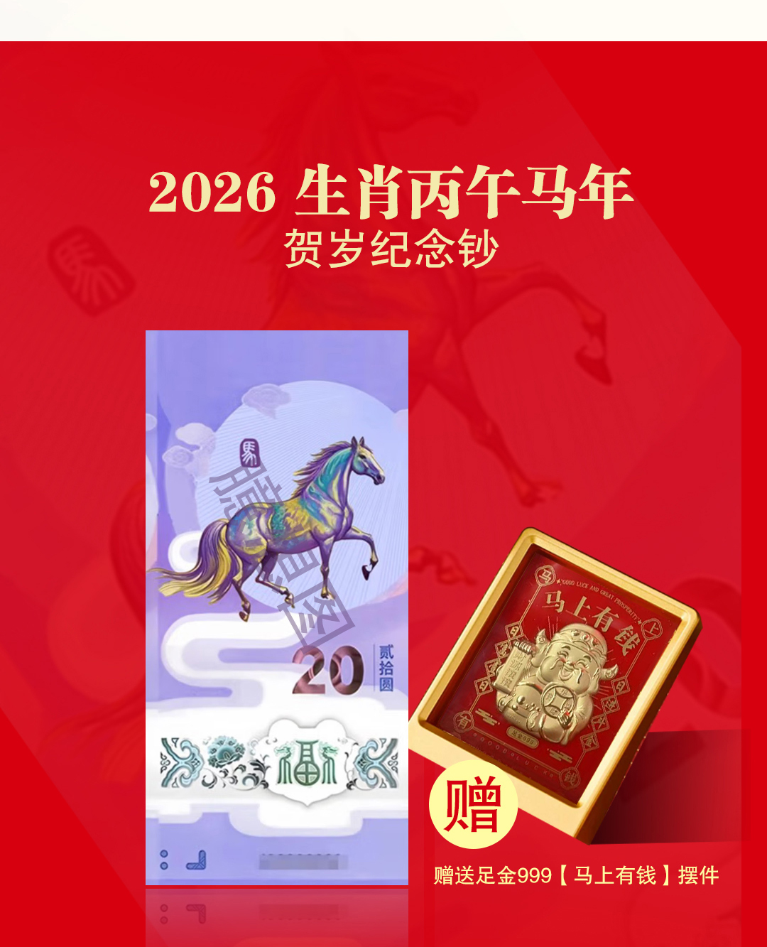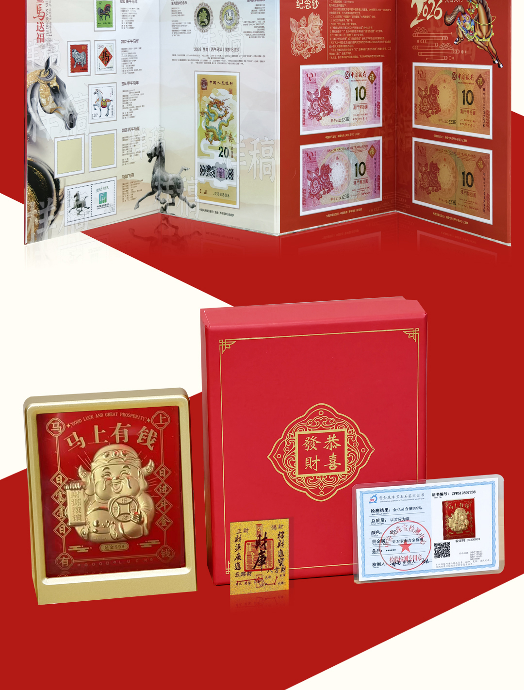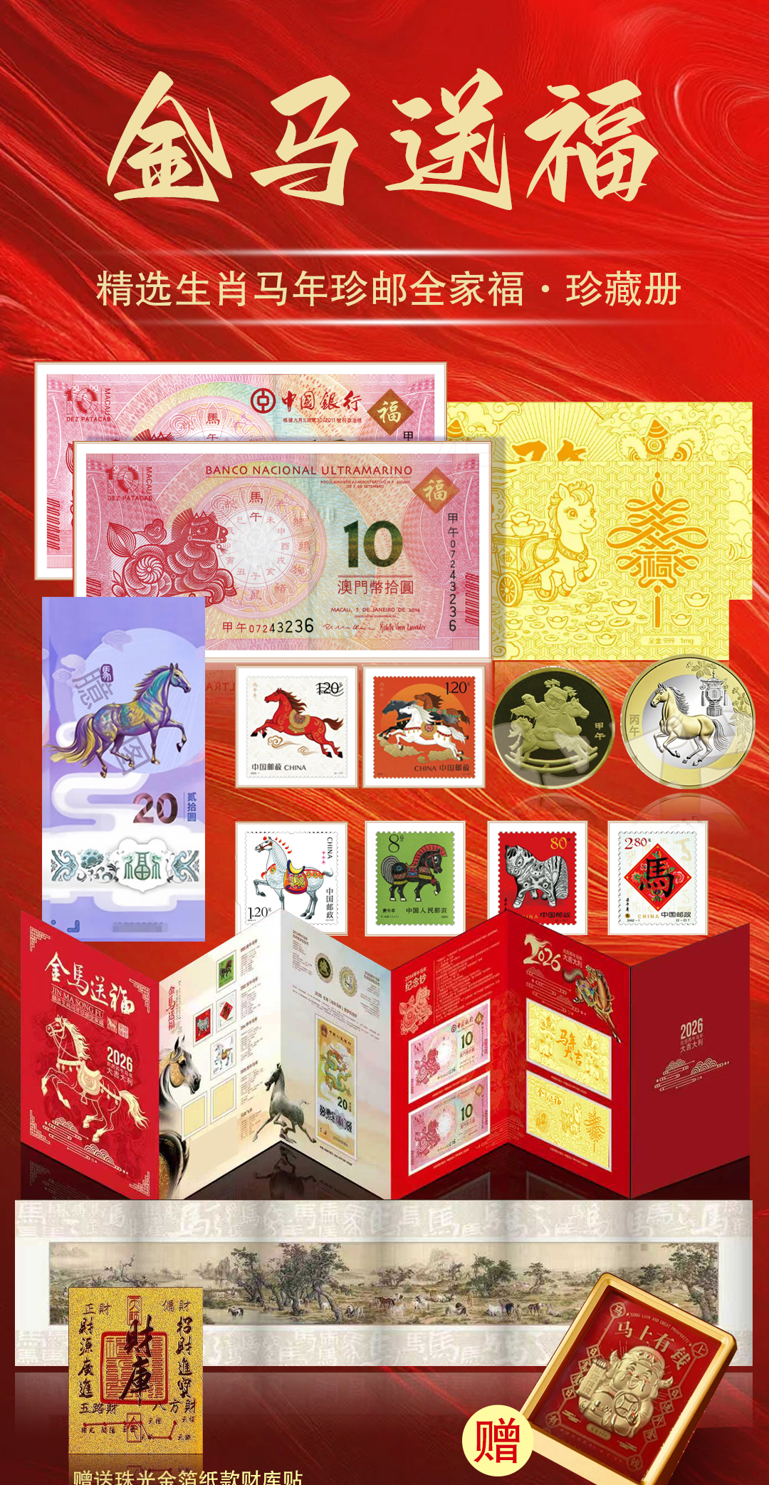 【金马送福·马年生肖大全套】,马年王炸,马钞,马币,邮票一起抢,还赠送您足金999马上有钱摆台! 一次把2026“邮币钞”硬通货打包到家,