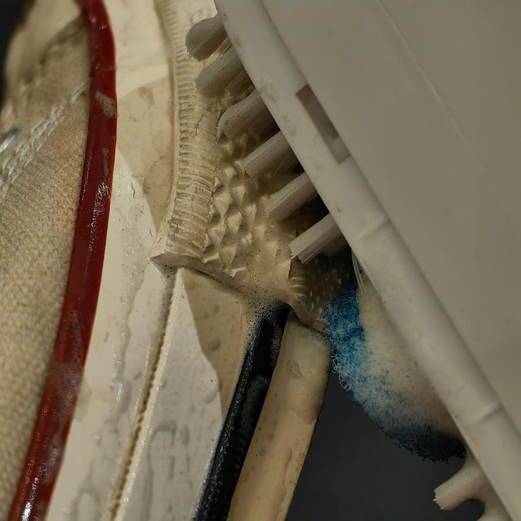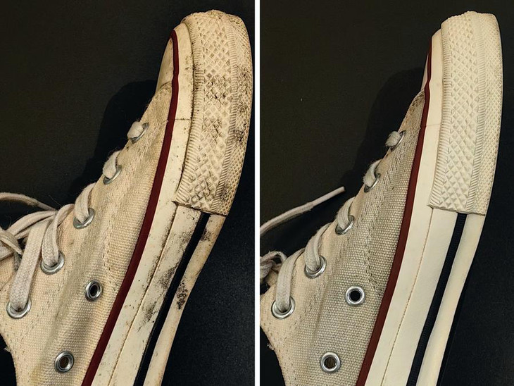 为了试它,我把珍藏了10年的小板鞋都祭出来了,就是为了风格故意穿脏的,陈年污渍就此阵亡。。。简单刷下,胶面就非常白了,鞋面实在是吸垢太多年,没办法完全变白,但也均匀了。但真的,太方便好用,如果家里有熊孩子的,必须安排上,每天踩泥都不怕!