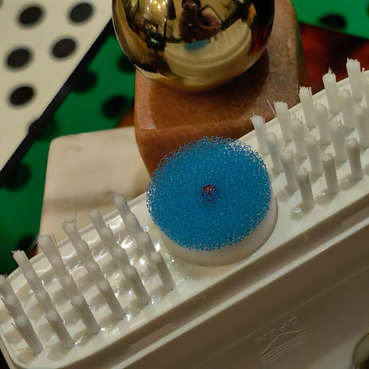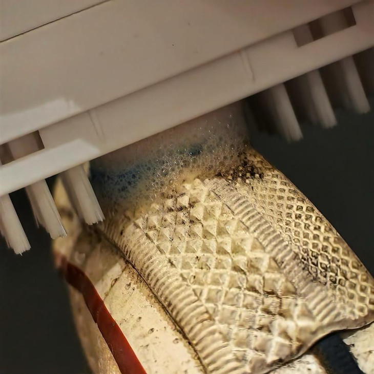 外形是半圆形,巴掌大小,一只手就能轻松拿下。使用也很简单,把海绵中间的红色小红点对着脏鞋按下去,就可以挤压出清洁剂了。外围是浓密的刷毛,在慕斯泡沫的清洁下,能快速清除掉比较浅表的污渍,而中间则是细密的专用海绵,配合泡沫将深层小污渍一起带走,无论是油渍还是久穿的黄渍,都能搞定。而且味道也还清新的,淡淡的柠檬香,还能小小缓解一下鞋鞋的异味哦!