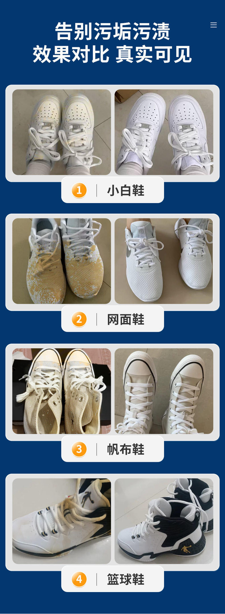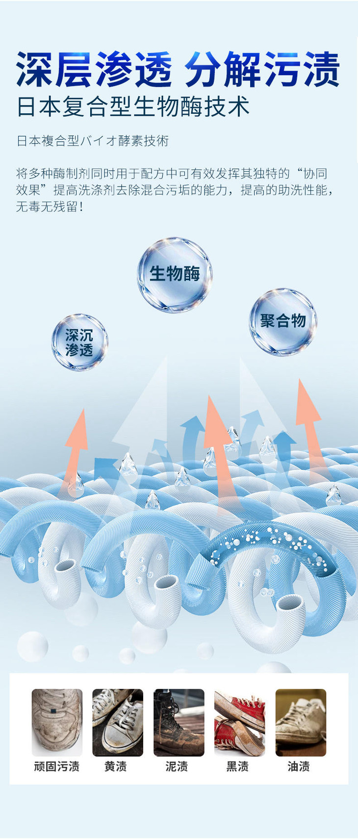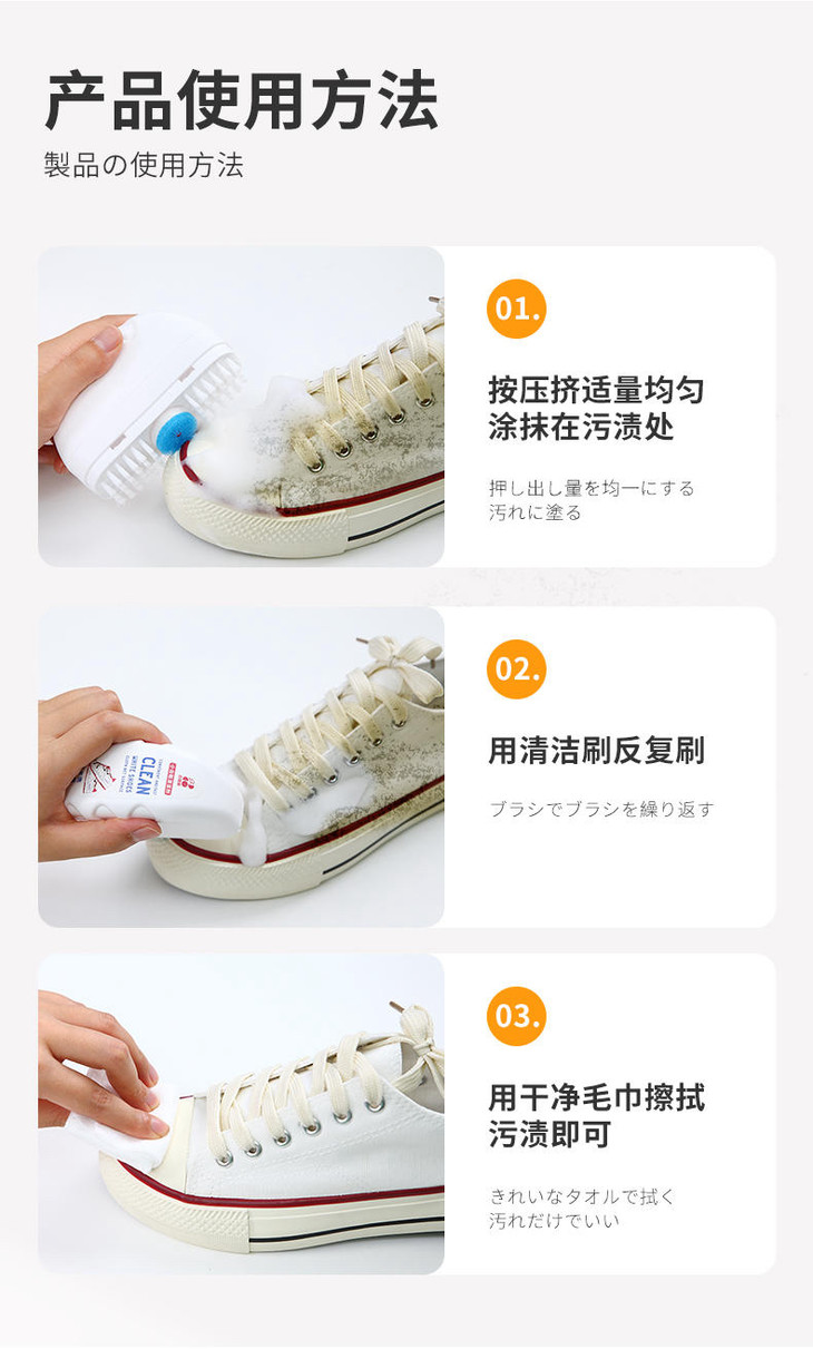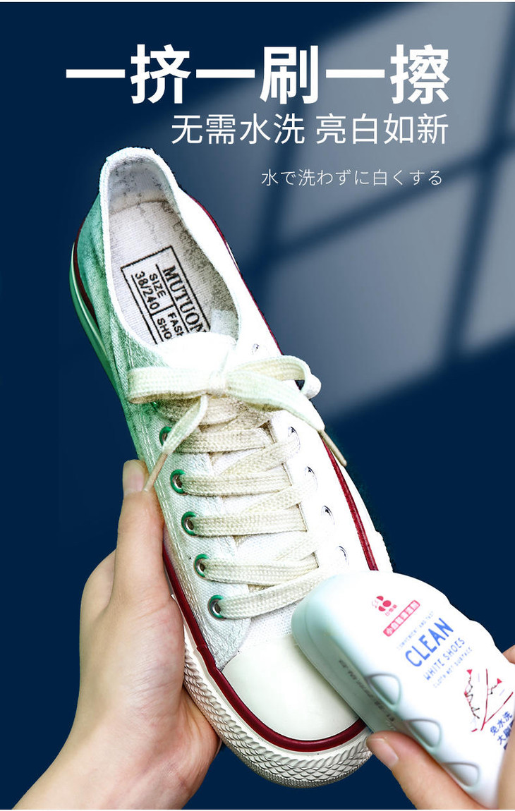 擦擦白的清洁剂采用日复合型生物酶技术,将多种酶制剂同时用于配方中,可以达到1+1>2的效果,同时升级成了慕斯泡沫,大大提高了洗涤剂去除混合污垢的能力,不需要用水就能直接擦洗,使用后无色素无残留,而且也非常温和,ph值为中性,不会伤手,更不会损伤鞋面,厉害的是,它并不只是光面能用哦,网面、布面也都能处理,擦擦白真不是浪得虚名!