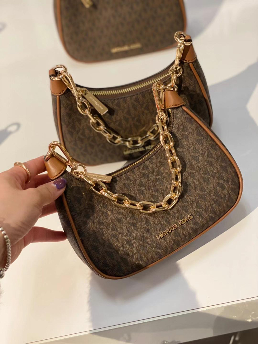 这款MK新款mini Cora豌豆包采用老花链条腋下包的设计,非常时尚。它的尺寸为19*10cm,非常适合搭配不同的服装。同时,它还搭配了皮质肩带,可手拎,也可以单肩斜挎,让您随时随地都能轻松携带。