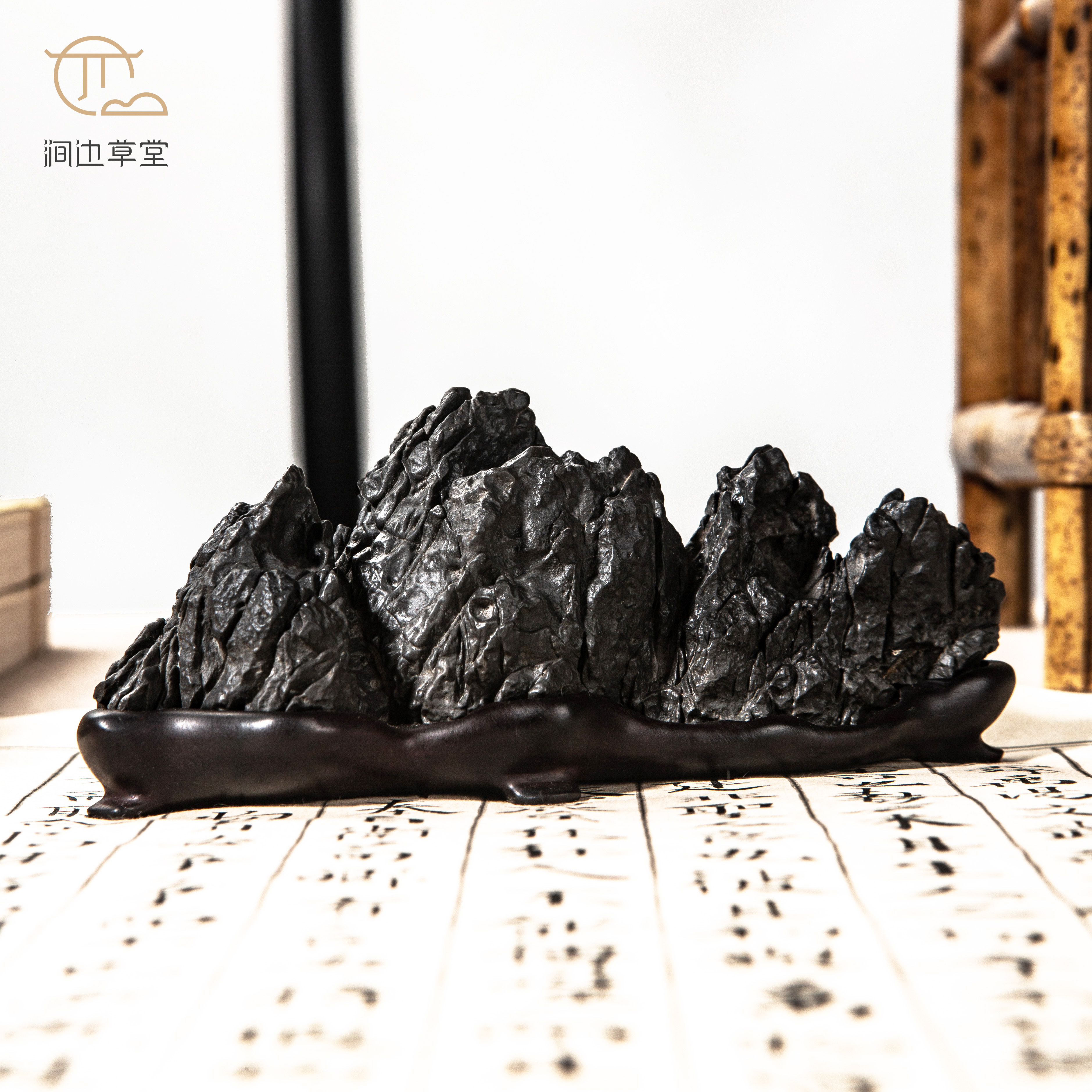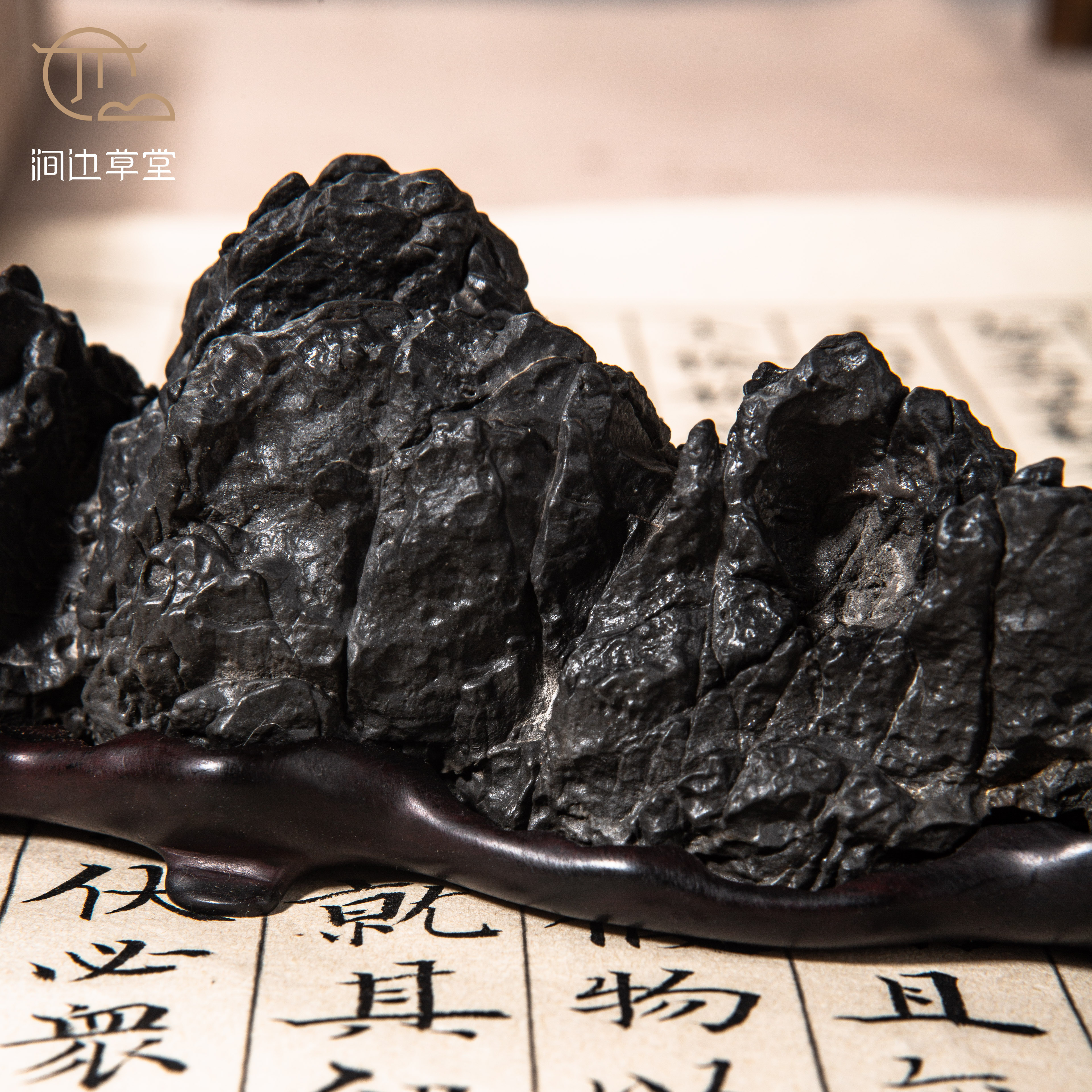 灵璧石群峰山子精品赏石,原石原底,未经任何人工修饰,配有专属底座。石纹褶皱缠结,肌理缜密,石表起伏跌宕,沟壑交错,造型妙趣天成,气韵苍古,可置放案几上别有一番雅致。