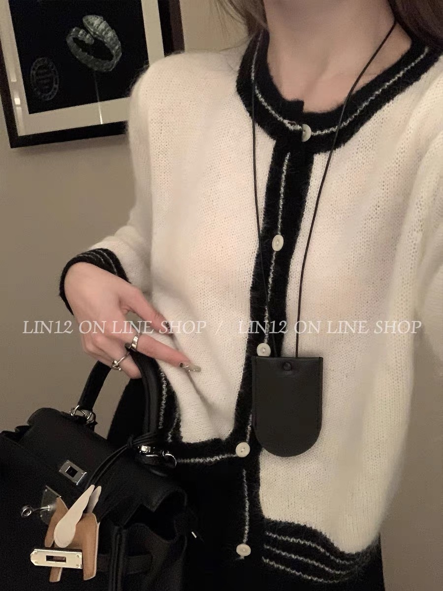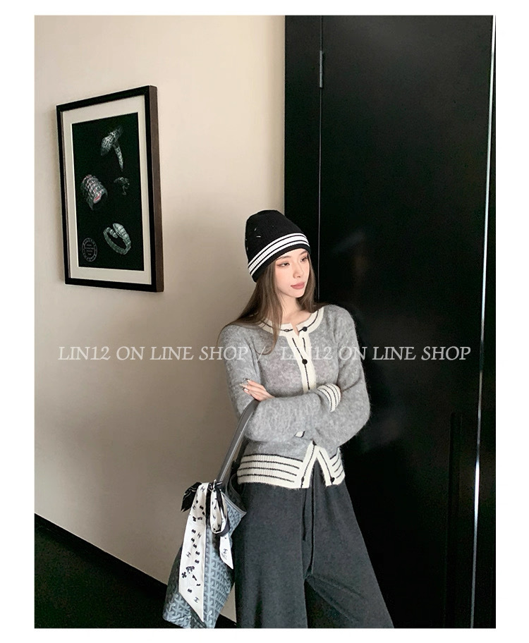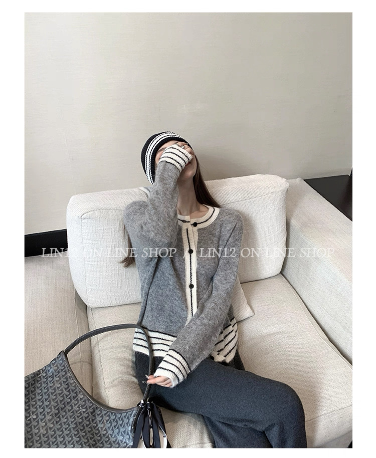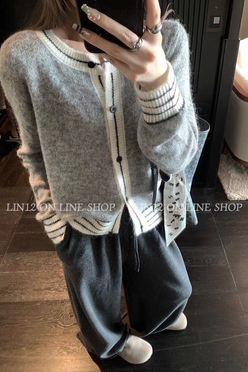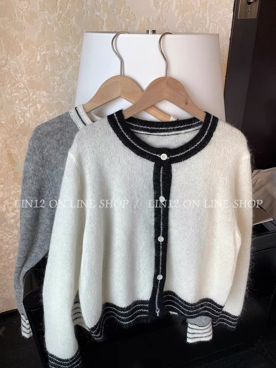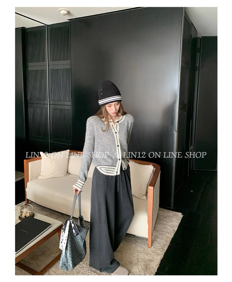 秋冬新款100纯羊毛衫开衫!女圆领撞色慵懒设计感毛衣外套时尚上衣!