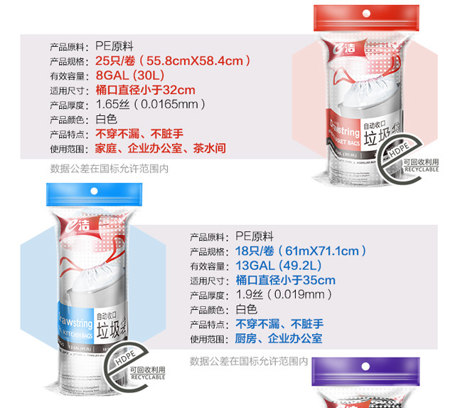 e洁自动收口垃圾袋加厚装 不易穿漏 家庭厨房酒店 出口欧美5卷装