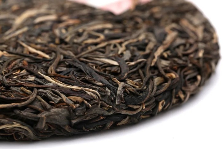 传统石磨手工压制,饼型压制稍松。条索粗壮显毫,已有明显转化。