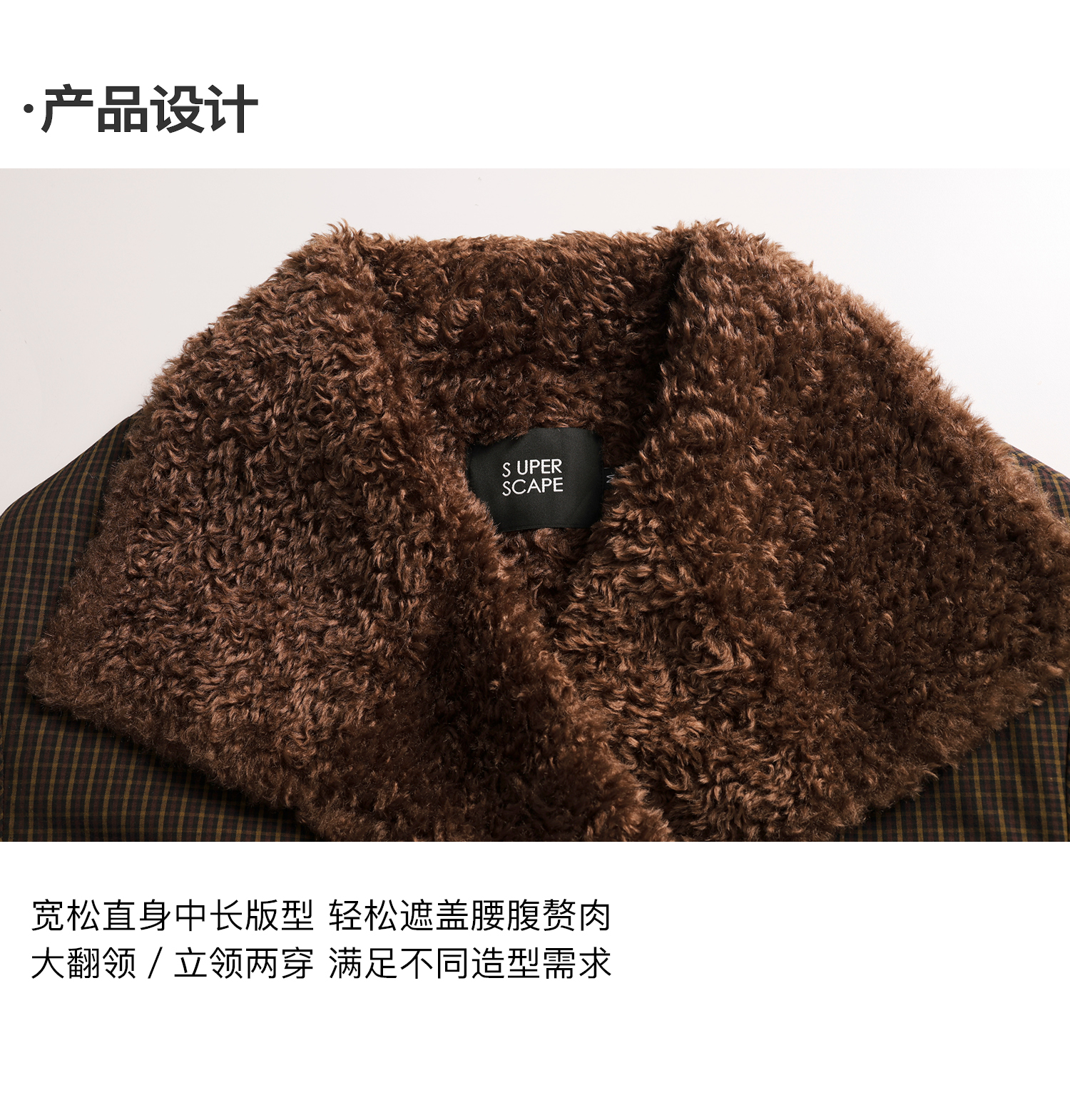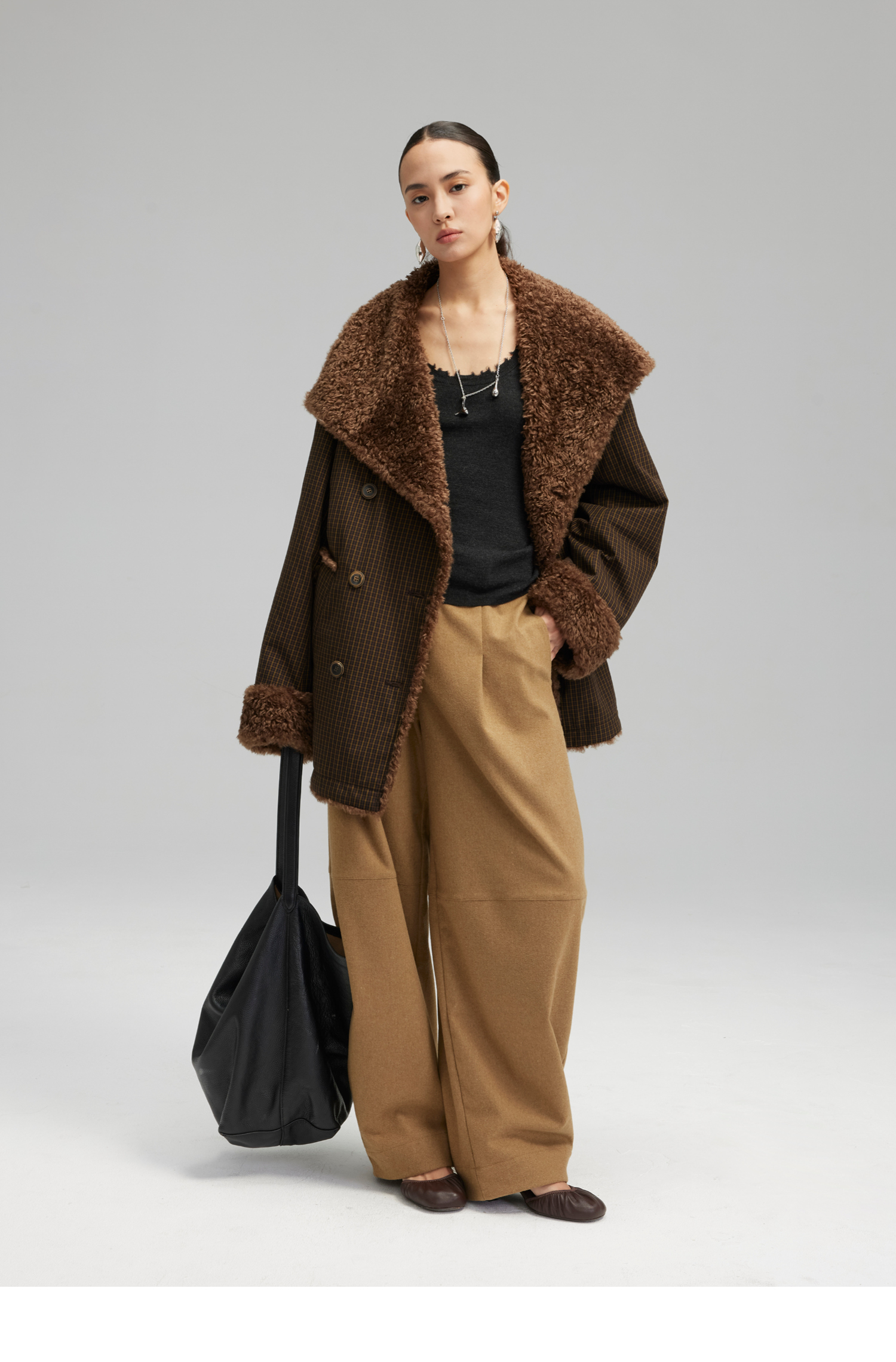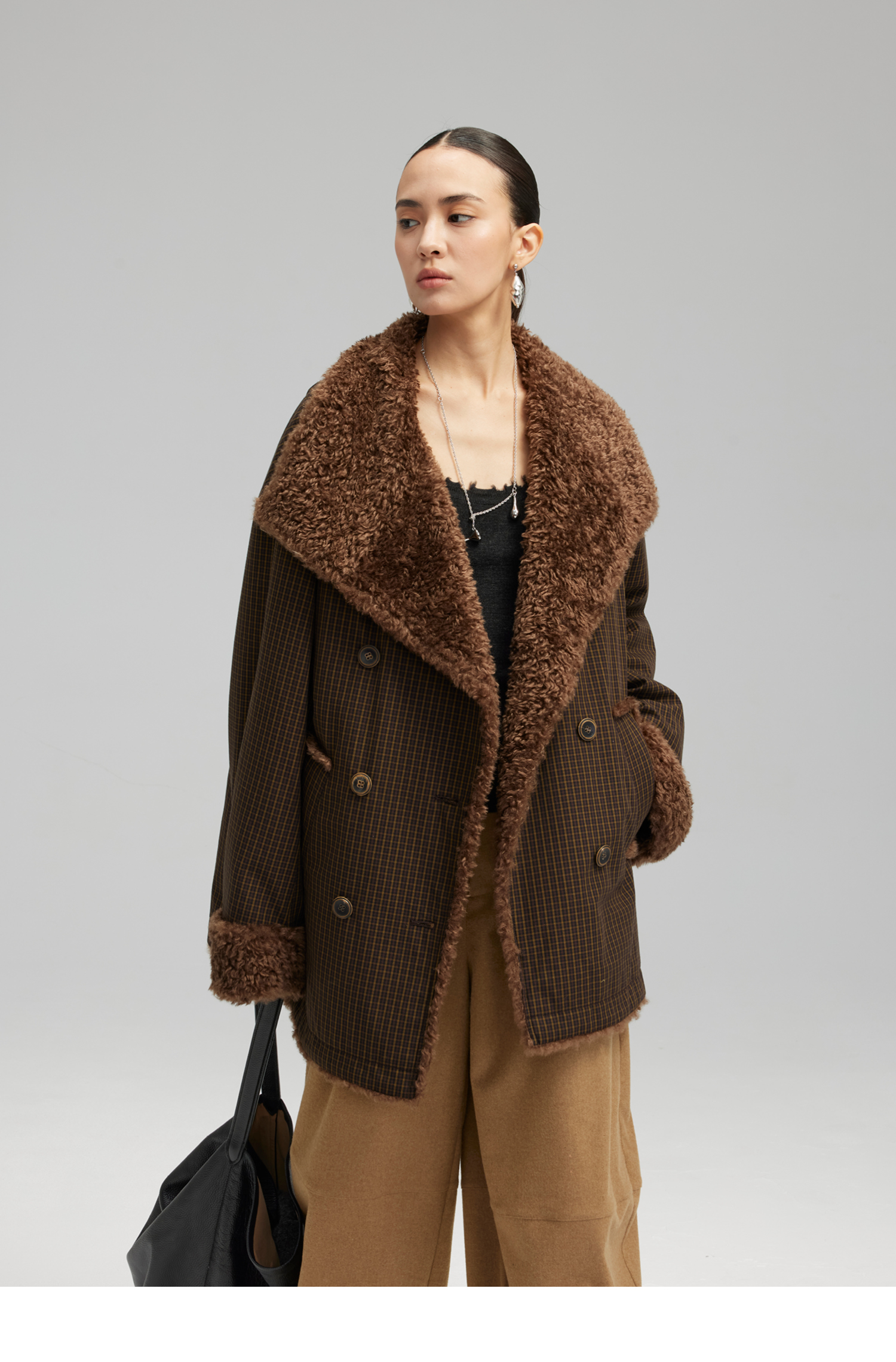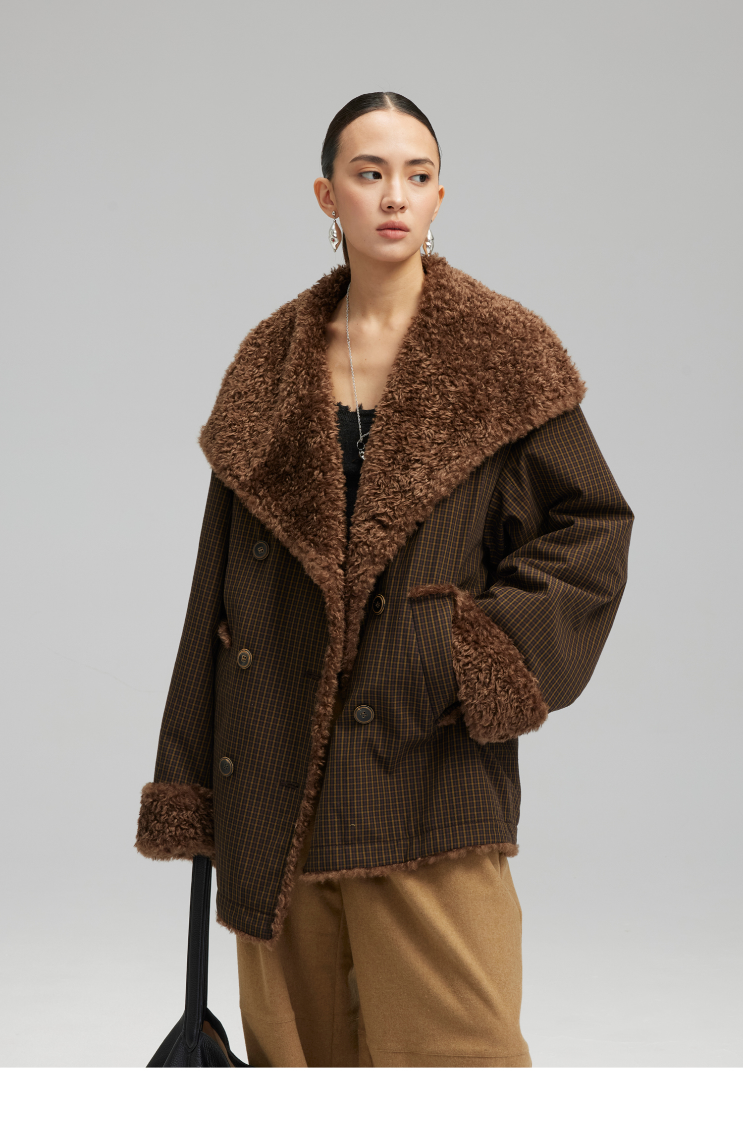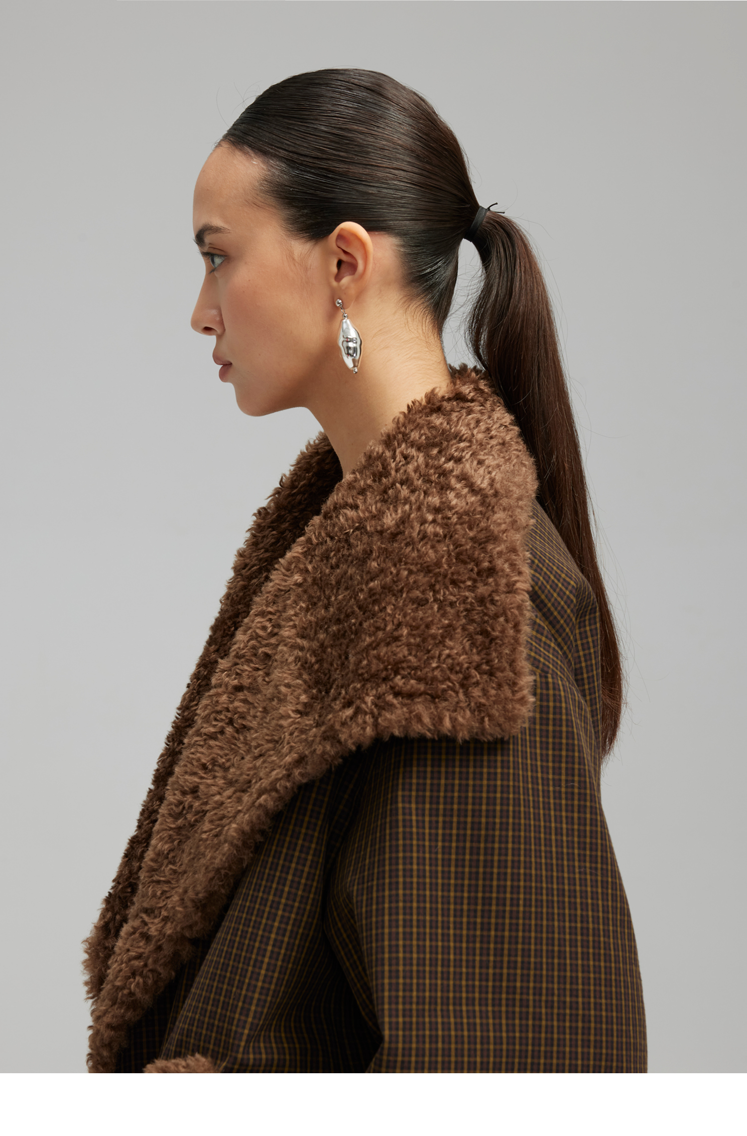 素舶 游牧风毛绒内里大翻领格纹中长款外套