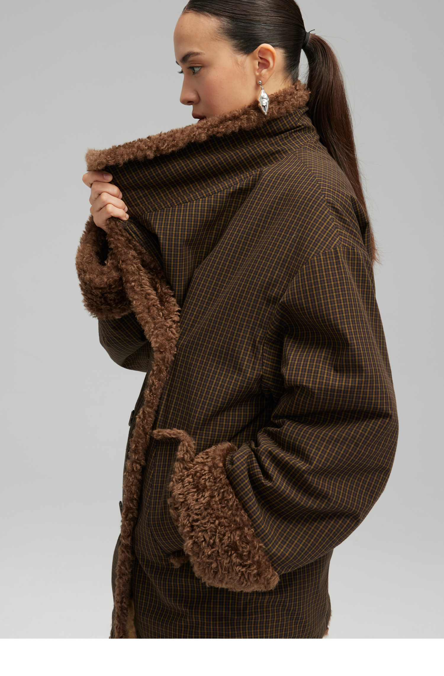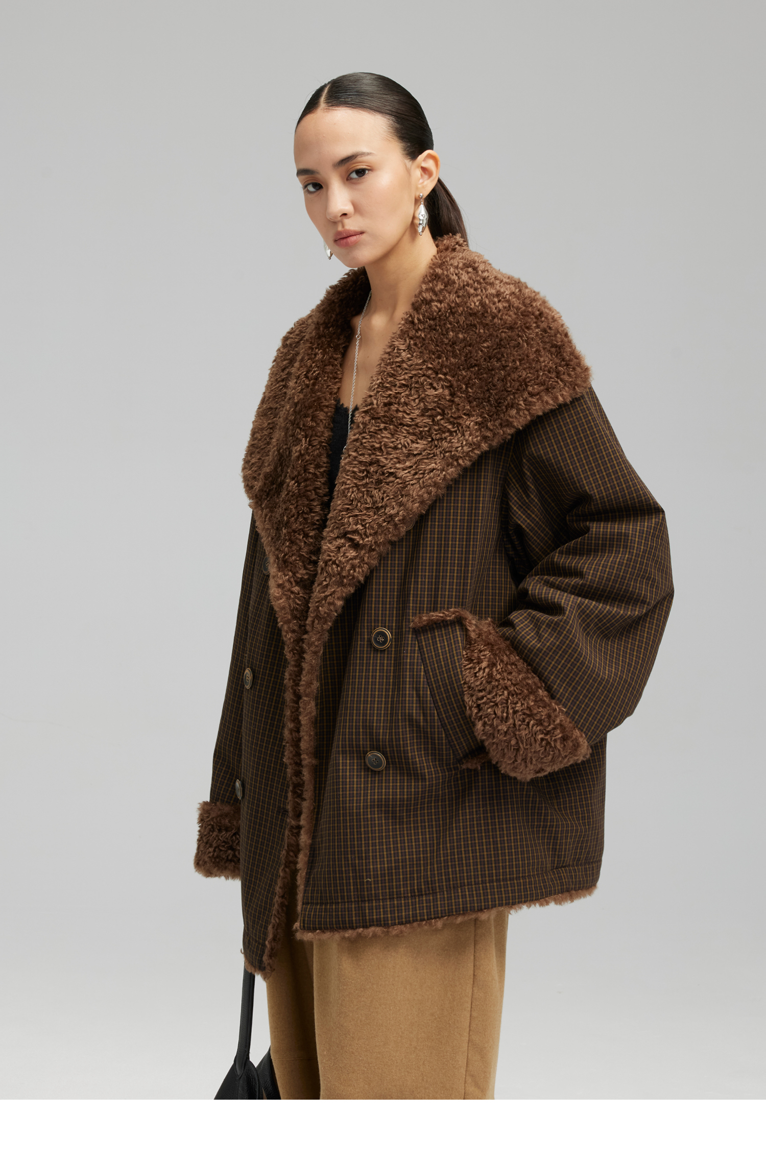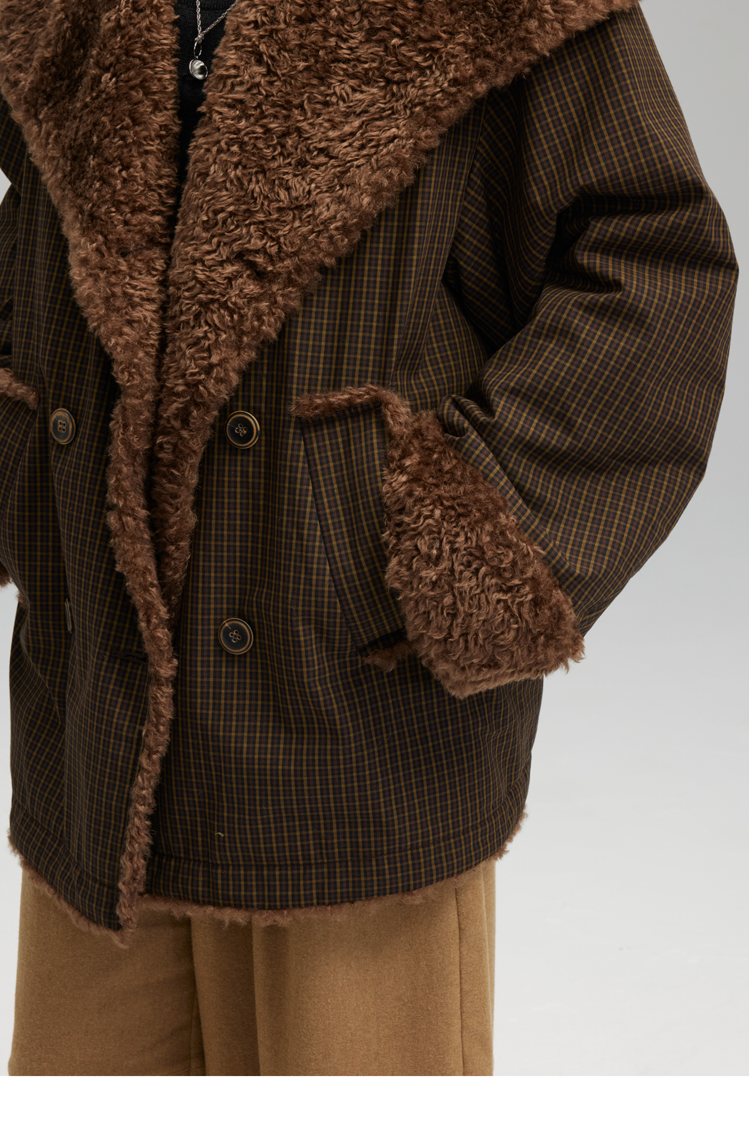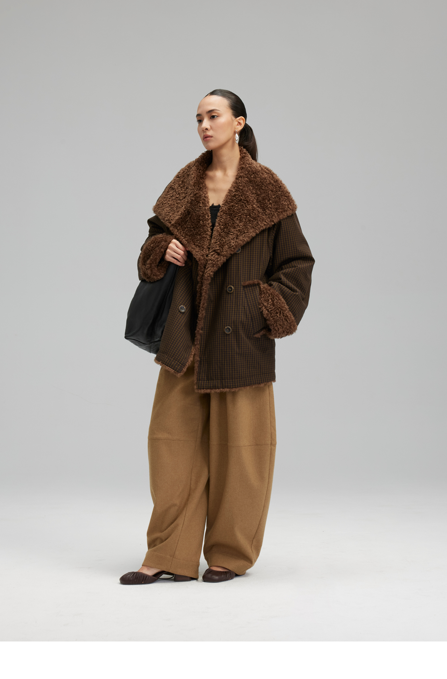 素舶 游牧风毛绒内里大翻领格纹中长款外套