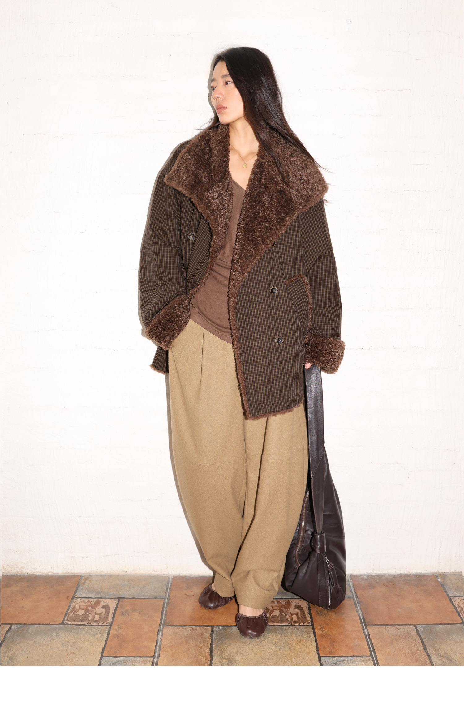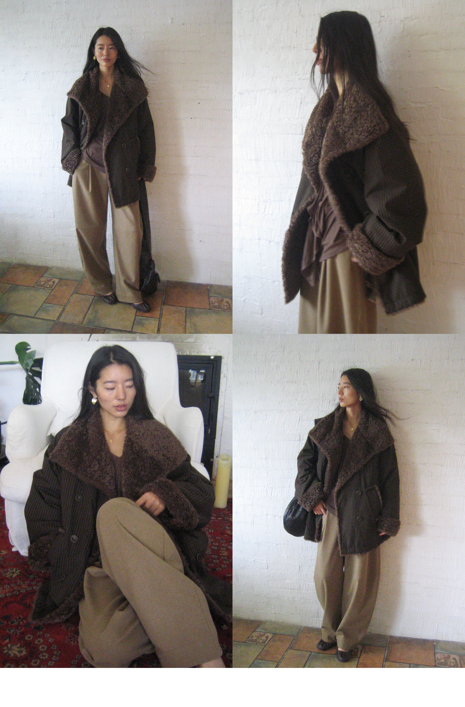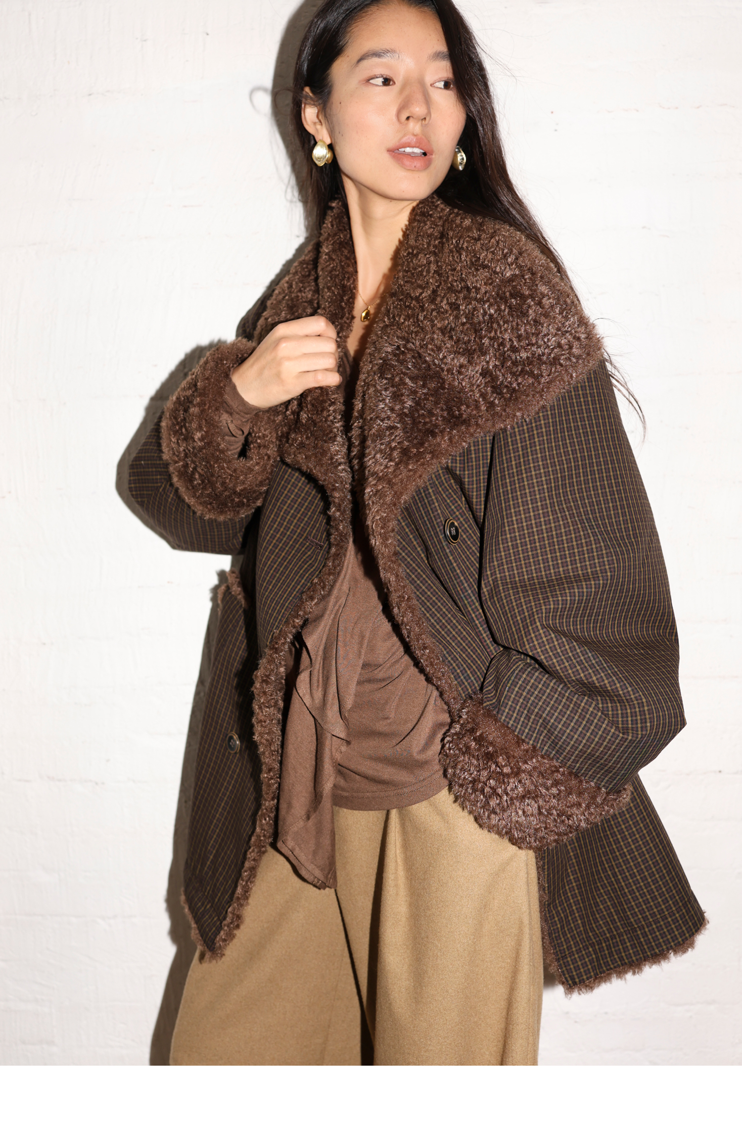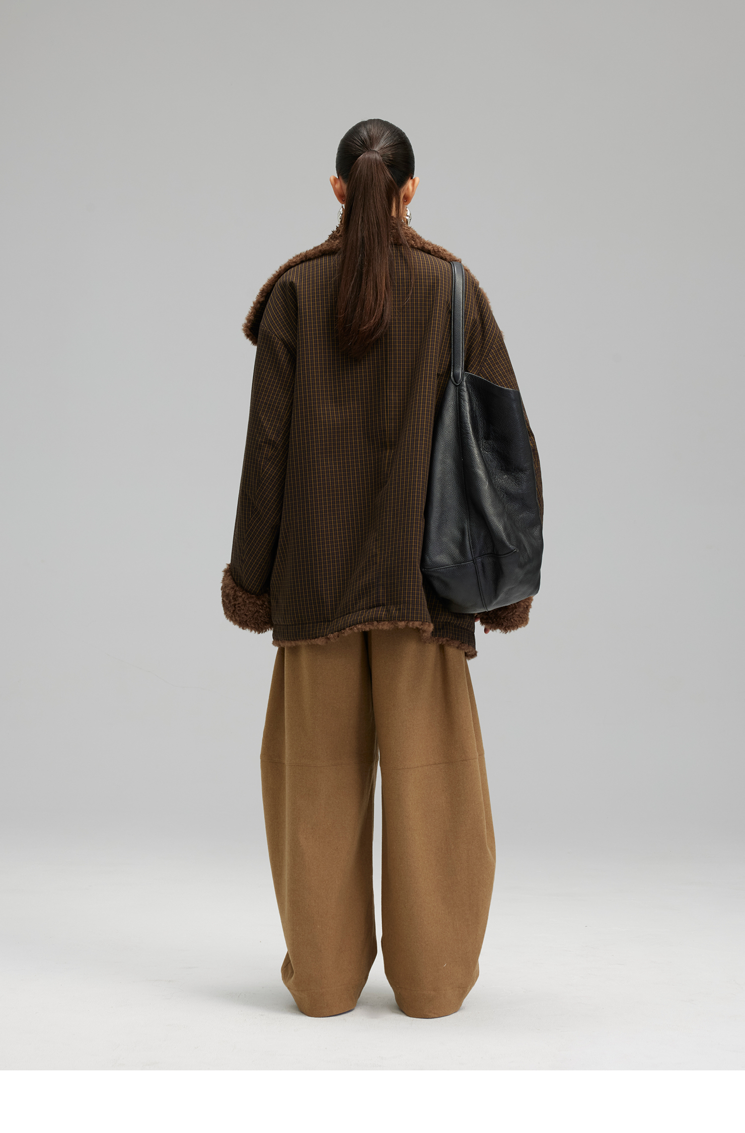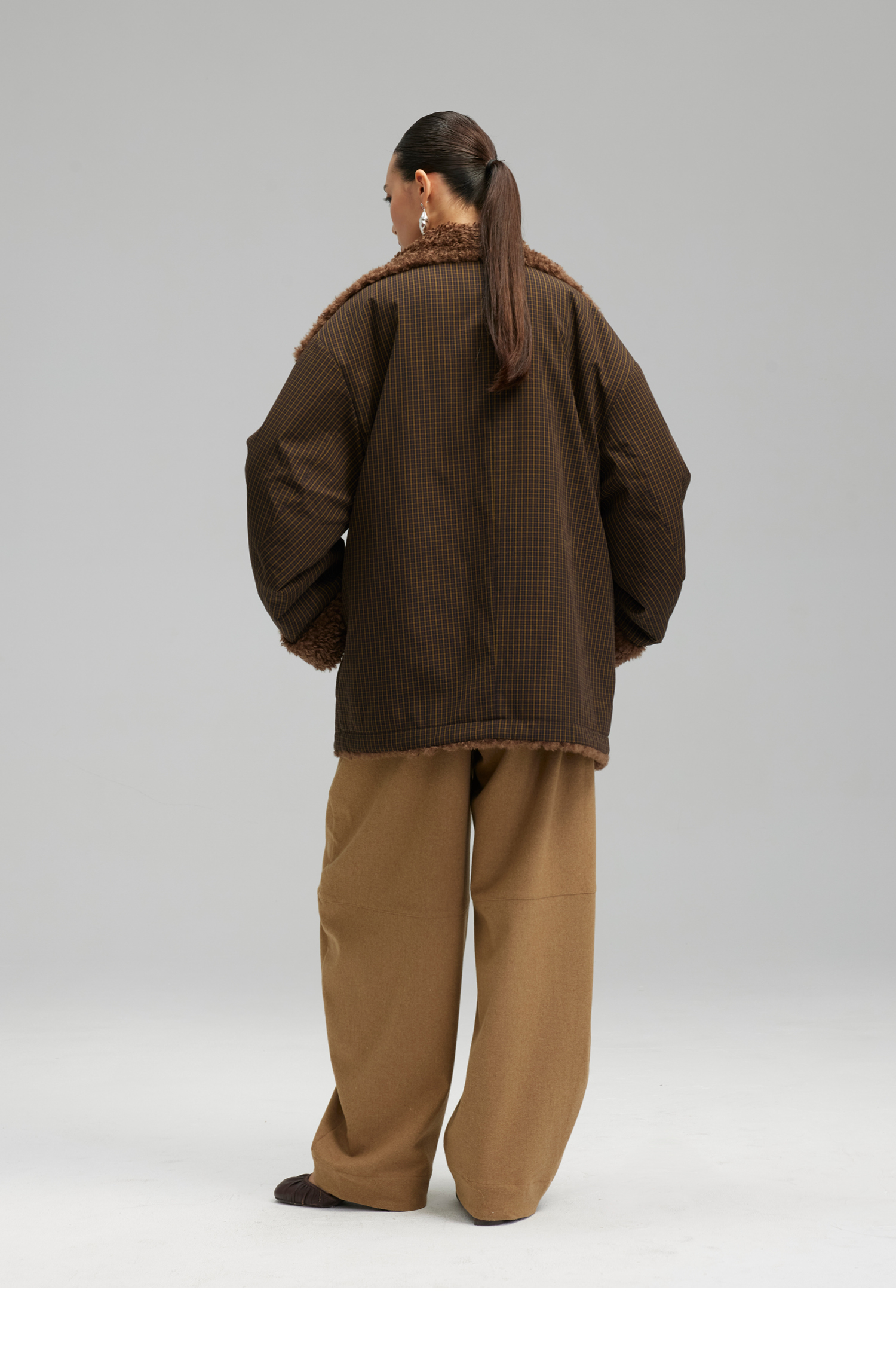 素舶 游牧风毛绒内里大翻领格纹中长款外套