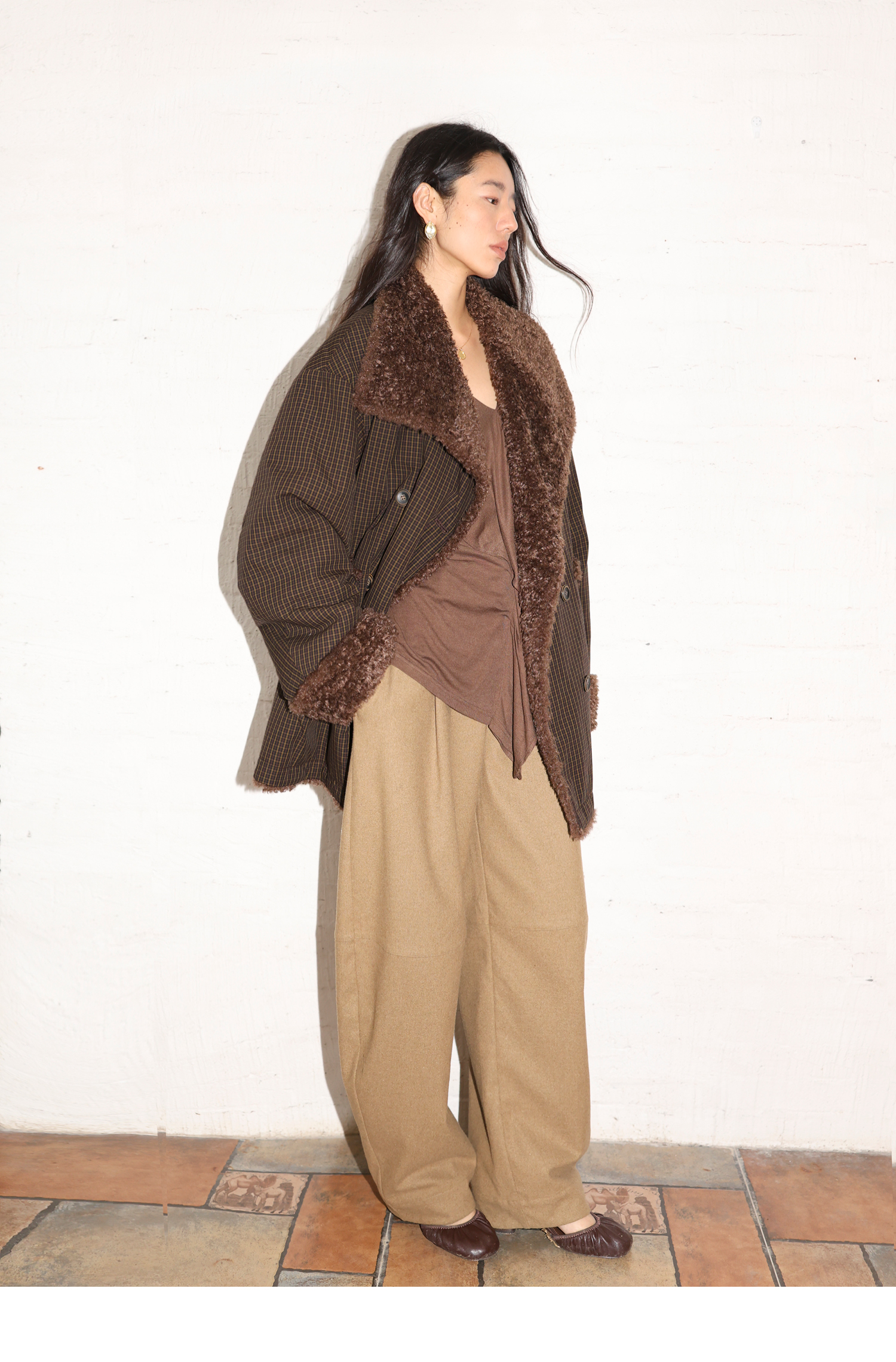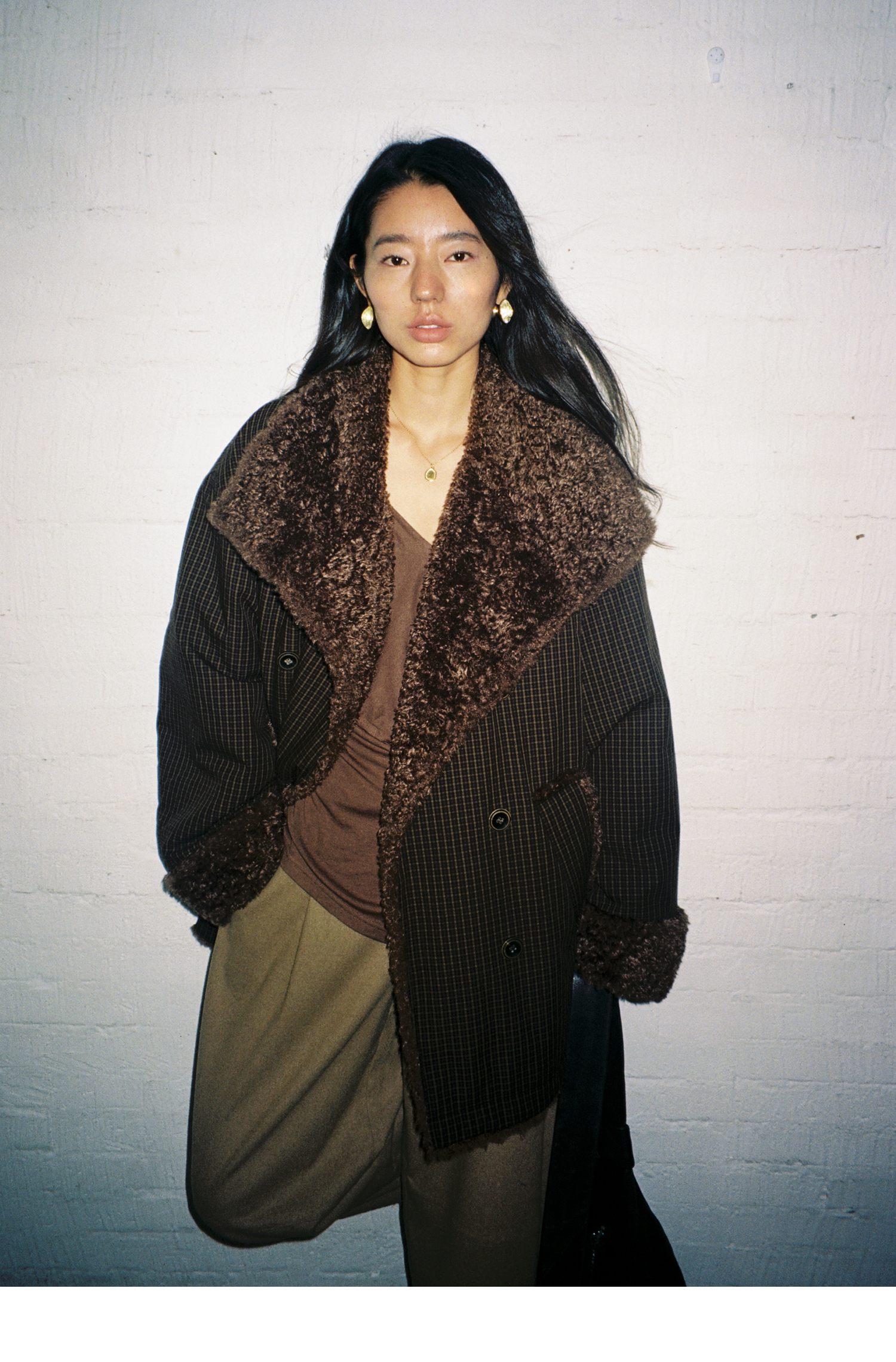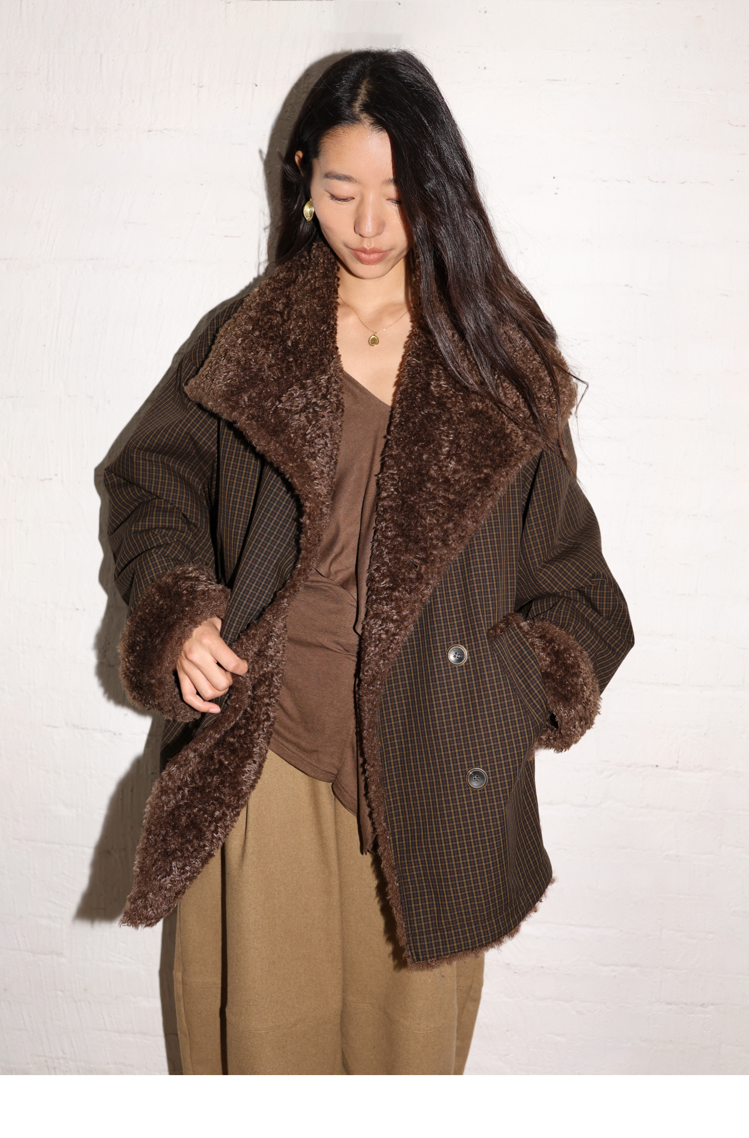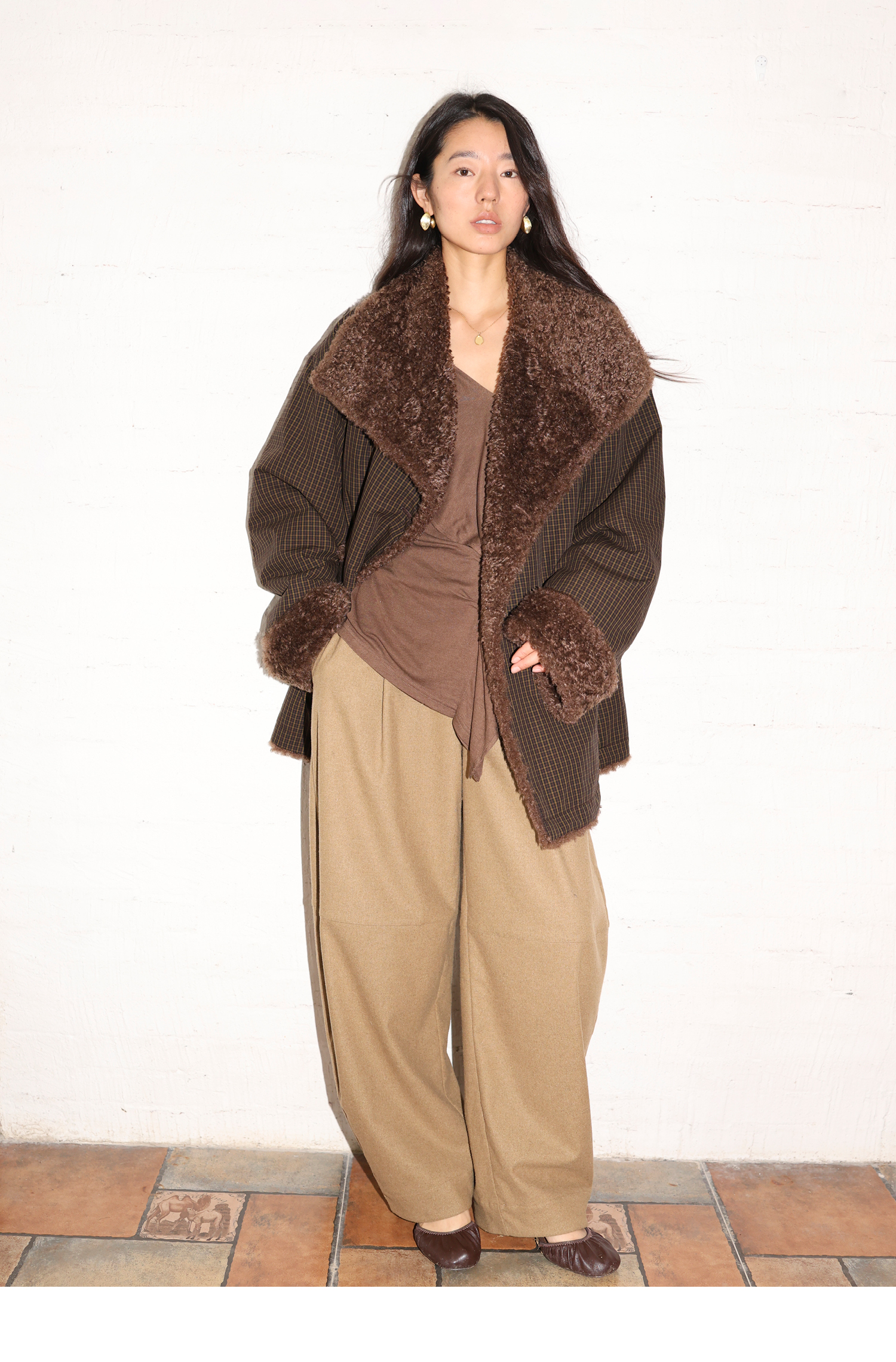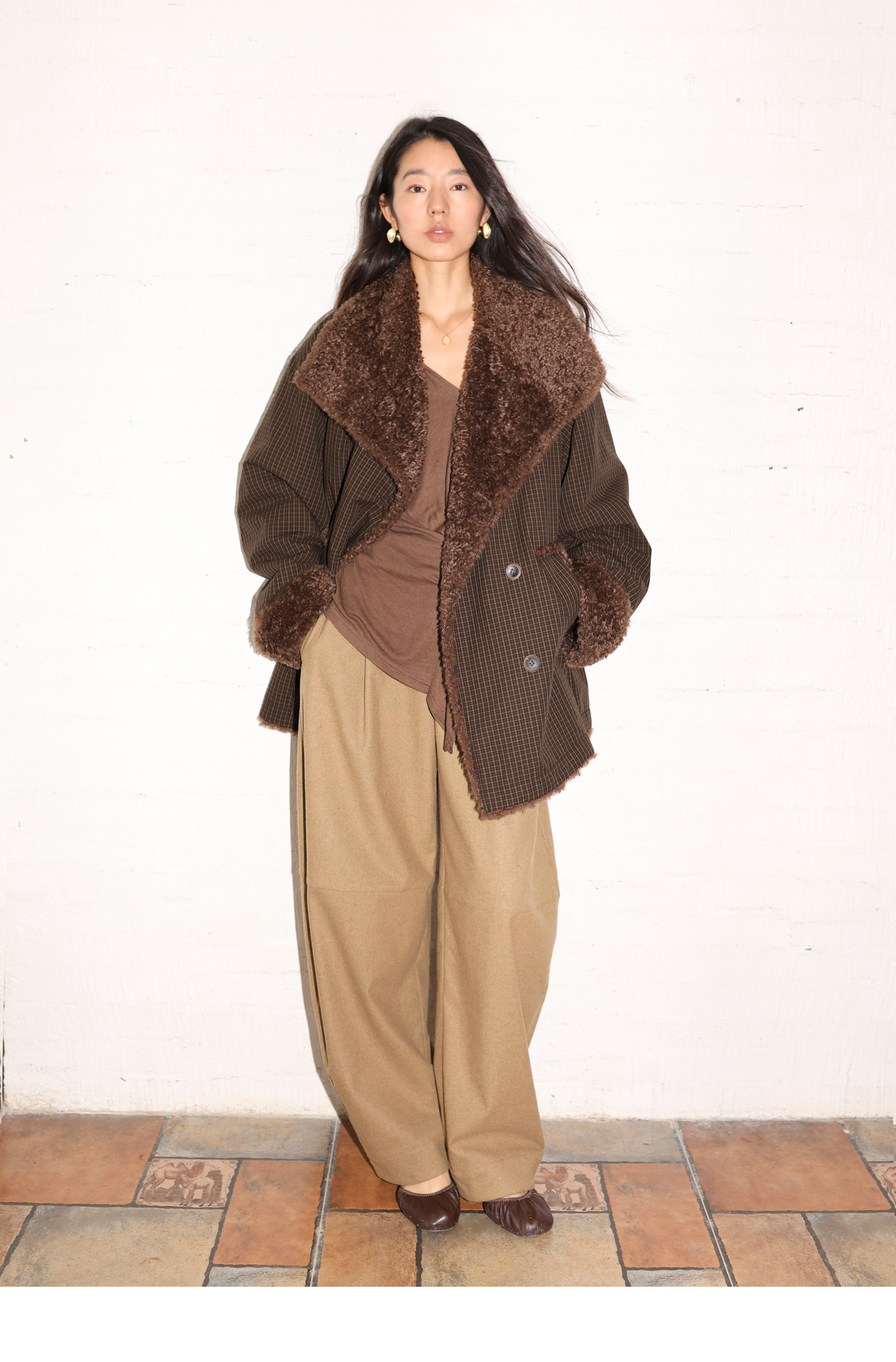 素舶 游牧风毛绒内里大翻领格纹中长款外套