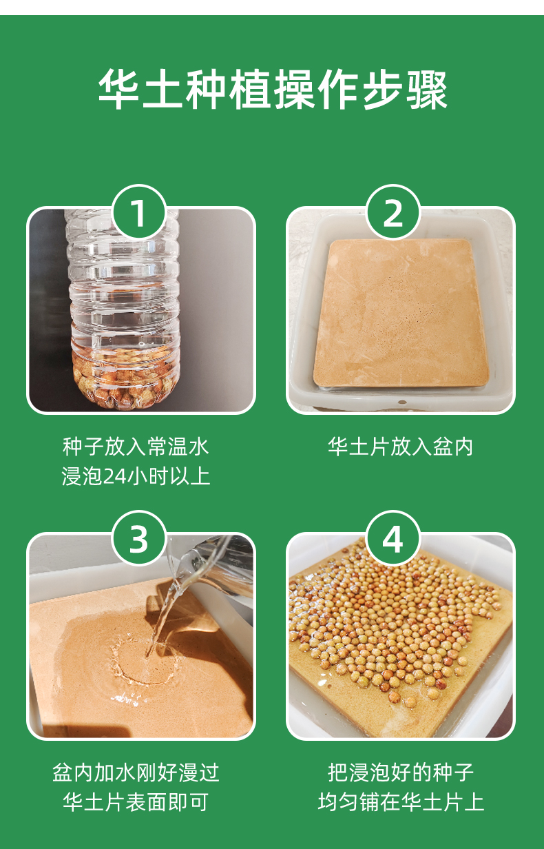 1、将种植板与种子洗净,种植前将种子用清水浸泡10-24小时(夏季宜短);