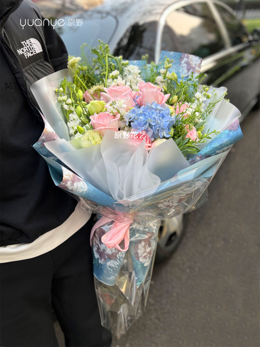 【蓝色海洋】玫瑰绣球混搭韩式花束