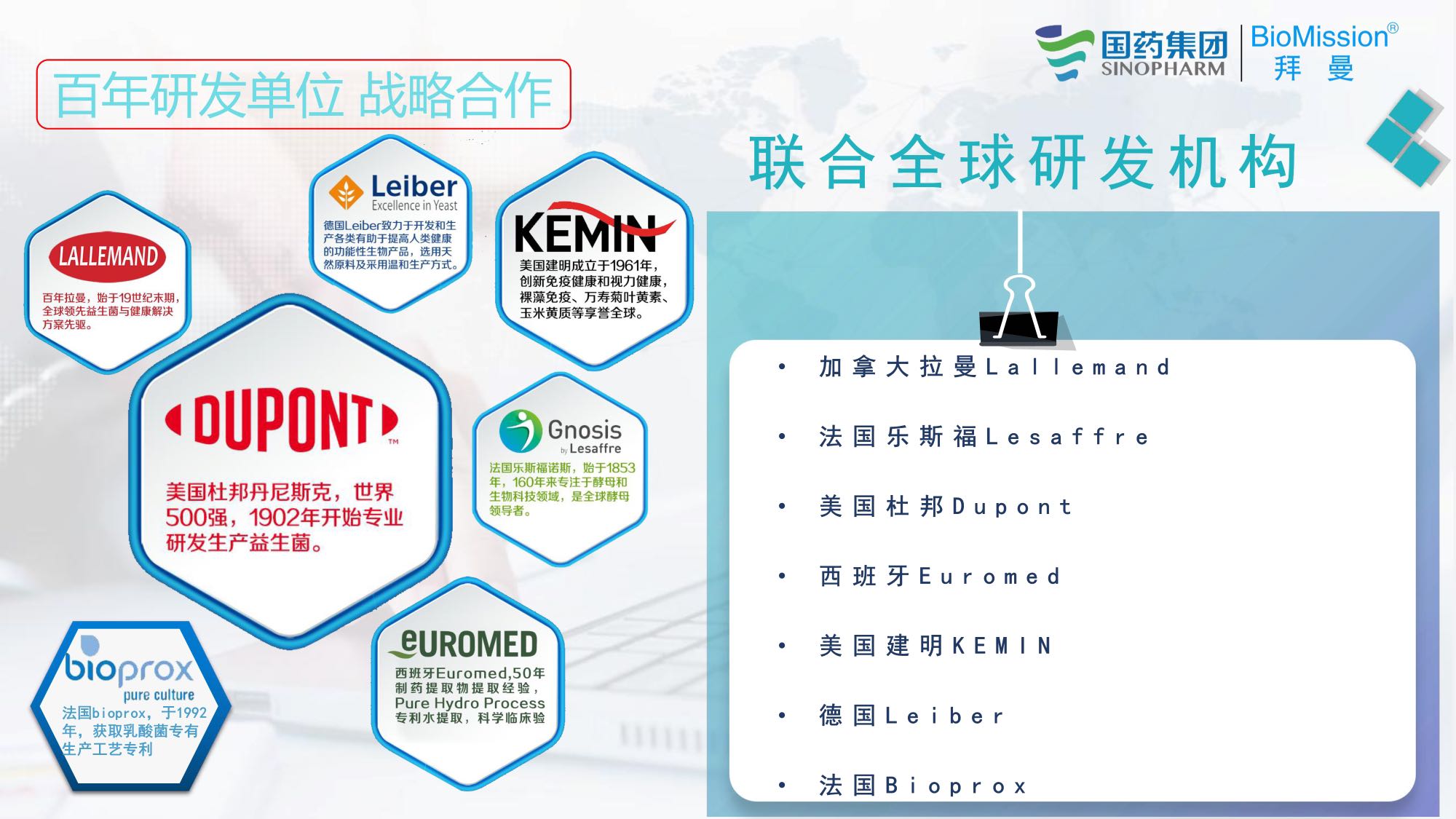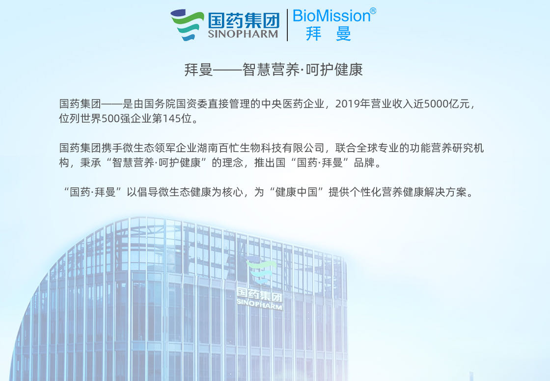 📌国药集团携手微生态领军企业湖南拜曼生物科技有限公司,联合全球专业的功能营养研究机构,秉承“营养智慧·呵护健康”的理念,推出“国药·拜曼”品牌。“国药·拜曼”以肠道微生态健康为核心,为“健康中国”提供个性化营养健康解决方案。