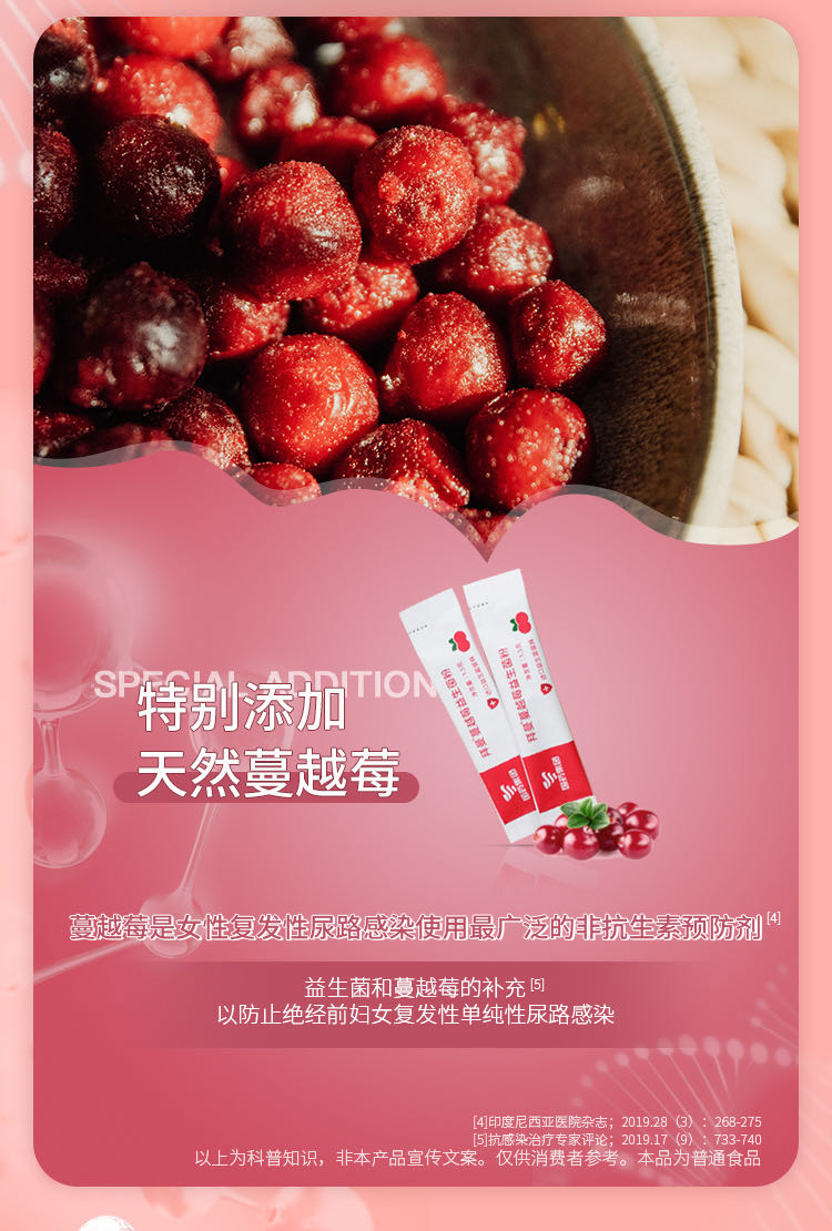 🌟每盒添加11.3%的高含量蔓越莓粉,呵护女性泌尿健康;