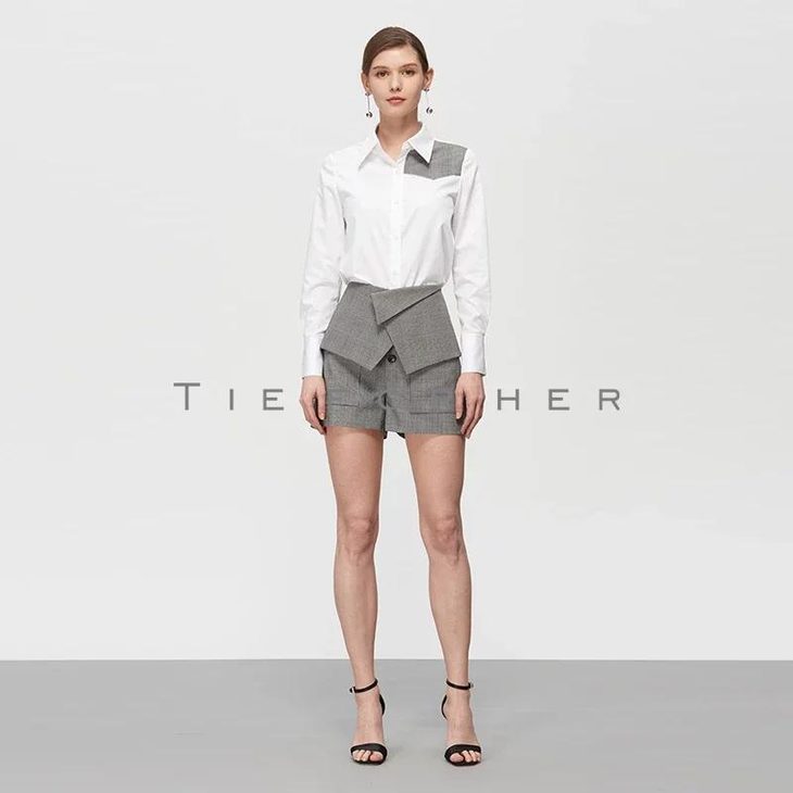 19SSDU158 皓白色拼接布鲁灰格纹衬衣