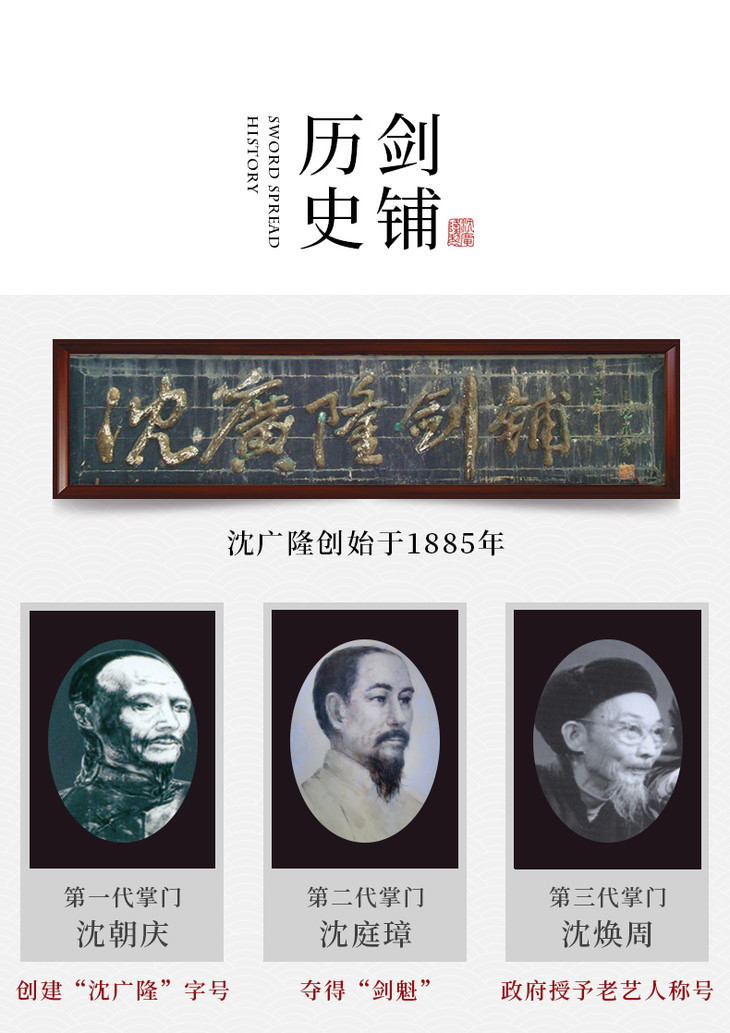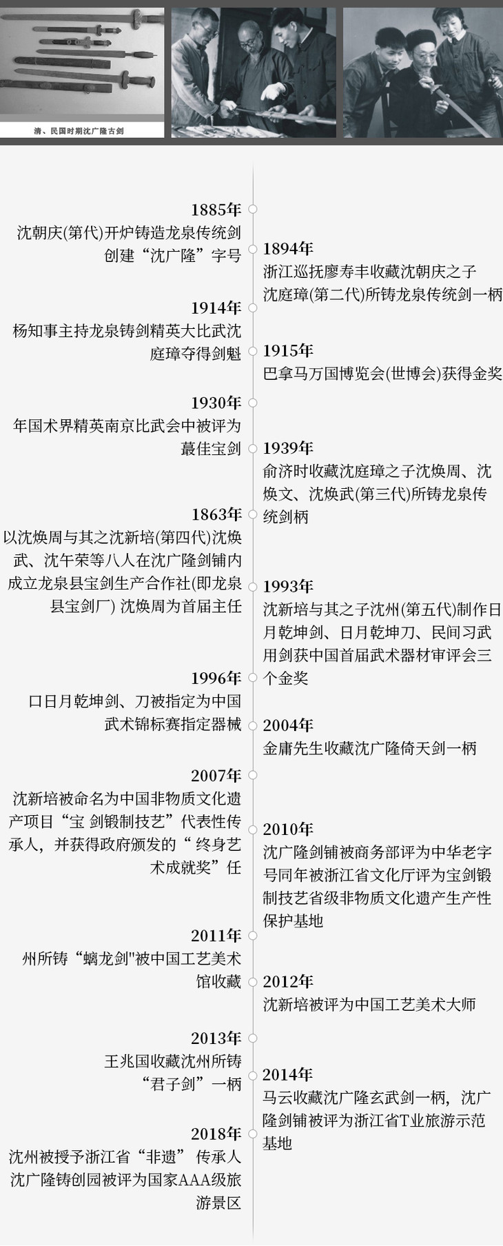 相传春秋末期,越国铸剑师欧冶子在龙泉秦溪山铸成龙渊、泰阿、工布三把名剑。并以龙渊为乡名。后因避唐高祖李渊讳,改称龙泉。唐乾元二年设龙泉县。从此,龙泉就成为剑的宝名,誉满天下。沈广隆剑铺位于浙江省龙泉市