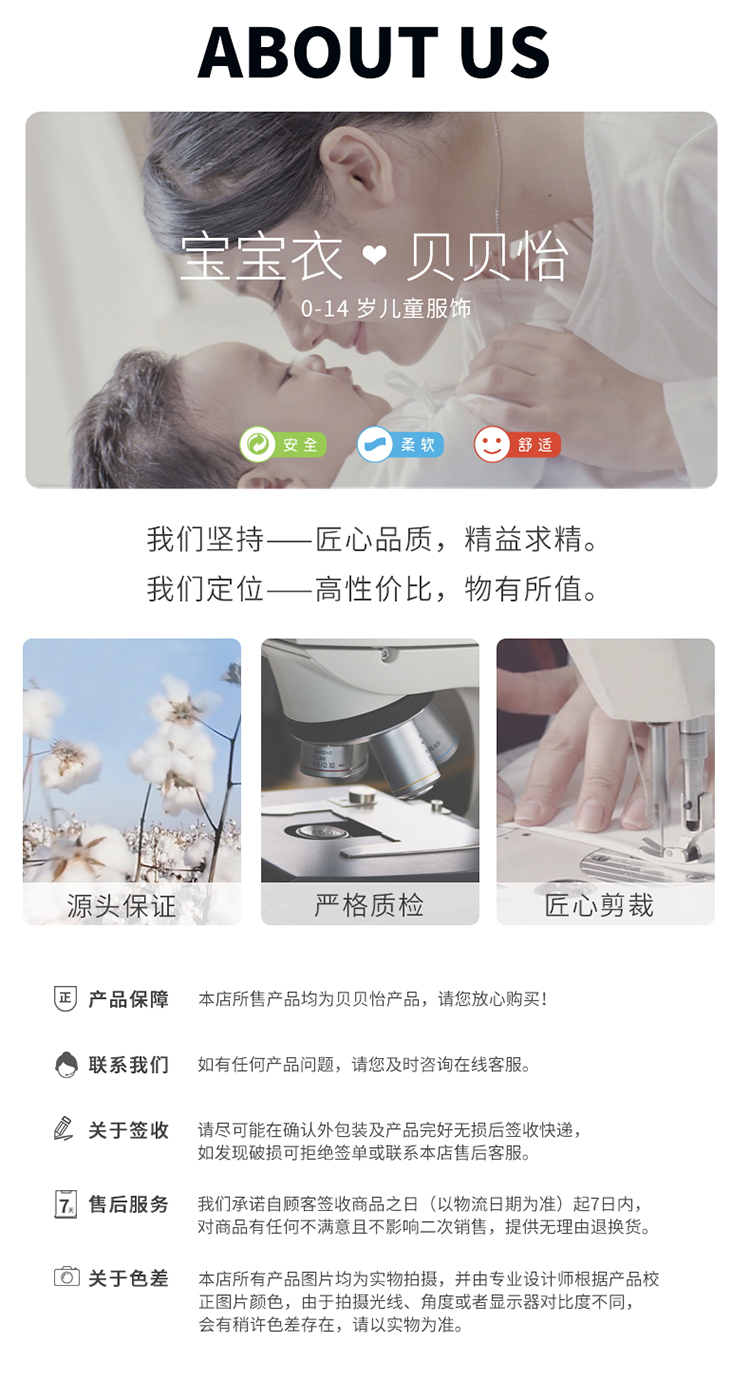 - 贝贝怡专注0-6岁婴幼儿服饰,坚持安全、柔软、舒适的产品理念,为千万中国家庭提供超高品质、安全可靠的婴幼儿服饰产品,妈妈放心,宝宝开心!