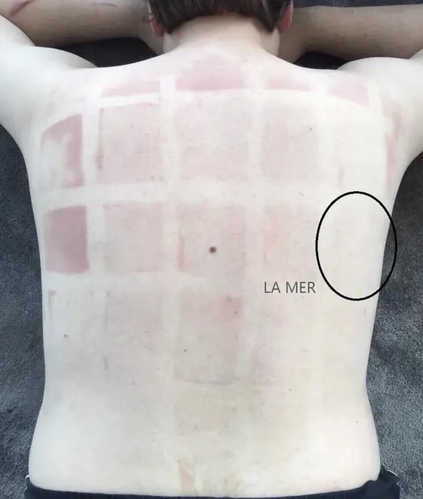 小哥亲身人肉暴晒3小时后,可以看到涂抹了LA MER防晒的部位几乎看不出晒黑痕迹!