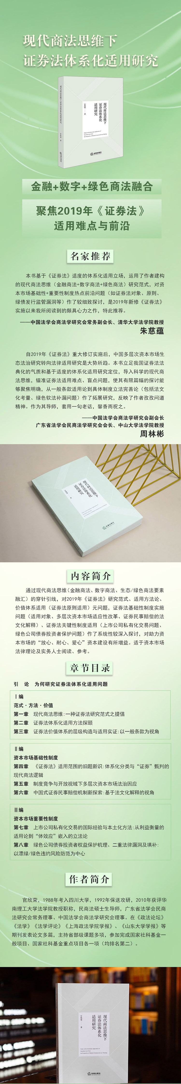 通过现代商法思维(金融商法、数字商法、生态/绿色商法要素融汇)的穿针引线,对2019年《证券法》研究范式、适用方法论、价值体系适用(证券法原则适用)元问题、证券法基础性制度实施问题(适用对象、多层次资本市场适应性改革、证券民事赔偿的法文化解释)、证券法关键性制度适用(上市公司私有化交易问题、绿色公司债券投资者保护问题)作了较深入系统性探讨,助力资本市场的“放心、耐心、爱心”资本建设。本书适于资本市场法律理论及实务人士阅读、参考。