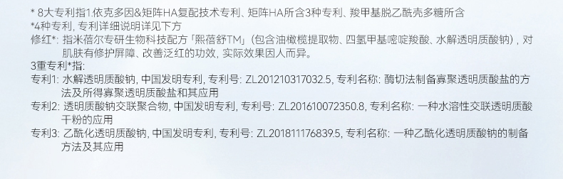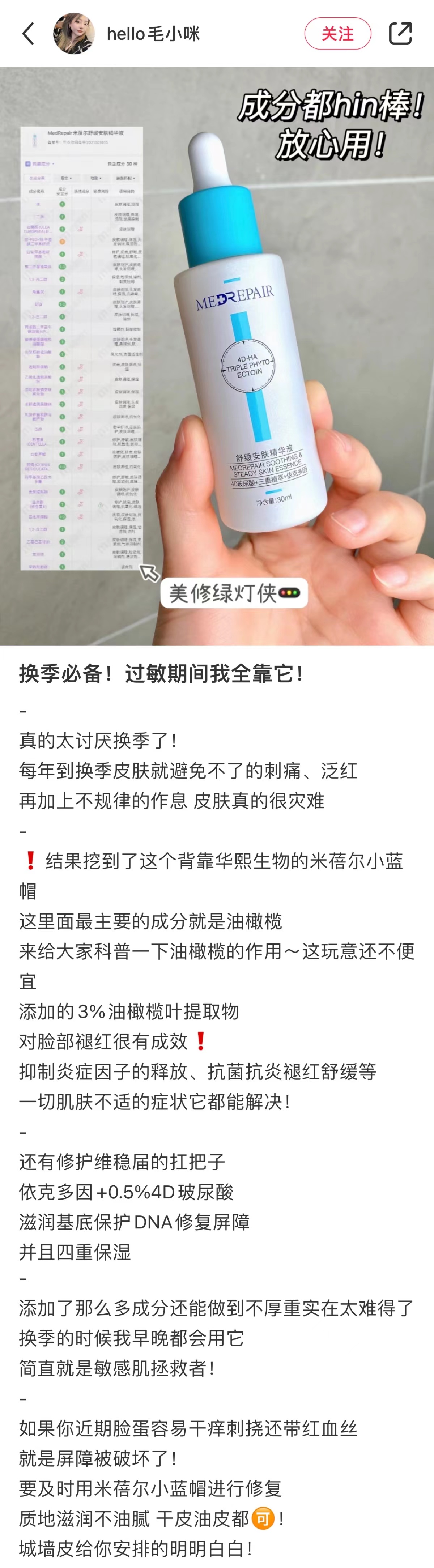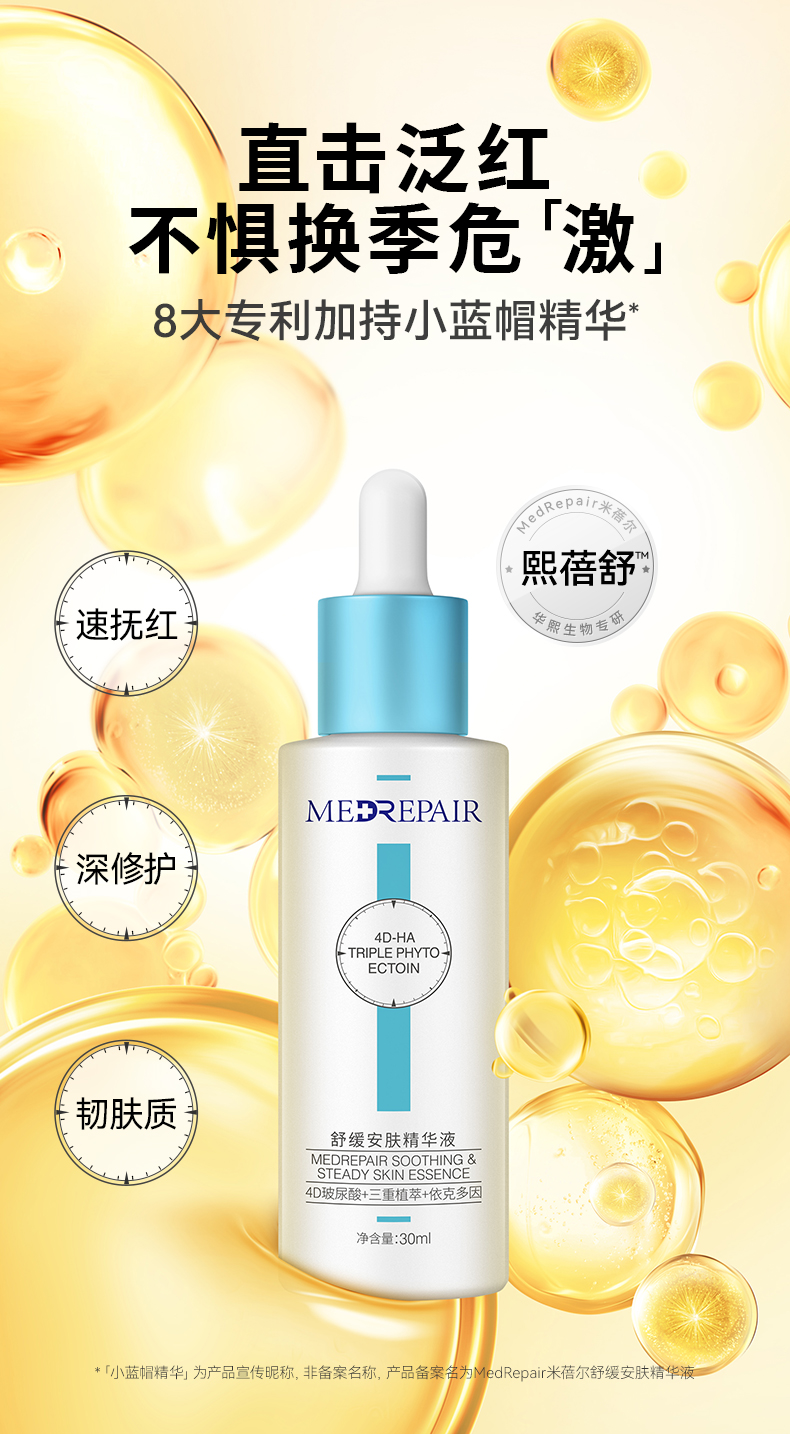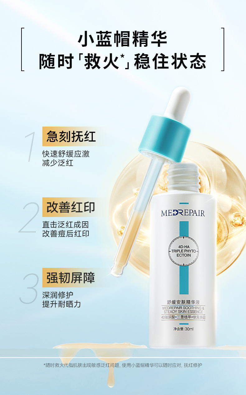 小蓝帽精华跟系列其他产品一样,专门针对肌肤泛红不适,适用于夏天晒后的潮红、口罩之下的湿红、换季缺水的干红以及医美项目之后的激红等,它通过8大专利来为肌肤“灭火”,它的主打成分是油橄榄叶提取物,这种自然植萃中富含橄榄苦苷、多酚、黄酮等成分,可以有效改善敏痘肌的泛红,使油脂分泌趋向平衡状态;华熙生物专研的依克多因,能够守护肌肤,提升肌肤耐受性;Hyacross透明质酸钠交联聚合物、HA透明质酸钠、Hymagic-AcHA乙酰化透明质酸钠以及熙敏修构成的矩阵HA玻尿酸来构建生物屏障;臻选掌状海带、积雪草和马齿笕三重植萃提取物,通过自然能量舒缓肌肤、温和修护;除此之外,小蓝帽精华还添加了4重专利加持的MHA Micro羧甲基脱乙酰壳多糖、角鲨烷、燕麦活 性成分、积雪草甙、柑橘果皮提取物,帮助舒缓修护肌肤,改善不适,持续保湿。