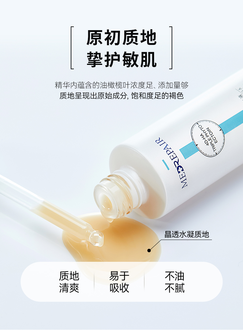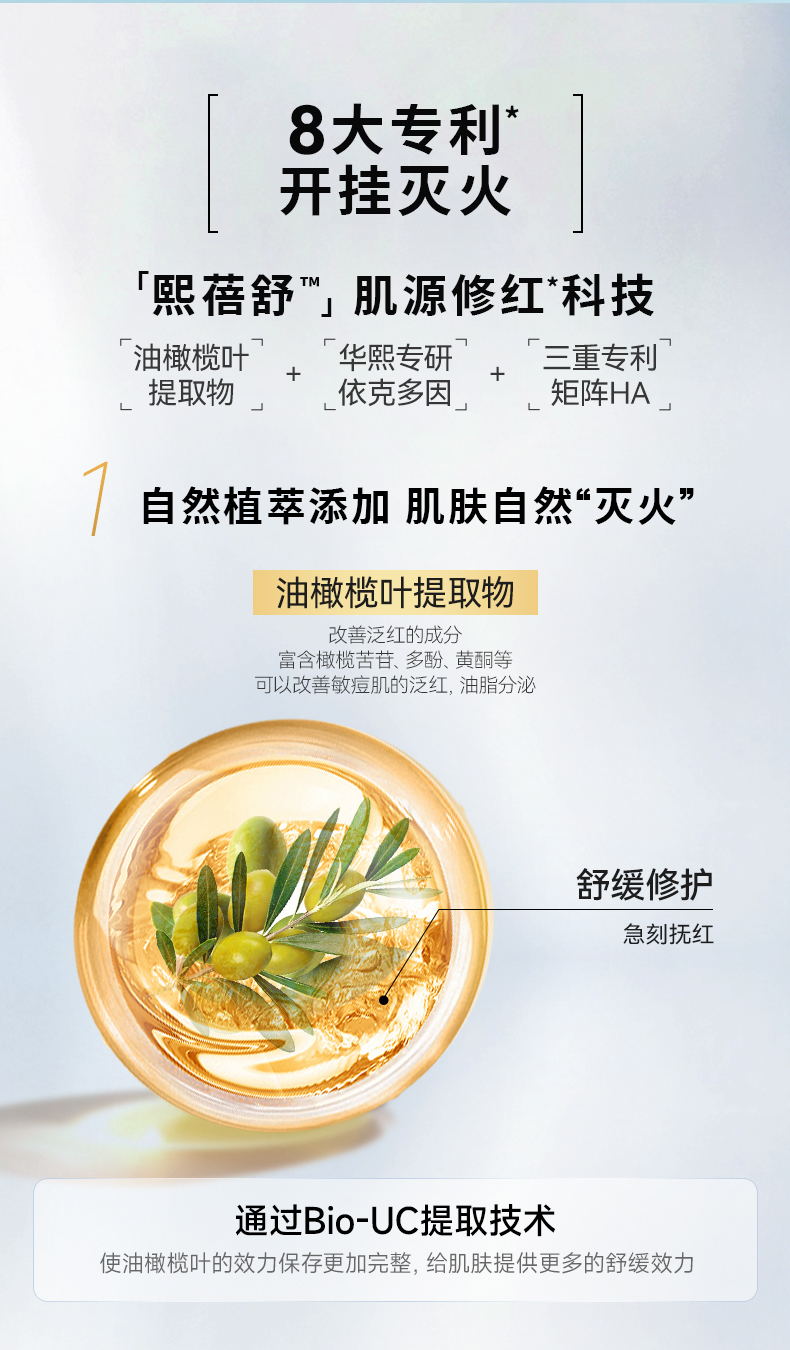 主要成分:油橄榄叶提取物、依克多因、矩阵HA、透明质酸钠、羧甲基脱乙酰壳多糖、燕麦活性成分、积雪草甙提取物、柑橘提取物、角鲨烷、甘油等