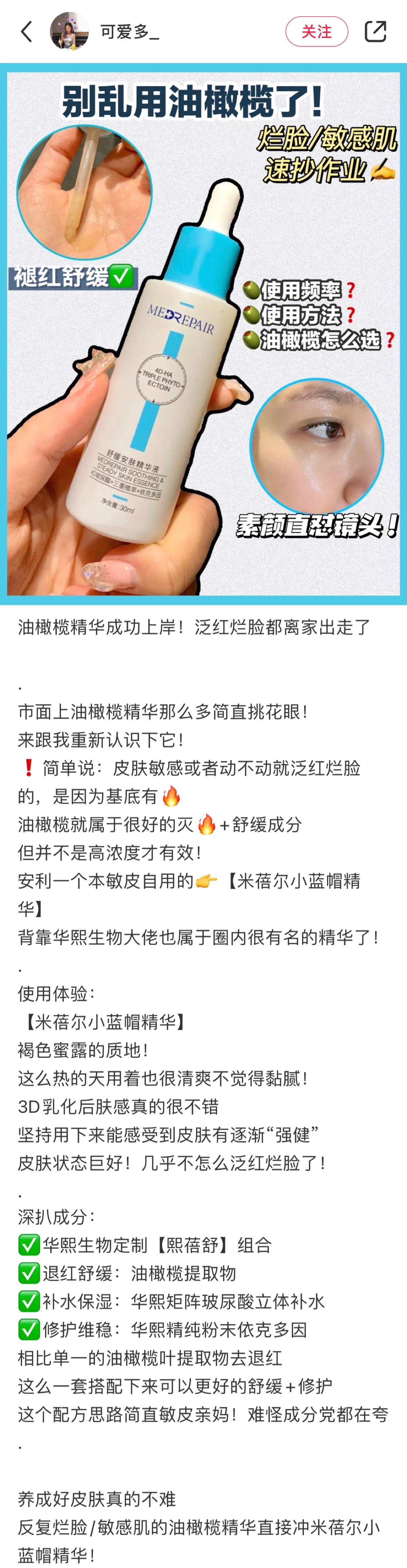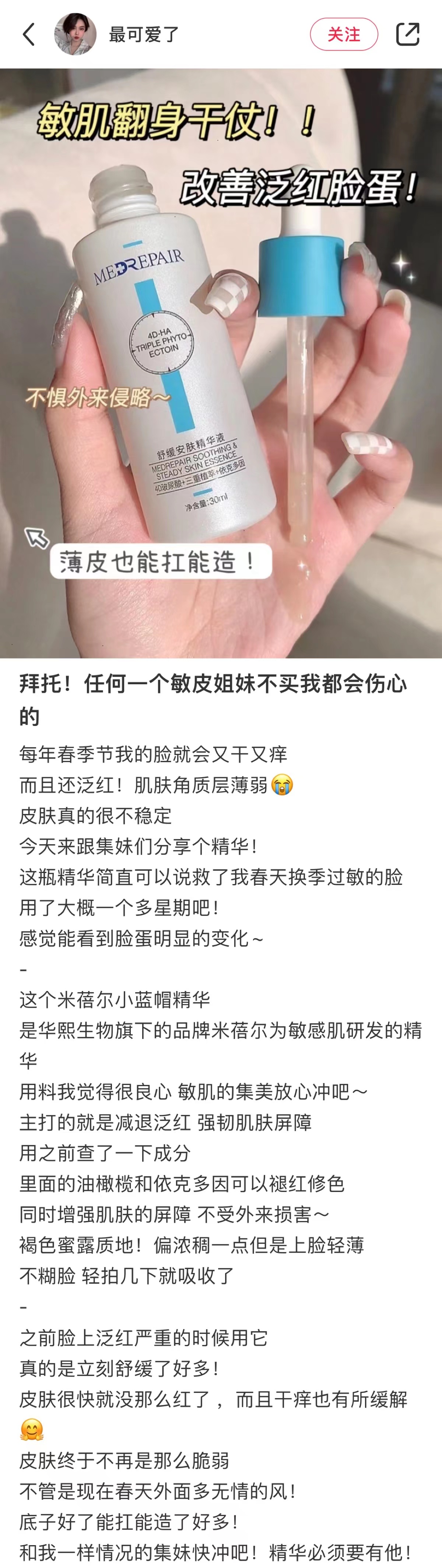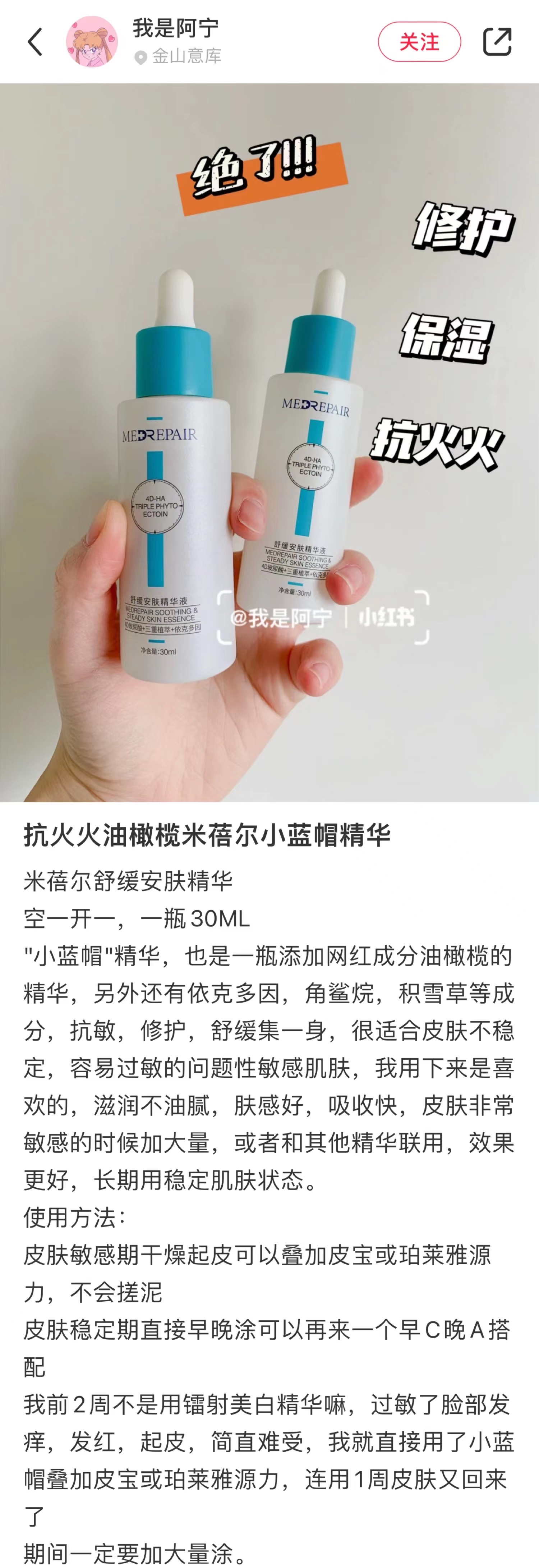 小蓝帽精华的大名是舒缓安肤精华液,是米蓓尔舒缓修护系列当下坠火的单品,这系列的产品包括氨基酸洁颜蜜、保湿舒缓水和玻尿酸修护霜,还有降燥面膜!里面都添加了华熙生物专研的专利4D玻尿酸成分及多种舒缓因子,来为huan解肌肤泛红提供长效保湿,让敏感肌和问题肌从清洁到保湿都能得到温和修护,恢复健康肌肤屏障,搭配上精华,可以一套用起来!