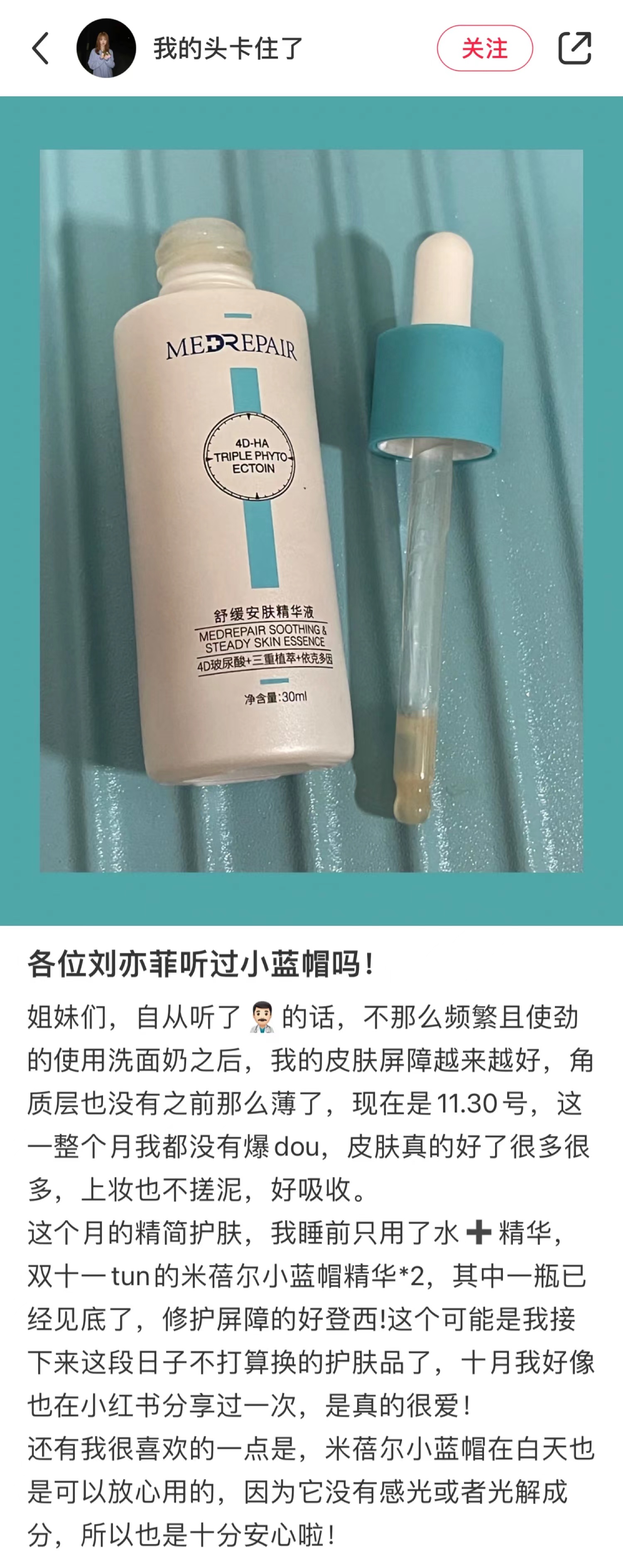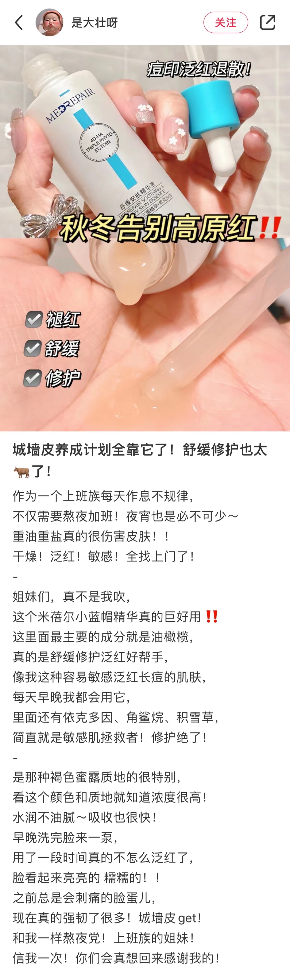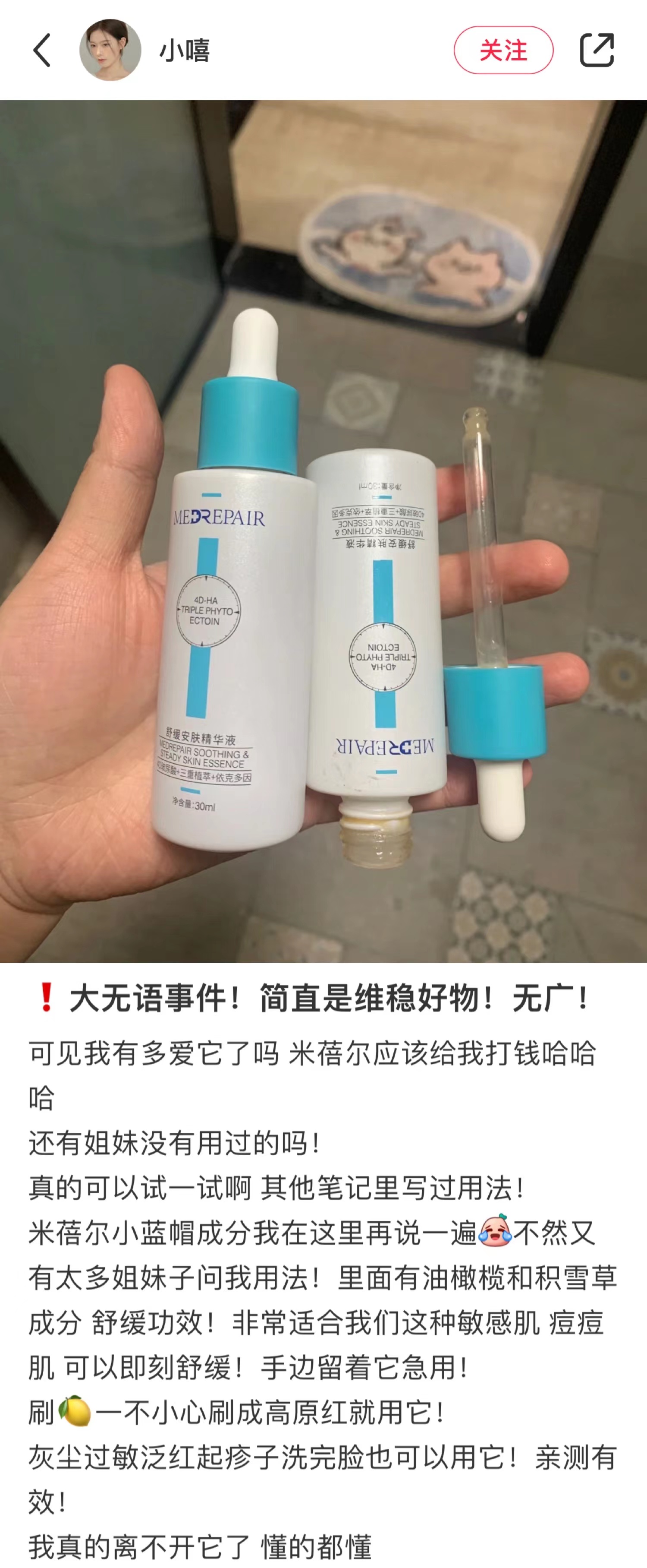 小蓝帽精华的大名是舒缓安肤精华液,是米蓓尔舒缓修护系列当下坠火的单品,这系列的产品包括氨基酸洁颜蜜、保湿舒缓水和玻尿酸修护霜,还有降燥面膜!里面都添加了华熙生物专研的专利4D玻尿酸成分及多种舒缓因子,来为huan解肌肤泛红提供长效保湿,让敏感肌和问题肌从清洁到保湿都能得到温和修护,恢复健康肌肤屏障,搭配上精华,可以一套用起来!