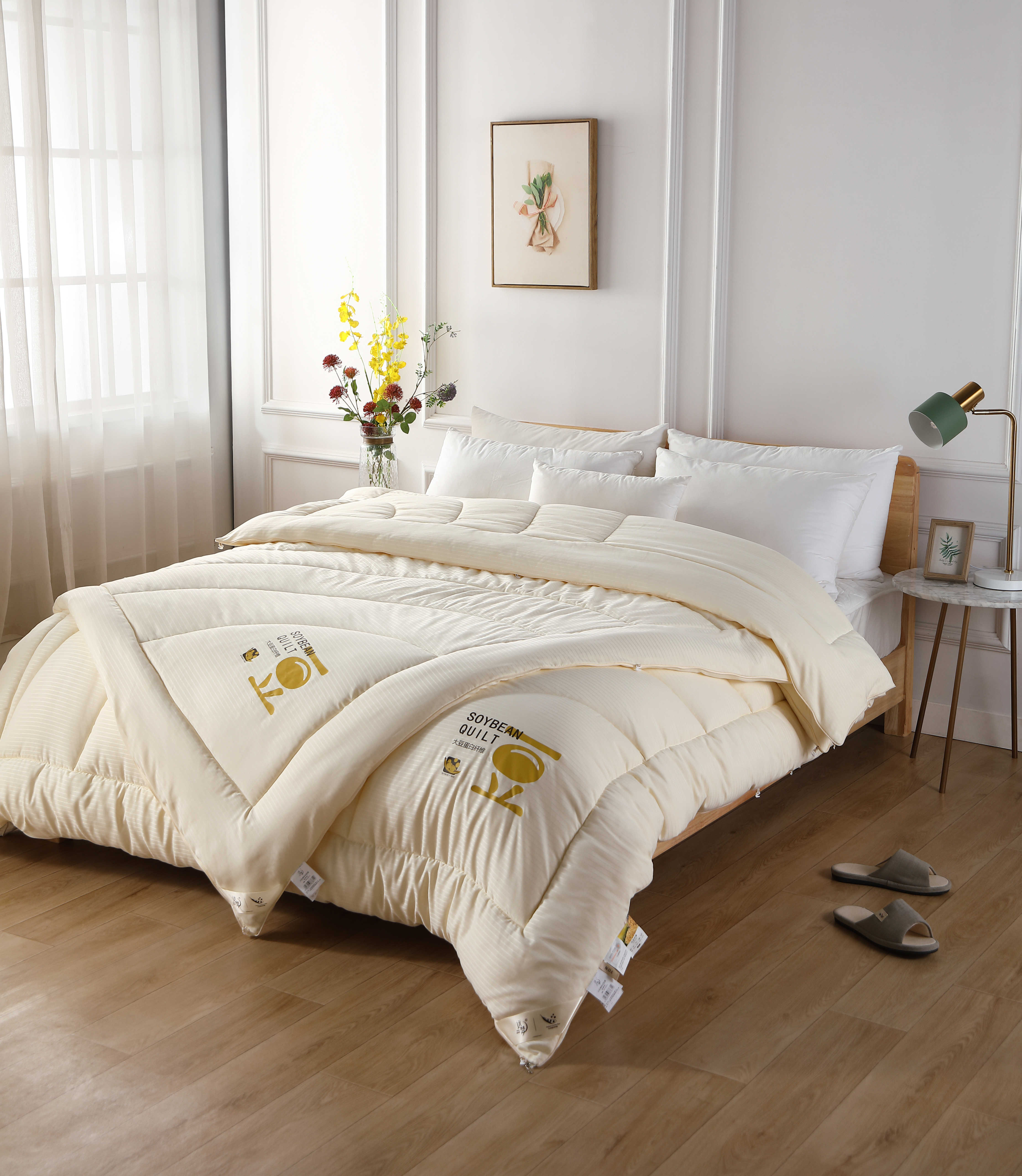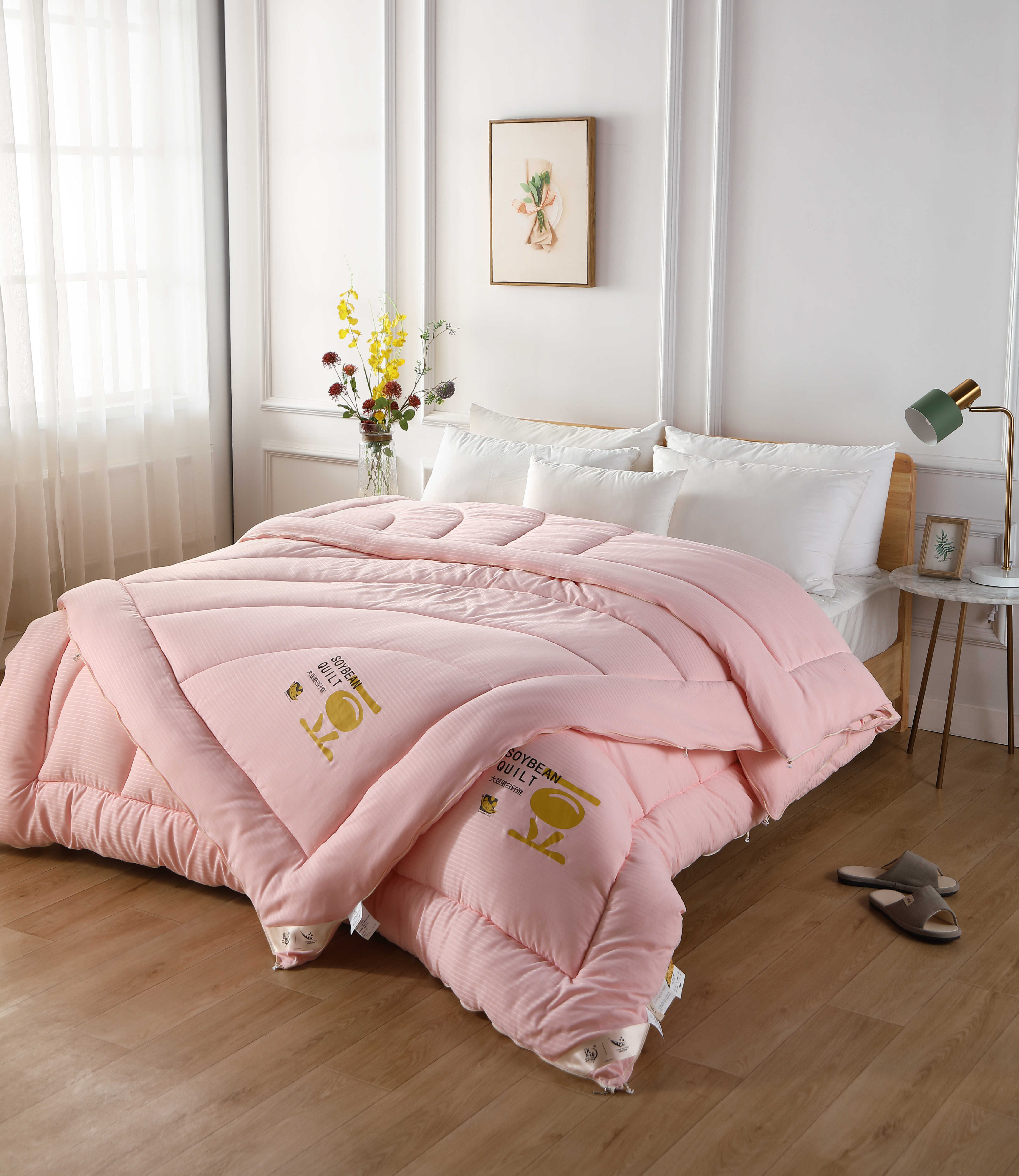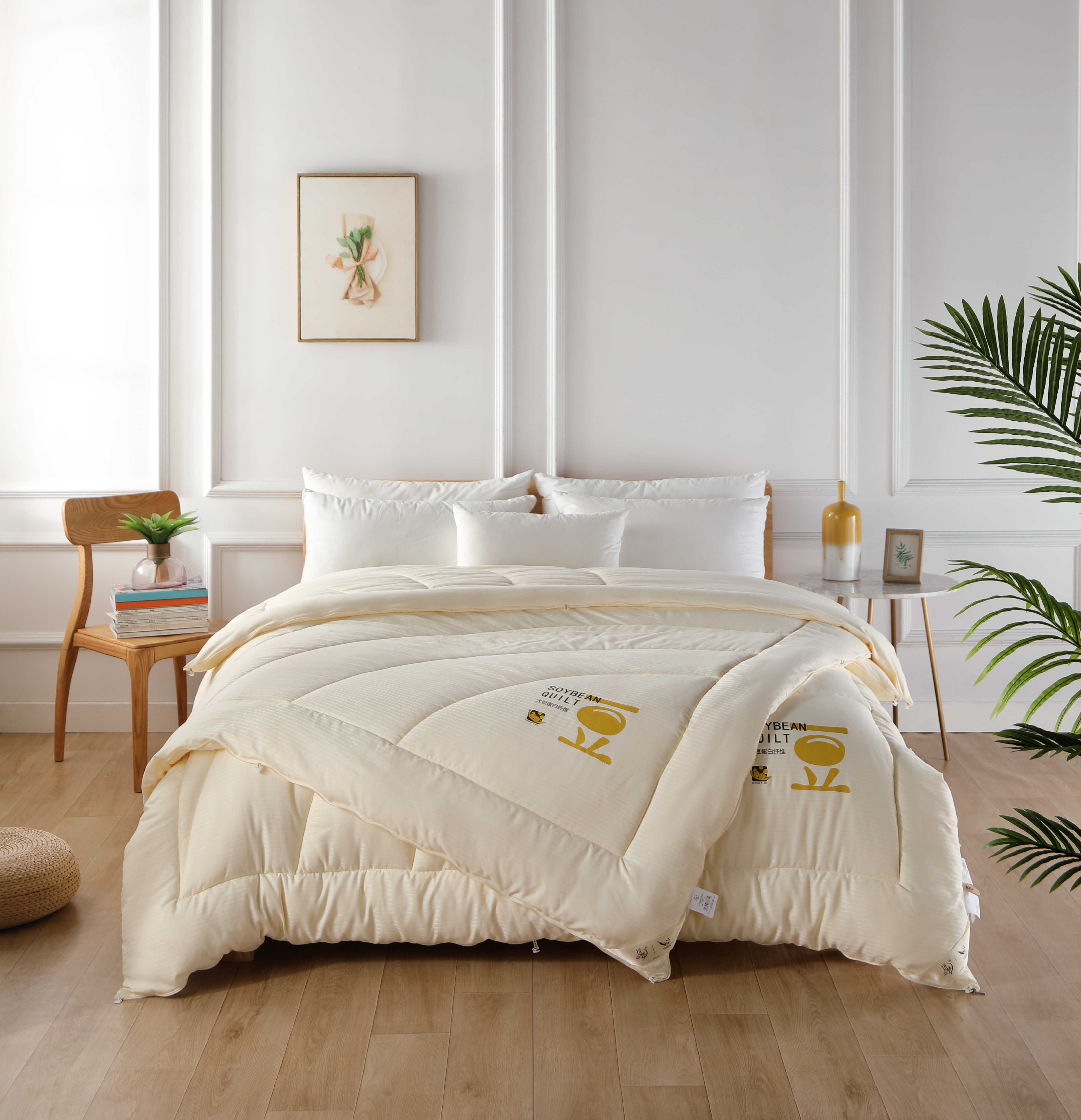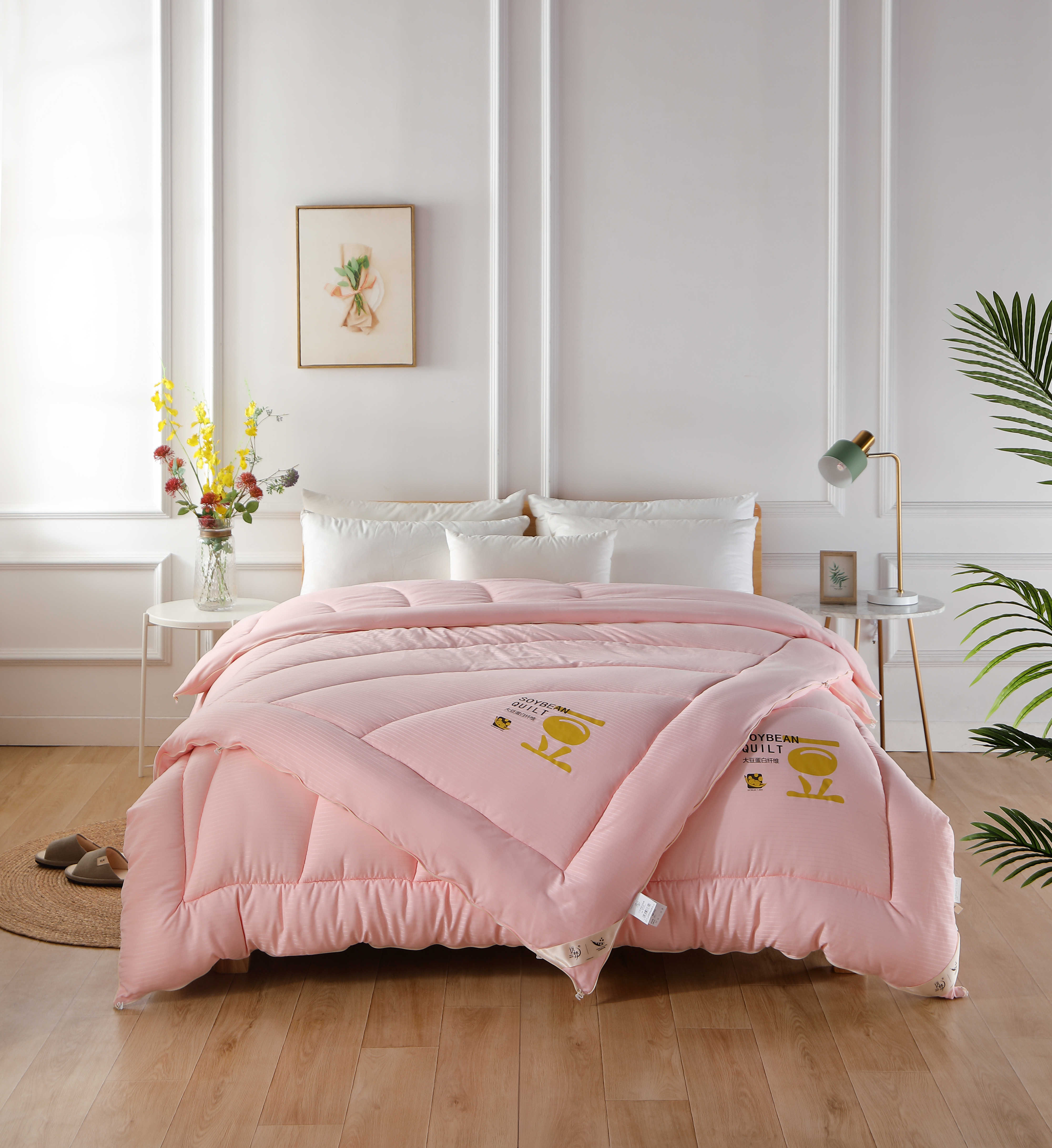 面料:100%聚酯纤维 填充物:21%改性聚乙烯醇纤维(大豆蛋白复合纤维)79%聚 酯纤维