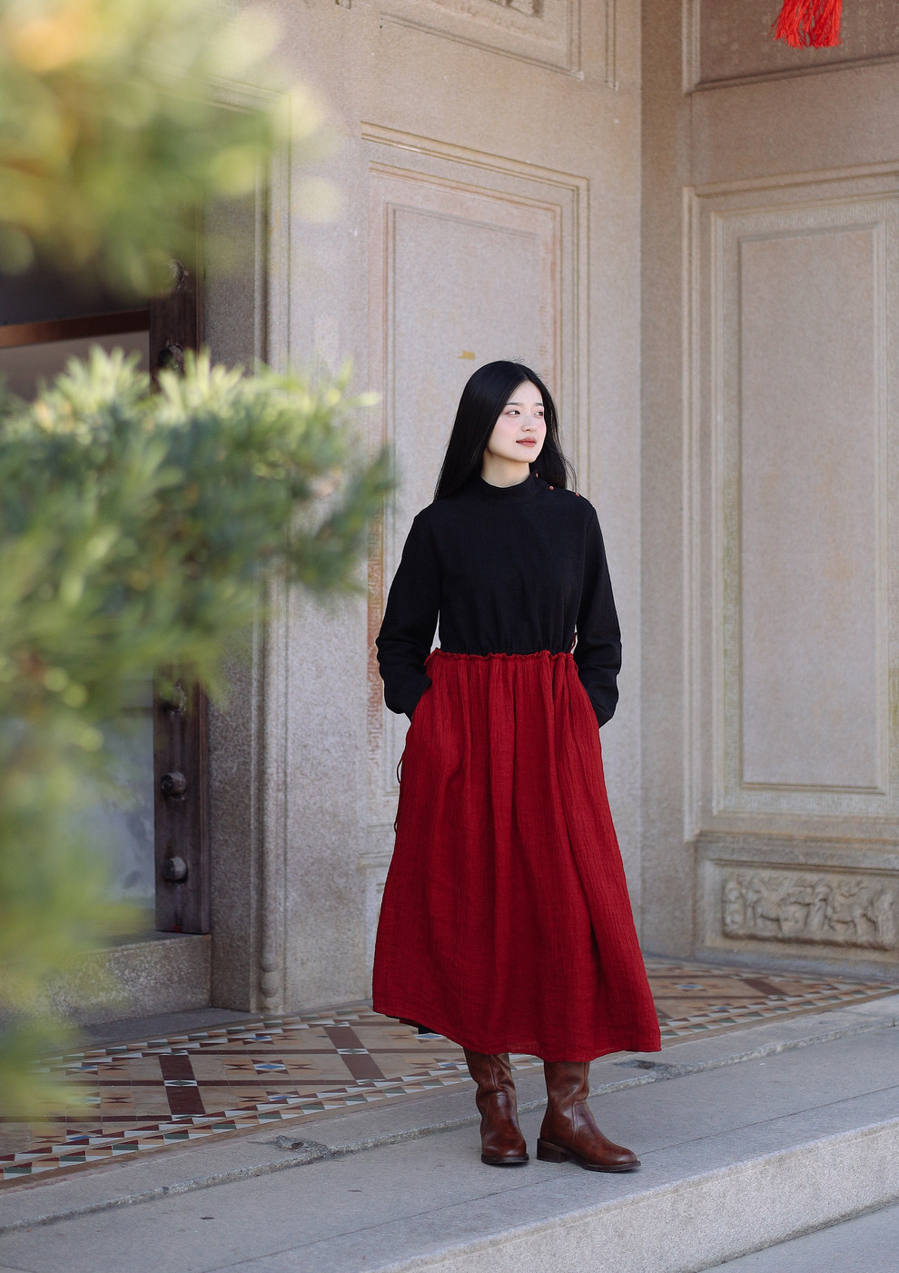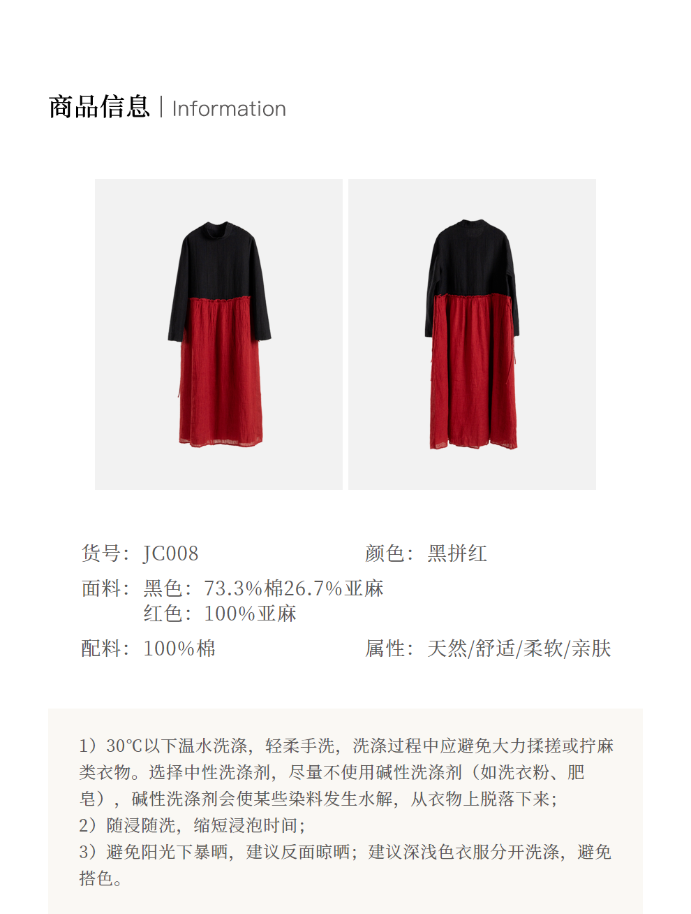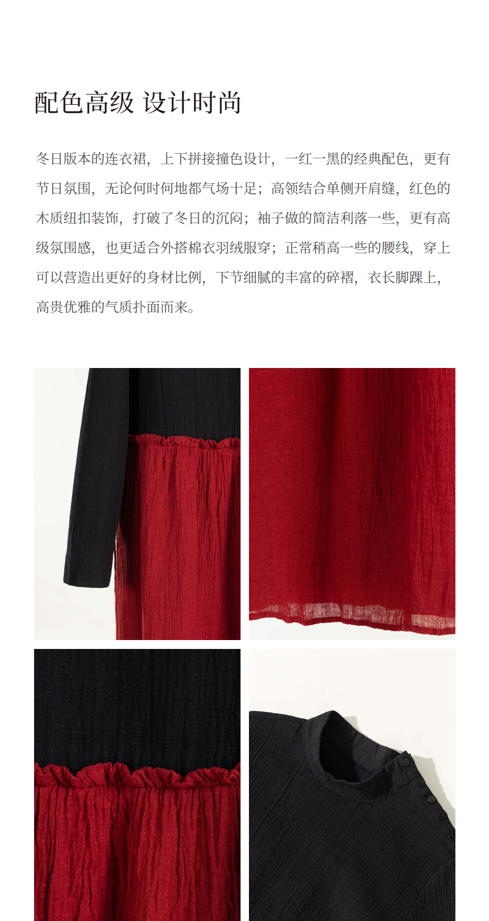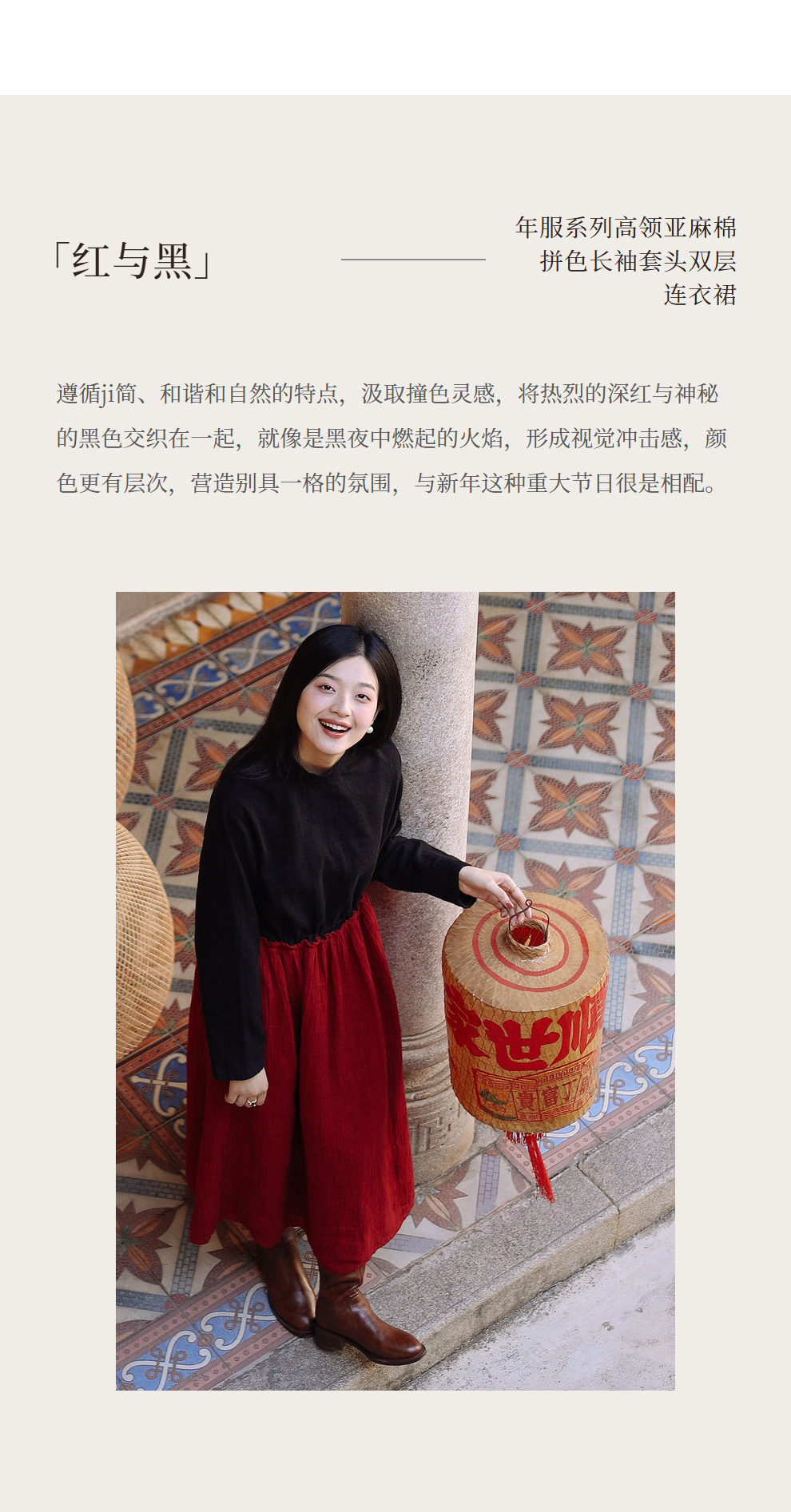 绽放008朵/【年服系列】高领亚麻棉黑红拼色双层宽松棉麻连衣裙