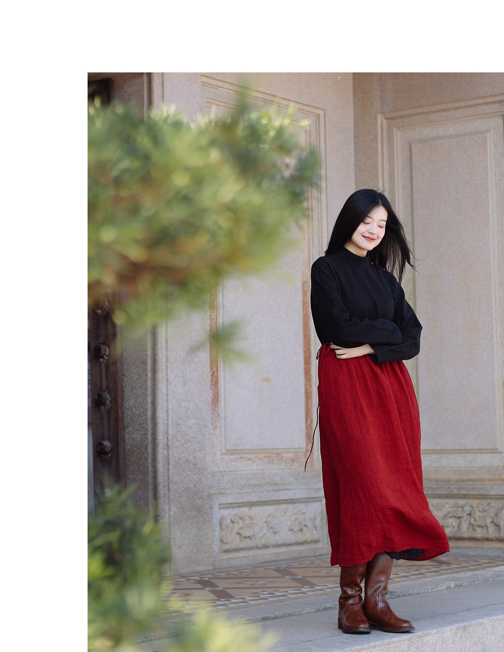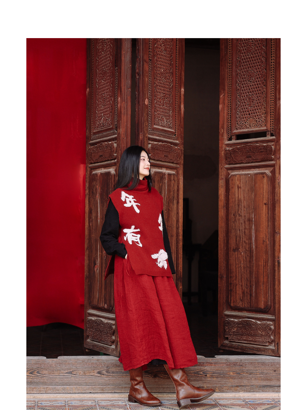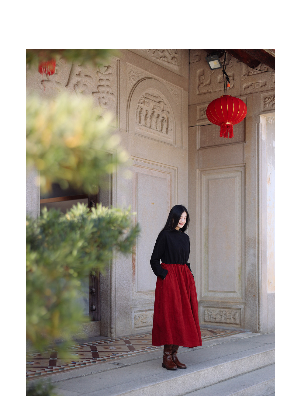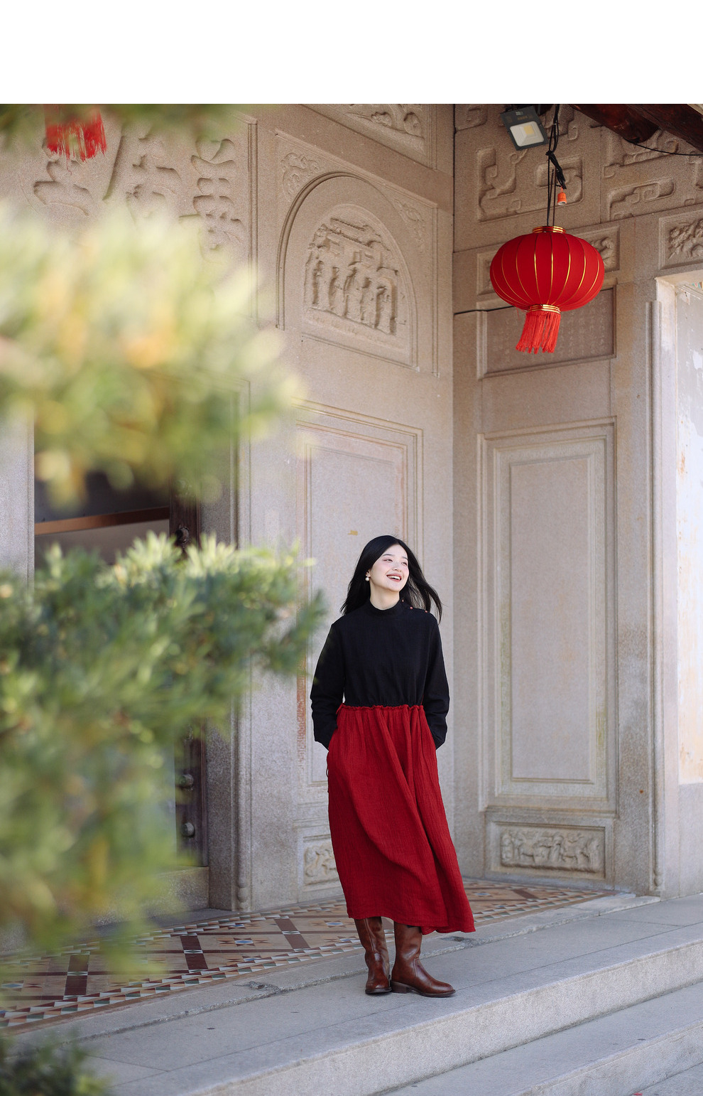 绽放008朵/【年服系列】高领亚麻棉黑红拼色双层宽松棉麻连衣裙