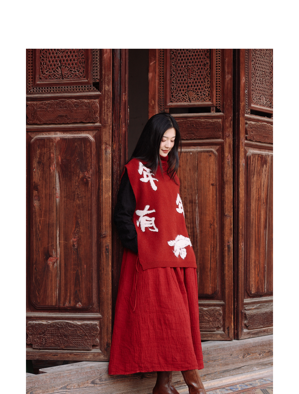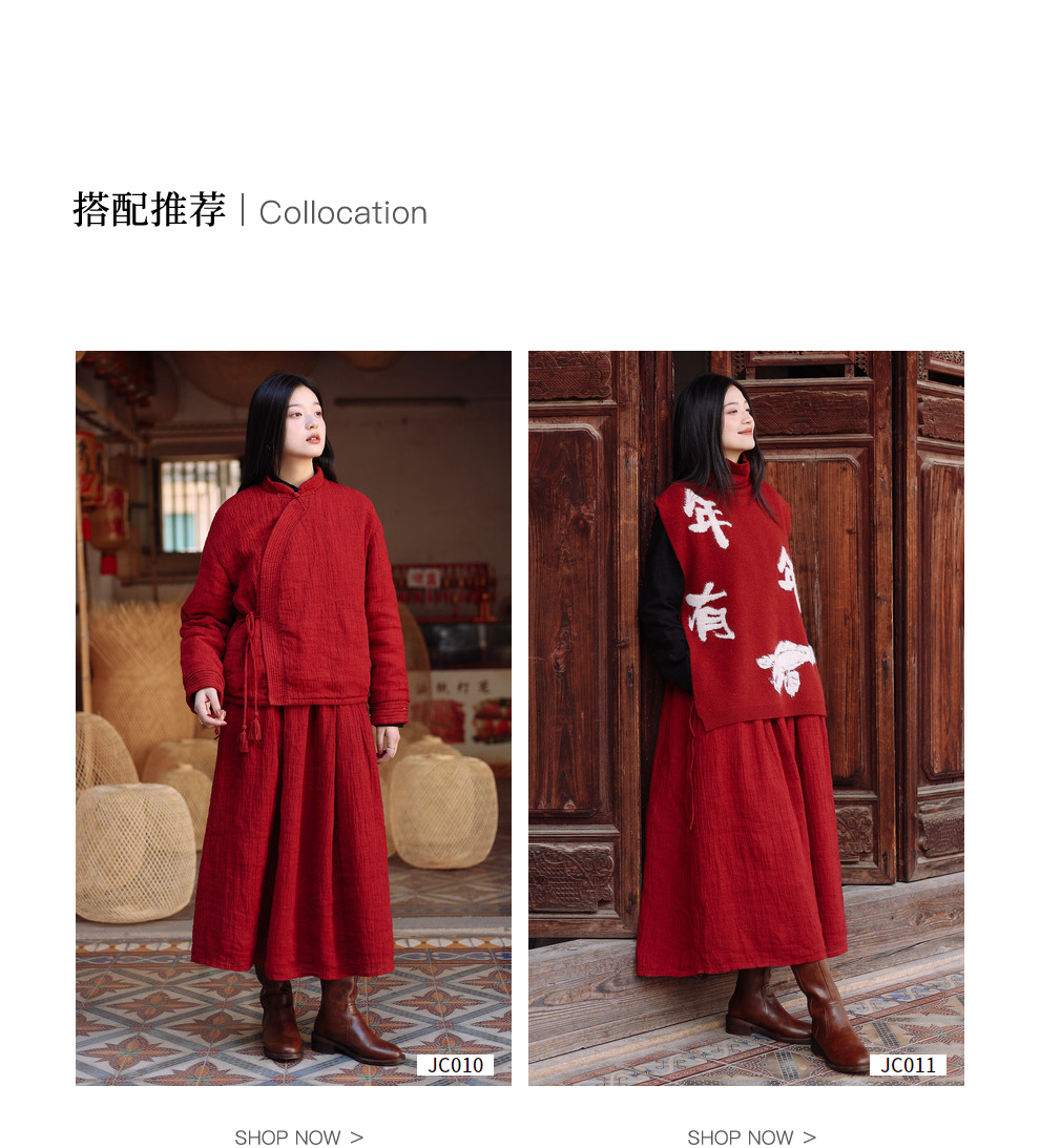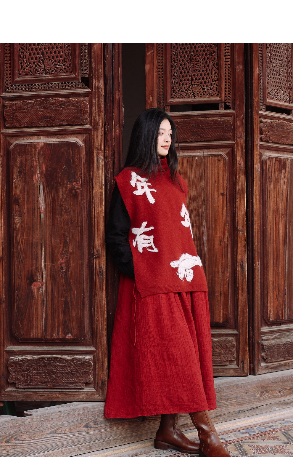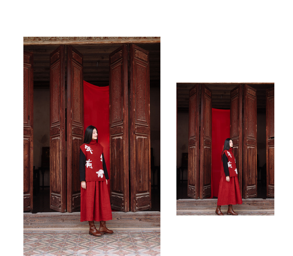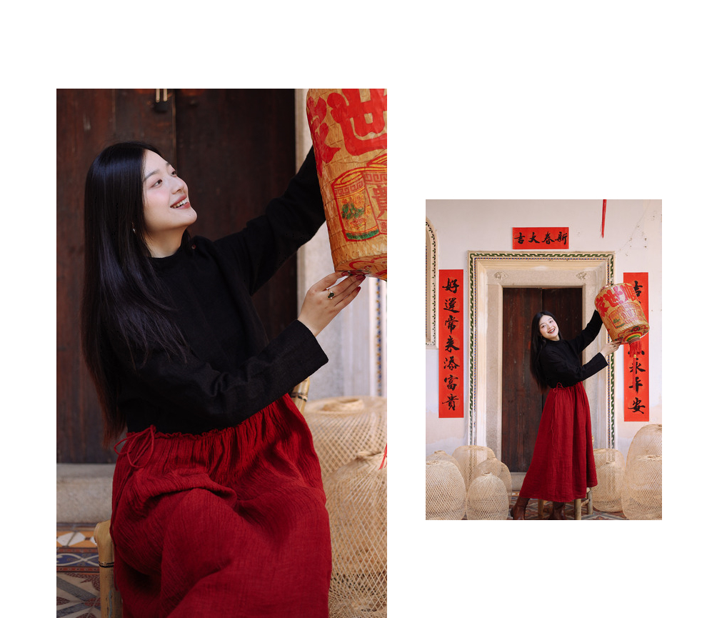绽放008朵/【年服系列】高领亚麻棉黑红拼色双层宽松棉麻连衣裙